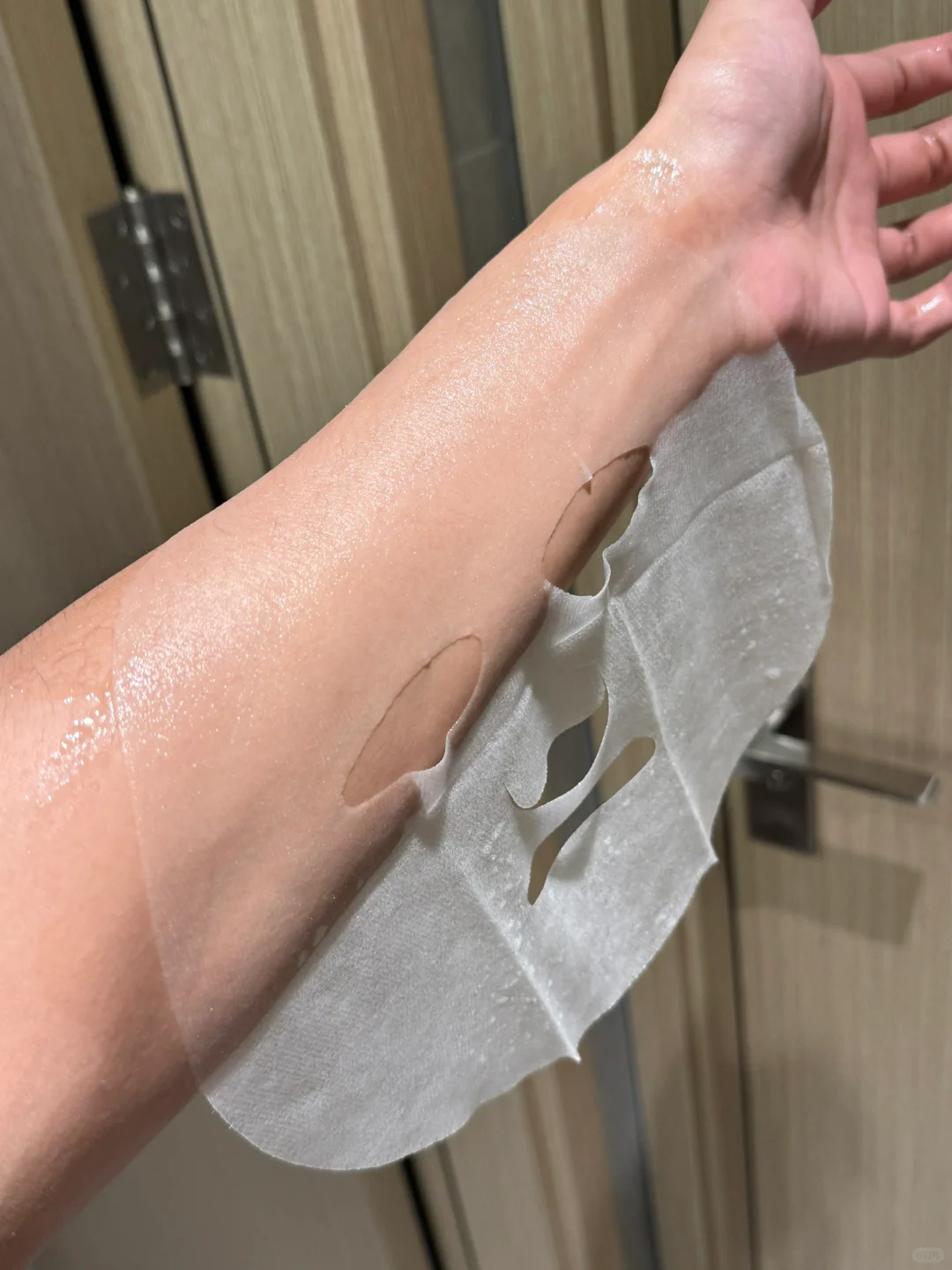 再配上它的这个膜布,上面满满的都是精华,上脸肤感也很绝,轻薄不黏腻,精华牢牢的扒在脸上!敷上一会儿,就能感觉到精华被皮肤吃进去了!