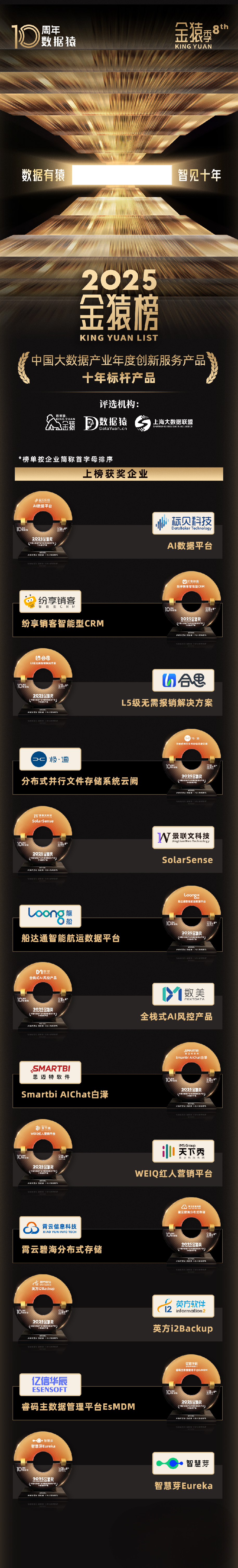 “第八届年度金猿季策划活动——《2025中国大数据产业年度创新服务产品「十年标杆产品」》榜单/奖项”由金猿组委会X数据猿X上海大数据联盟共同推出。