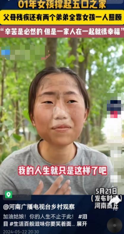 朱门酒肉臭,路有冻死骨!河南,00后女孩独自养活一家5口!父亲瘫痪在床10年、母亲腿脚残疾,她靠捡垃圾养活两个弟弟,面对镜头她苦笑着说:“我的人生就这样了吧,我情愿牺牲我自己......” 小家庭中,有一位年轻女孩,名叫莉莉(化名),她的脸上洋溢着坚韧与纯真的笑容,背负着重如山的责任。 23岁,这个年纪的女孩往往还在大学校园里漫步,在追求爱情、友谊以及职业理想的道路上奔跑,而莉莉的人生轨迹却因为她所肩负的家庭重任发生了剧变。 一场突如其来的疾病让她的父亲身体垮塌,从此丧失了劳动能力;母亲因为先天性的肢体残疾,一直以来都无法从事稳定的工作。这样的变故使莉莉一夜之间成为了一户人家的支柱。 每个黎明破晓之际,当太阳的第一缕光线穿过窗棂,照耀进狭小而温馨的家时,莉莉已经开始了她那繁重的一天。 她轻手轻脚地走进父母的卧室,小心翼翼地帮父亲翻动身子,擦拭身躯,每一个细微的动作都饱含着对亲人们的深深关切与无怨无悔的付出。 经济的压力犹如一座大山压在莉莉肩头。家中唯一能换钱的东西是一辆三轮车,曾是他们全家赖以生存的重要工具。 无奈之下,莉莉做出了痛苦的决定,将其卖去换取父亲昂贵的医疗费用。每一次的割舍都在无声地诉说着她对美好生活的执着向往与坚定信念。 每日劳累之余,莉莉还要拖着疲惫的身体穿梭于城市的大街小巷,用勤劳的双手搜集废纸、塑料瓶等物品,换取些许的生活开支。 尽管如此辛苦,她从未放弃过希望,始终保持着顽强的生命力,不断挑战体力的极限。 莉莉明白知识就是力量,教育则是摆脱贫困的最佳途径。 于是乎,她毫不犹豫地把有限的家庭资源倾注到了两个尚且懵懂无知的小弟身上,供他们上学并确保他们的基本生活所需。 而对于自己那份深藏心底的求学渴望,那个曾经的梦想成为一名教师的心愿,此刻却只能黯然搁浅,变成一个遥不可及却又永远铭记心头的愿望:“想都只能暂时搁置。” 这个家庭的困境引起了当地政府有关部门的重视,他们给予小女孩一家帮助,免除了弟弟们的学费和生活费。而社会上的网友们也纷纷伸出援助之手。 即使生活的艰辛将她压弯,小女孩的脸上始终洋溢着对家人的坚定眼神。就像一束光照亮黑暗的地方,她用坚韧的精神鼓舞着周围的人。 在她的教育下,弟弟们也显现出了超越年龄的成熟和懂事。家中的照顾越来越多地落在他们的肩上,但他们却从未埋怨过。 当弟弟对着镜头说出“希望姐姐能早点嫁人,离开这个家”的祝福时,我们看到了他们对姐姐的深深爱意和感激。这份家族之间的亲情让人感动。 虽然面对这样的生活,小女孩从未有过悔意。她坚信,努力总会有回报,黑暗的隧道终将迎来破晓,只要坚持前行。 愿小女孩及她的家人早日走出困境,迎接生活中的美好。 她的坚韧、弟弟们的懂事,以及这个家庭成员间无私的深厚情感,将永远激励着我们勇敢面对生活的挑战,珍惜身边的亲情和爱意。 信息来源:河南广播电视台乡村观察2024-05-22《加油姑娘!你的人生不止于此!》