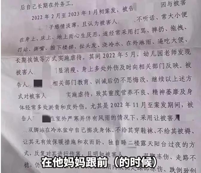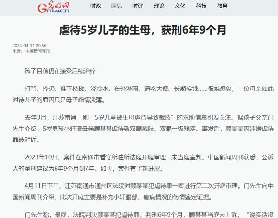 简直是枉为人母!”江苏南通,一女子趁丈夫在外务工时,长期采用打骂、摔扔、浇冷水、在外淋雨、逼吃大便、长期挨饿等方式,虐待5岁亲生儿子,最终导致其双腿截肢,眼睛近乎失明,最终法院认定女子构成虐待罪,判处有期徒刑6年9个月! 寒冬中的南通,这个江南水乡城市笼罩在冰冷刺骨的气息之中,此时发生了一起令整个社会震惊的人伦悲剧。 一名叫做小轩的男童,在这样的冬季里遭遇了超越常人承受极限的虐待,事件之残酷令人痛心疾首。 小轩的母亲,顾某,本是土生土长的南通女子,却因一段飘泊的情感际遇,与其来自安徽的丈夫——门先生相识相恋,并在当地成家立业,小轩便是他们爱情结晶的象征。 然而这段婚姻并没能经受住现实生活的考验,不久后便分崩离析。 年幼的小轩被迫离开熟悉的南通故土,远赴千里之外的安徽农村,与他慈祥的爷爷奶奶共同生活,度过了自己人生最初的五个春秋。 然而命运弄人,当五岁的小轩重新回到亲生母亲顾某身边时,等待他的并非久别重逢后的母爱关怀,而是无边无际的黑暗深渊。 顾某似乎对眼前的儿子充满怨念和冷酷,仿佛所有的愤怒和失望都倾泻在这个无辜的孩子身上。 她不仅用暴力手段对他进行身体惩罚,还将人格侮辱揉入所谓的“教育”,使得小小年纪的小轩饱尝人间疾苦;更甚者,她在冬日严寒之际剥夺了孩子应有的保暖衣物和充足的食物供给,这种赤裸裸的生命漠视与无情对待,使小轩的生活处境堪比炼狱,其受虐经历实在让人愤慨至极,忍不住惊呼:这番遭遇,经历简直让人发指! 冬天的寒夜中,顾某竟然让小轩在露天阳台上睡觉,不管是浇冷水、逼食粪便,还是让孩子承受极端天气的折磨,所有这些行为都已经超出了一个正常母亲的范畴。 直到有一天,门先生接到了顾某打来的电话,得知小轩因摔伤不能行走。赶回家的他看到了小轩黑紫的双腿,顿时大惊失色。 医生的检查也证实了小轩身上的伤害,双眼完全失明,双腿严重残废,精神也遭受二级残疾的折磨,他需要截肢才能维持生活。 门先生找到警方并将顾某告至法庭,最终,顾某被判了虐待罪,被判刑近7年。 这个事件社会各处的反响,我们应该认识到对待孩子的态度不止是一种责任,更是一种道德和人类基本原则。 我们不能让像顾某这样的凶手伤害更多无辜的孩子,应坚决维护儿童权益,尽一切可能去预防类似悲剧的再次发生。 看完这个故事,不仅令人叹息,原来世界上真的有不会爱人的妈妈,我们坚决要地址这位妈妈的做法,要用心的去爱自己的孩子。 世界上表达爱的方式也许不同,但是我们不能以爱之名做伤害孩子的事情。我们都说:世上只有妈妈好。真正的希望所有的孩子都能够得到属于自己的真正的爱。 信息来源:《江苏男童被生母虐待”案一审宣判:生母获刑六年九个月》