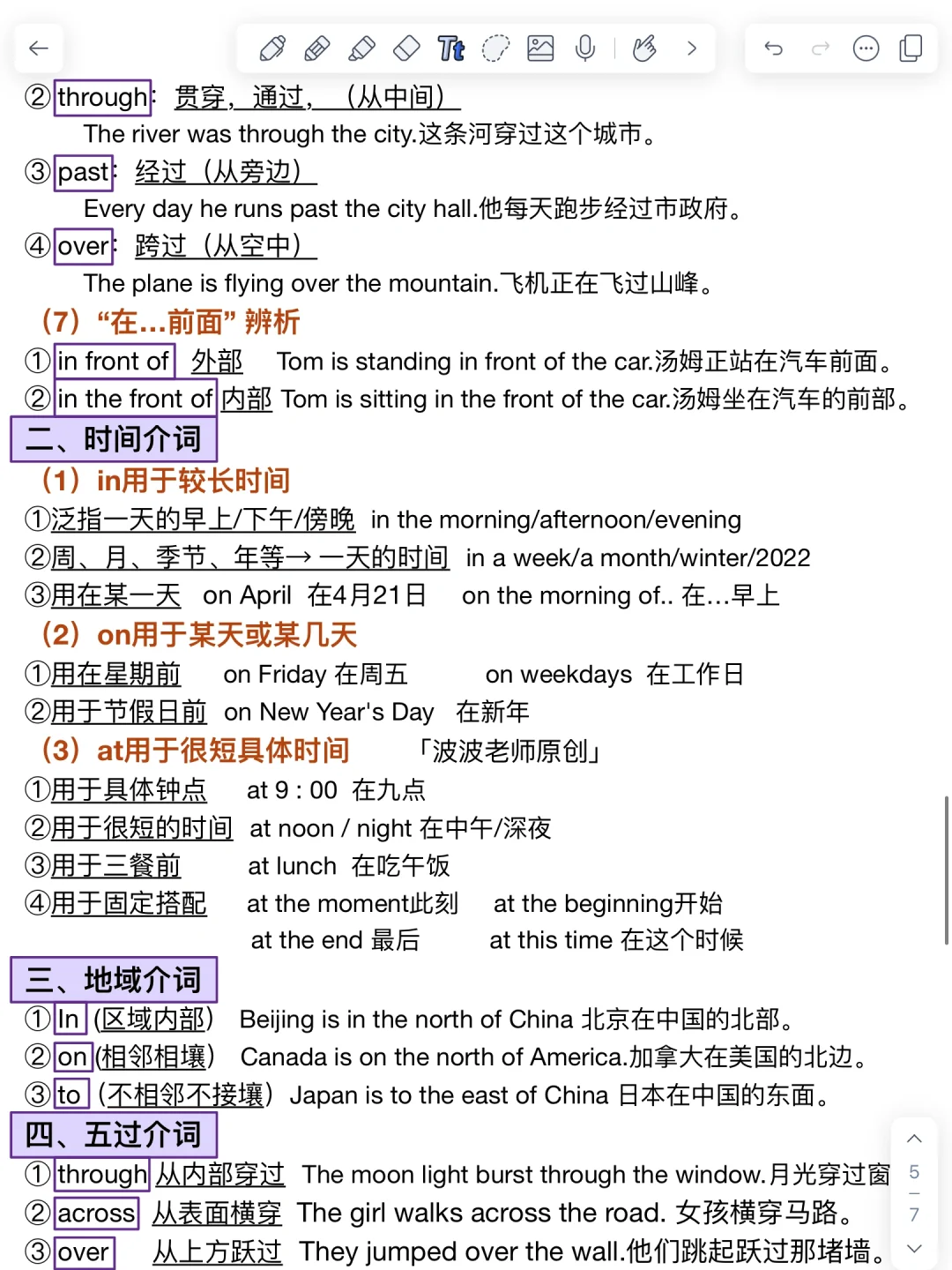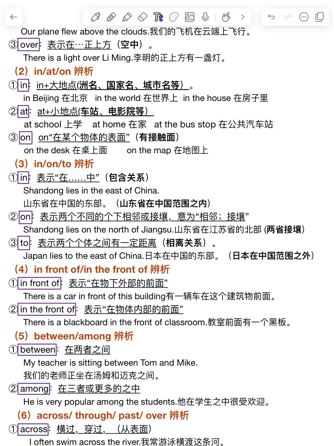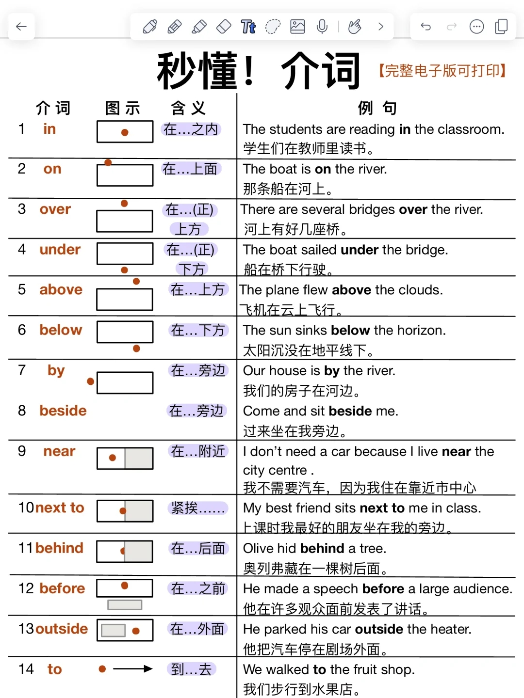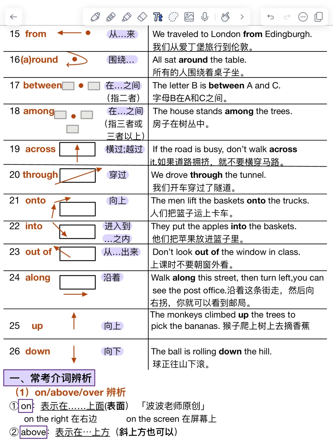 ②above:表示在⋯上方(斜上方也可以)Our plane flew above the clouds.我们的飞机在云端上飞行。