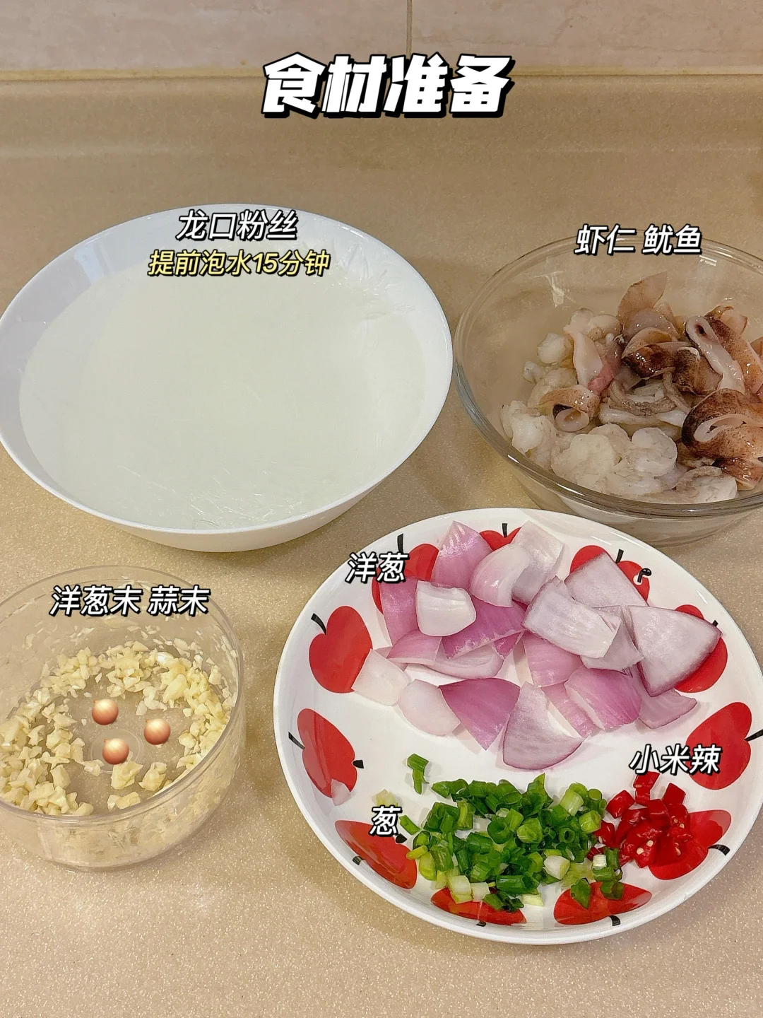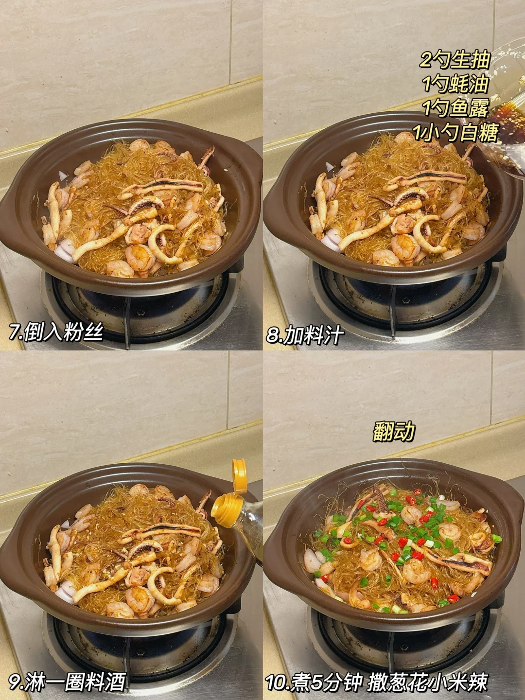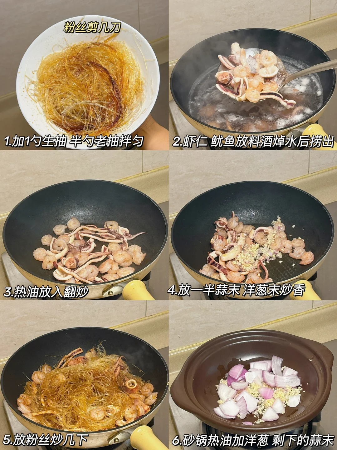 每次去餐厅都会点上一份粉丝煲,今天在家复刻一份,简单又美味~ . 🦞海鲜粉丝煲 食材准备:龙口粉丝 虾仁 鱿鱼 洋葱 蒜 葱 小米辣 料汁准备:两勺生抽,一勺蚝油,一勺鱼露,一小勺白糖[一R]龙口粉丝泡水15分钟,用剪刀剪散,加一勺生抽半勺老抽拌匀 [二R]虾仁,鱿鱼加料酒焯熟备用,起锅烧油,下入虾和鱿鱼,再加蒜末和洋葱末爆香 [三R]加入粉丝翻炒,砂锅中铺蒜末和洋葱,加入粉丝和料汁淋一圈料酒,煲5分钟撒上葱花小米辣即可