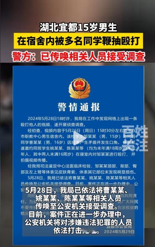湖北宜都,一名15岁的男生,在宿舍被同学用皮鞭抽打。男生的后背打的血淋淋的。可这名男生也仅仅只有15岁呀。施暴的三人有一名年满16周岁,但其他两名施暴者未年满16周岁。三人被警方依法传唤了,案件正在进一步侦办中。 校园暴力,这个话题一直是一个社会的巨大问题。近来,网络上又出现了一则则令人痛心的校园暴力新闻,引发社会广泛热议。 一个15岁的男孩本应该是无忧无虑的生活,但是却收到了同龄人的欺负。 15岁的小明(化名)本应在校园里享受快乐的学习时光,追逐理想梦想,却因为与同班同学小李(化名)发生口角,遭到了对方及其两名朋友的毒打。 事情是这样发生的:课间休息时,小明和小李因为一点小事争执不下,双方心有余怨。下课后,小李叫来两名好友,三人蓄意在宿舍里围殴小明。 面对几个人的暴行,小明完全不是对手,他惨叫连连,浑身是伤,却无力反抗。 更加令人发指的是,这些施暴者居然还拿手机将自己犯罪的一幕全程记录下来。视频中可以清楚听到小明痛苦的叫喊声,看到他遍体鳞伤的惨状,让人触目惊心。这种残暴行径,完全想象不到是同龄学生所为 有网友直言:"现在的未成年人简直无法无天,国家应当加快修订未成年人保护法。"也有网友提出不同意见。 校园暴力的背后,是被害者的委屈和施暴者的猖狂。校园暴力这个事件应该完全消失在我们的身边。 家长更应该多关注自己的孩子。无论是施暴者还是受害者,我们应当从他们的日常行为中积极发现存在的问题并且引导孩子如何改正。更要给孩子树立正确的价值观,我们应该把坏种子扼杀在摇篮里面。 与此同时,学校的教育管理工作同样十分重要。 学校应当制定完善的校纪校规,加强对学生的日常管理,开展心理健康教育,及时发现和解决学生的心理问题,从根源上预防校园暴力的产生。 只有家校共育,我们的孩子才能成为一个正直善良的年轻人。 校园暴力问题已经引起了社会的广泛关注,各界呼吁必须从根源上加以严惩和预防。 这不仅需要完善法律法规,而且更需要全社会共同参与,加强家庭教育和学校教育,培养青少年树立正确的价值观念,远离暴力,维护和谐校园。 我们,作为一个有判断力的成年人,应当为自己的行为负责。而对于没有形成自己的价值观的未成年人,我们就是他们的镜子,应当更加的严格要求自己。 只有携手并进、众志成城,我们才能杜绝校园暴力,为孩子们创造一个安全、和谐的成长环境。让我们行动起来,共同捍卫美好校园! 信息来源:百姓关注2024-5-29——湖北宜都15岁男生在宿舍内被多名同学鞭抽殴打,警方:已传唤相关人员接受调查