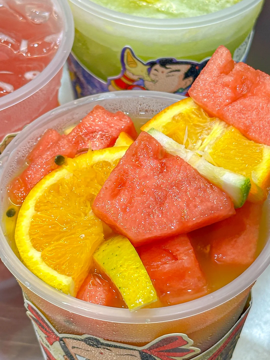 一桶近1000ML容量!!里面有西瓜、芒果、橙子、柠檬、百香果等水果!