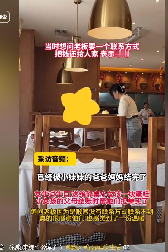 泪目了!内蒙古一女子在餐厅过生日,一陌生小女孩非吵着要吃蛋糕!女子很大方,切了一块给她,谁料,女子在买单时却惊呆了! 生活的路上,我们总会遇到一些让人心生暖意的小事,这些看似微不足道的瞬间,却能给我们带来勇气和希望,让我们感受到生命中那份纯粹而美好的力量。今天,就让我们一起来分享一个发生在淳子身上的温馨故事。 淳子是今天的主角,故事发生在她的破壳日。餐桌上摆着一个精致可爱的小猪蛋糕,粉色的奶油裱花在蜡烛的映衬下闪耀着温暖的光芒。朋友们边品尝着美食,边开怀畅谈,整个餐厅洋溢着欢乐的气氛。 就在此时,女生看见旁边有一个漂亮的小妹妹正在盯着她的蛋糕。小女孩天真可爱的模样真的是令人欢喜。接着,小女孩就央求妈妈自己想吃那个蛋糕。 淳子看见小女孩和妈妈的对话,心都快化了,于是,主动切下一块小蛋糕给小女孩吃。小女孩开心得合不拢嘴,她的妈妈则感激万分,连连说着谢谢。 谁也没想到,这个善意的小举动却成了整个故事的开端。当女生准备买单时,老板出人意料地告诉她,她们这桌的账单已经被隔壁那家人结清了!原来是遇到同样善良的人,他们为了回报她,便主动把淳子一行人的钱给结了,算是送给淳子的一份特殊生日礼物。 淳子当时被这份陌生而温暖的善意深深感动了,急切想要当面表达谢意。到那时那家人已经离开餐厅,没有办法再联系上。 为了不让这份温暖的力量就此消失,淳子将这件事分享到了网上,立刻引起广泛关注。网友们纷纷表示,善良的人遇到了善良的人,这样的暖心场景让人太感动了。有人说,世界因为有这样的善意而变得更加温馨。 更有网友们自发讲述起自己亲身经历的暖心瞬间。这些评论都在诉说着同样的事实:生活中到处存在着这样能温暖人心的小事。一个微小的善意,一个友善的举动,都可能成为他人生命中难忘的温暖瞬间。而当我们把这些温暖串联在一起时,整个世界都将变得更加美好。 对于淳子来说,这无疑是一个很不平凡的生日体验。她通过自己的善举,不仅收获了一家人的大方回赠,更重要的是感受到了这个世界的温暖与希望。而小女孩和她的家人,则用知恩图报的品德,完美诠释了什么叫做"以德报德"。 一个不差钱,一个不差情。在茫茫人海中,善良与善良偶然相遇,温暖了彼此的心灵。这就是生活中最美好的一刻,让我们学会欣赏身边的点点滴滴,感受生活本身就是一种馈赠。 世界上的温暖因这样一个个小故事而延续,爱心因此而传承。让我们一同努力,用包容和善意去温暖更多的人吧!也许下一个受益的人,就是你我身边的亲朋好友。 我们希望这样的暖心故事能够被更多的人看到,激发更多的善行,传播更多的爱。因为在这个世界上,每一个微小的善意,都有可能成为别人生活中的一道光。让我们一起,用善良和爱,点亮这个世界,让每一个角落都充满温暖和希望。 未来,当你遇到需要帮助的人时,也许你就是他人生命中的那一束光。当你选择主动作出友善的举动时,也许你就成为了别人难忘的温暖瞬间。让我们共同在生活中去实践这份善意吧,把温暖的力量一点一滴地传递下去。 相信只要人人都献出一份爱,这个世界定将变得更加美好。让我们携手共建一个充满善意与温情的社会,在这里,每一个人都能被温暖所包裹,所有的生命都能被爱所滋养。从你我做起,用爱与善意温暖整个世界,共同开创一个更加和谐美好的明天! 信息来源:南阳网:2024年5月1日《用温暖和善良对待别人,同样感受到了这份暖意》