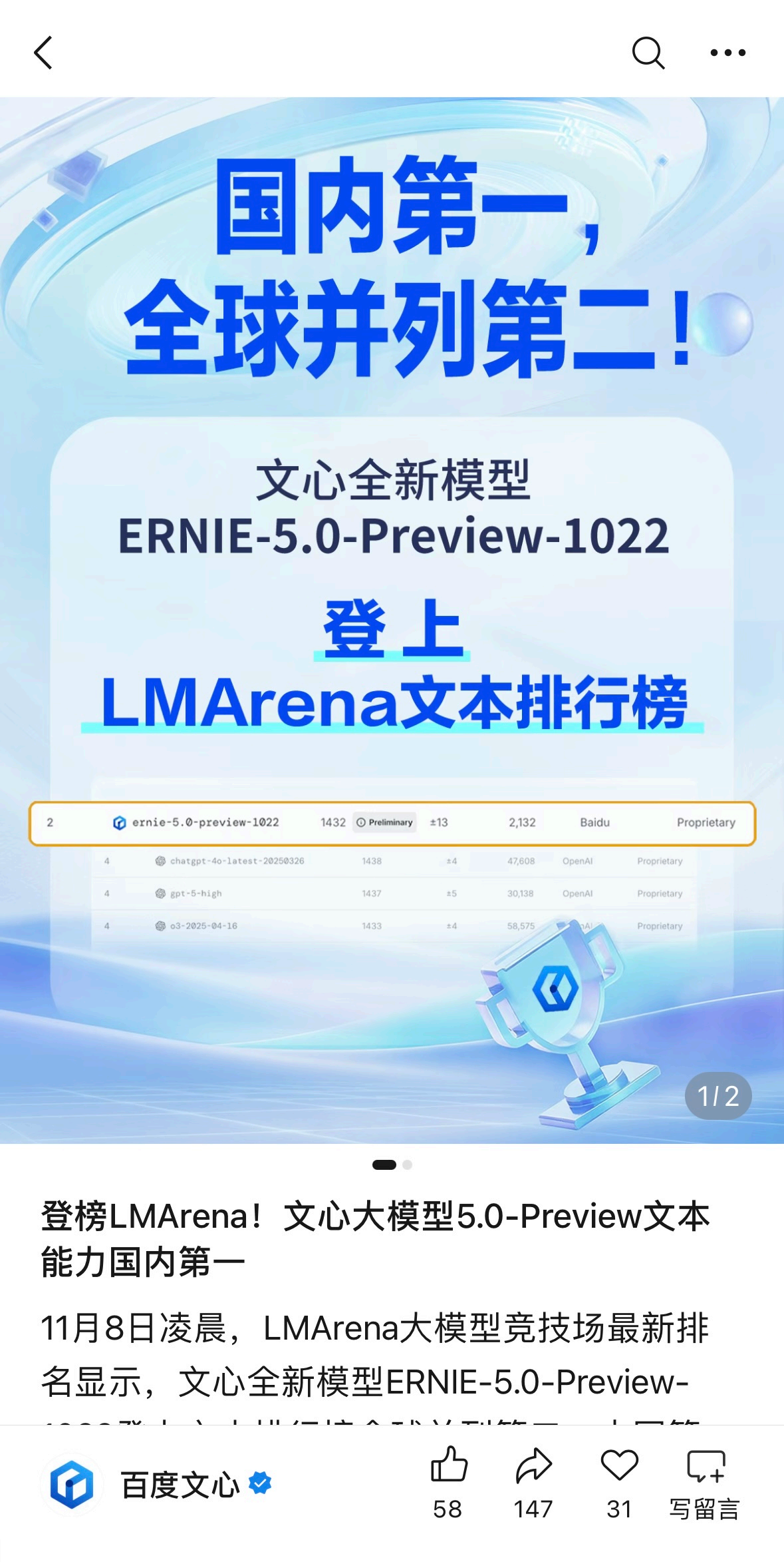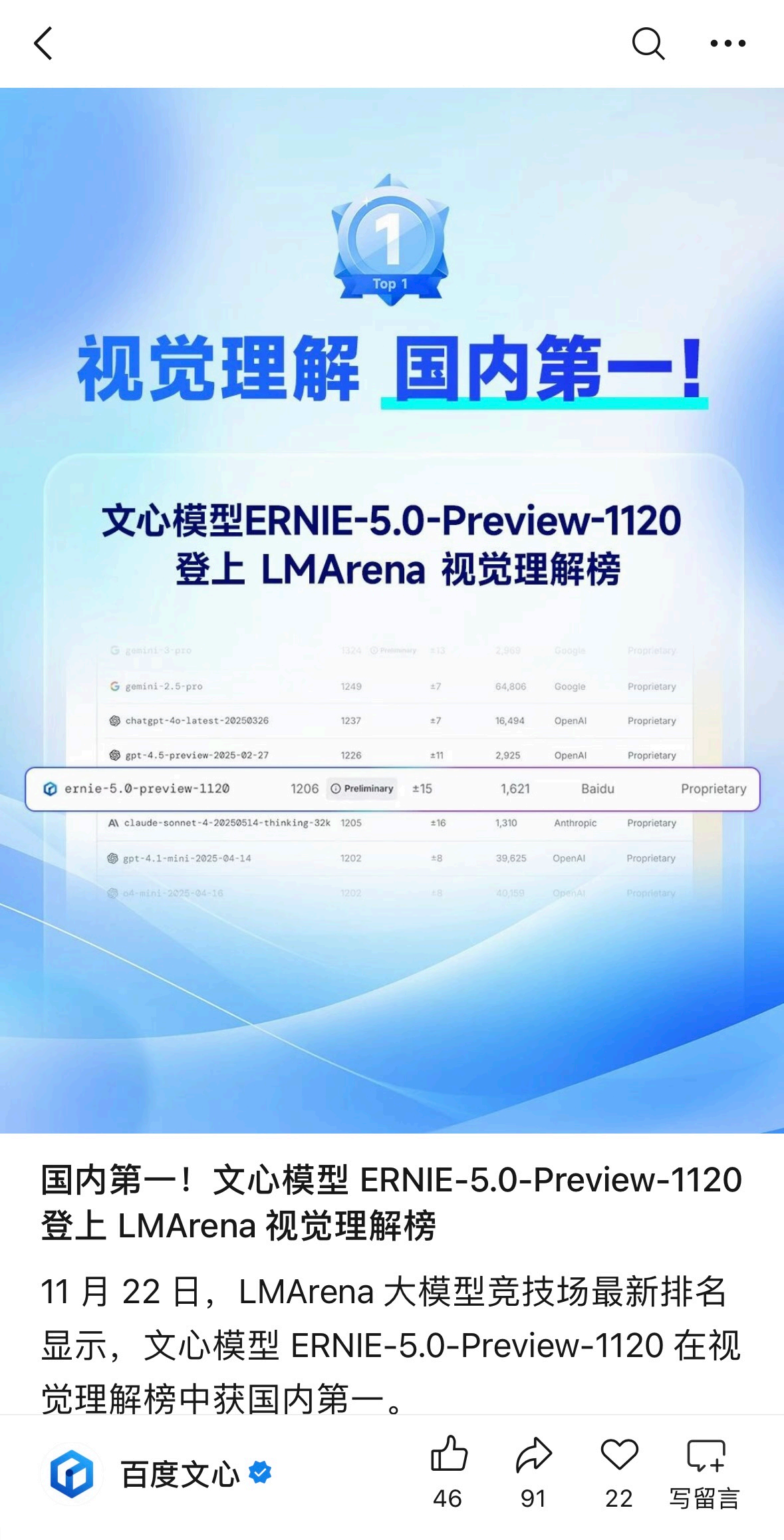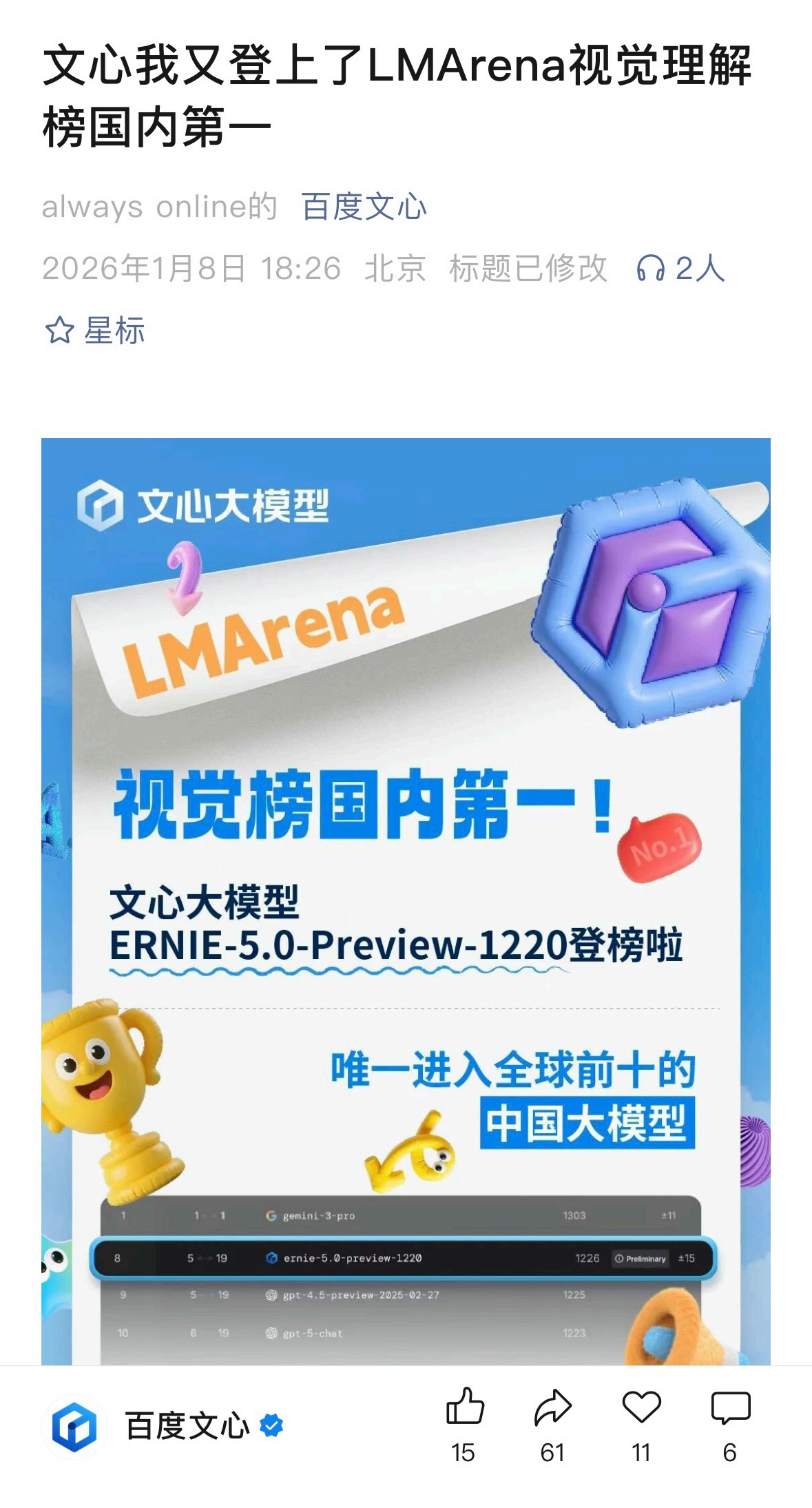 在正式官宣之前,文心其实已经“低调”地秀了一把实力。关注大模型评测的朋友可能注意到了,文心近期频繁在LMArena登榜。无论是在文本还是视觉理解榜单中,它都多次卡位国内第一,并且是唯一进入全球前10/20的中国大模型。