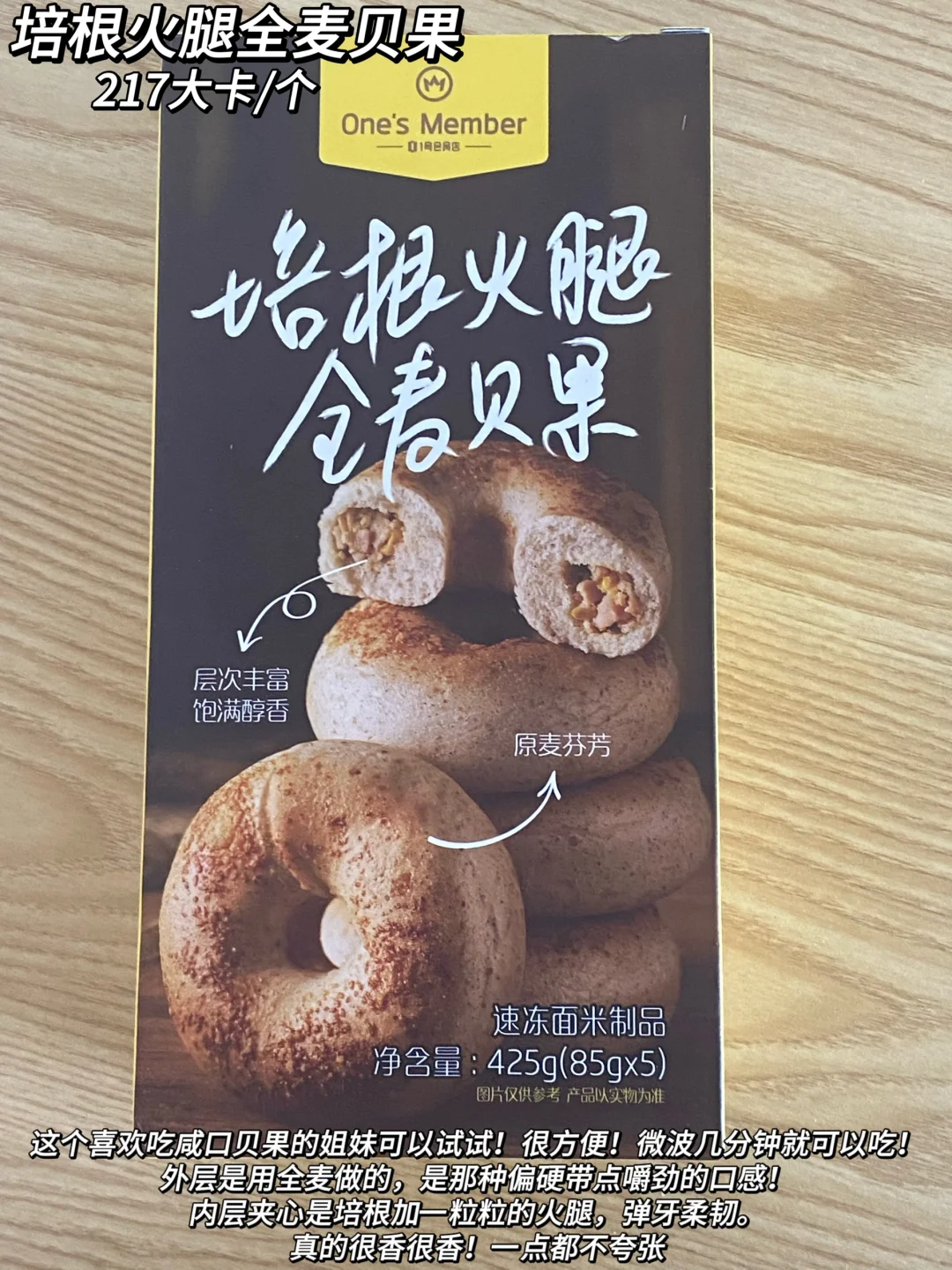 喜欢吃咸口贝果的姐妹不要错过!微波几分钟就可以吃很方便!馅料香浓饱满,外层是全麦内层是培根加火腿!是那种偏硬带点嚼劲的口感!弹牙柔韧~