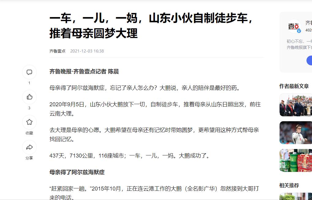 山东一母亲患上阿尔兹海默症,突然说想去大理,儿子以工作太忙拒绝了。某日母亲突然问:“外边无花果树上有多少树叶?”听到这句话后,儿子毅然决定推去所有工作,徒步推着母亲去大理。 一对母子,两位平凡却又不平凡的人,在这人世间演绎着一段感人的故事。 彭广华是那种在人群中你很难一眼认出的人,他的外表普通,工作普通,生活看似平淡无奇,但在他内心深处却隐藏着一颗坚韧不拔的心。 而他的母亲,一个慈祥的老人,用她一生的经历教会了彭广华生命的意义。 他们两人之间的关系超越了血缘,更像是一种心灵上的默契。彭广华的母亲从未向他提及过自己心中的愿望,她总是默默地付出,从不求回报。 然而,随着岁月的流逝,她的身体渐渐力不从心,而那个埋藏已久的心愿也愈发强烈。她想在大理的美景中寻找人生的慰藉,想在那片土地上找到心灵的宁静。 有一天,她在与彭广华的聊天中无意间透露了自己的想法。可是,当时他正年轻,根没有把这件事情放在心上,随着时间的推移,母亲的身影在他心中越来越清晰,那淡淡的话语似乎成了他心中难以割舍的牵挂。 彭广华越来越觉得自己出现问题了,他发现自己在追求事业成功的过程中,已经忽略了对家人的关心和陪伴。 那一刻,他下定决心,无论付出多少代价,也要帮母亲实现这个最后的愿望。他辞去了工作,开始筹备这场特殊的旅行,他用自己所学的手艺为母亲打造了一辆能够载着她畅游大理的徒步车。 这辆车不只是一段路程的载体,更更是母子两个人感情的象征。所有人都被他的孝心打动。 终于,他们抵达了大理,那片母亲梦寐以求的地方。看着眼前如画的风景,母亲的脸上流露出了久违的满足和快乐。彭广华知道,这一切的努力都是值得的。 彭广华和他的母亲,两个普通却又不同凡响的灵魂,共同编织了一段感人至深的旅程。这位坚强的儿子,背负起了为母亲实现心愿的重担,毅然决然地在生活的道路上迈出了坚定的步伐。他们的背影渐行渐远,留下的是一段永恒的记忆和一颗充满爱的心。 这一路,他们历经艰险。山川河流见证了他们的坚韧,城市村落见证了他们的温情。母亲的身体随着路程的好转慢慢康复,精神也逐渐振作起来。彭广华始终不离不弃,用他的行动证明了对母亲那份深厚的爱。 这里温暖的阳光和美丽的风景给予了母亲莫大的安慰,彭广华看着母亲脸上洋溢的微笑,感受到了前所未有的幸福。 这场由孝心驱动的旅程,成为了一段传奇。它讲述了一个道理:爱,需要行动去实践。我们作为成年人,面对生活的压力,不得不放弃自己陪伴家人的时间来和生活进行斗争。 这对母子所走过的每一步,都印证了爱的力量。他们用脚步丈量了距离,用心感受了对方的关爱。这段旅程会成为回忆,记载在他们的生命里,同时也成为了人们心中关于孝心和爱的经典故事。 信息来源;齐鲁壹点 2021年12月3日 一车,一儿,一妈,山东小伙自制徒步车,推着母亲圆梦大理#社会##人物#