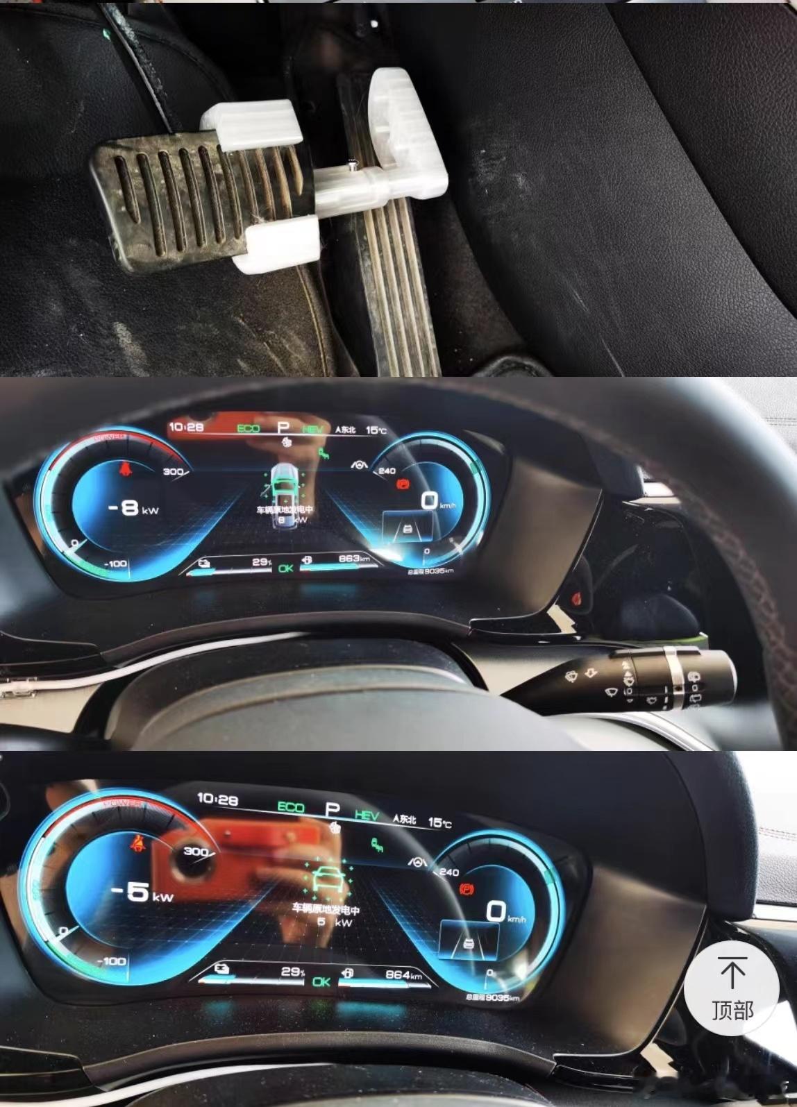 但驻车发电也有一定的优势,比如露营时间很长,电池电量耗尽时,可以用驻车发电继续给外接电器供电,甚至可以给其他纯电动车充电(把油换成电卖给对方[doge]),可以作为应急使用。而在网购平台上,甚至能买到一些强制驻车发电的神器,用卡扣把油门踏板 “踩” 下去发电(图3),足以见得驻车发电也是露营爱好者的刚需。