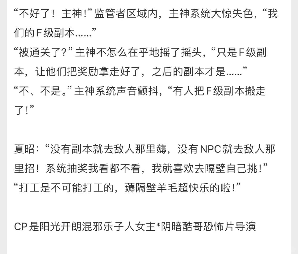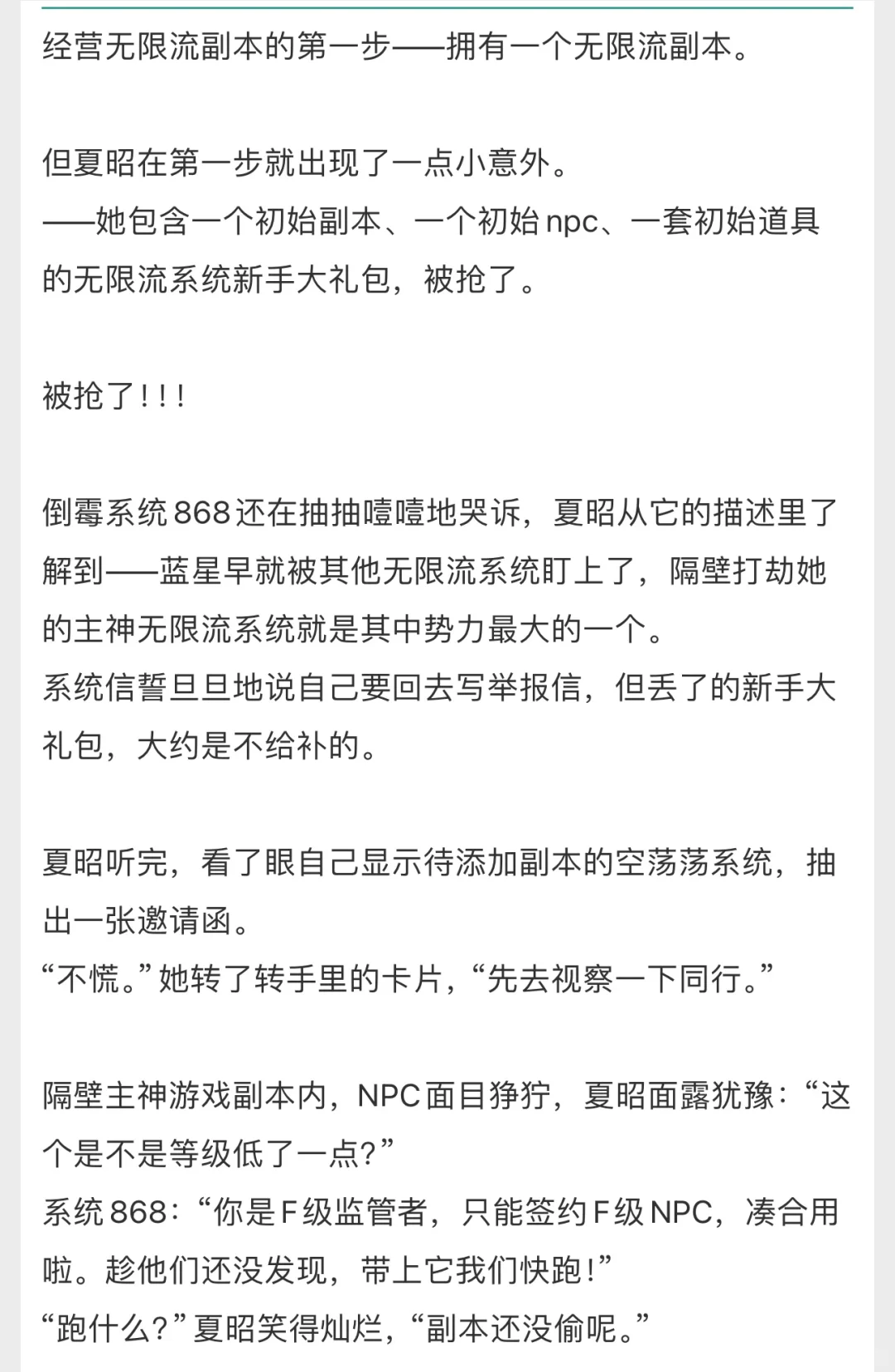 ——她包含一个初始副本、一个初始npc、一套初始道具的无限流系统新手大礼包,被抢了。