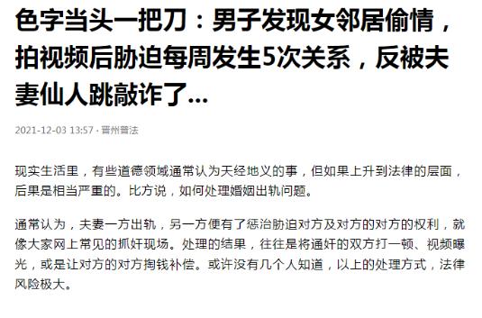“抓马!螳螂捕蝉黄雀在后?”四川南充,男子在阳台修空调时,意外发现美貌女邻居出轨。他用手机拍下证据发给女邻居,并以此要挟与其发生关系。女邻居无奈答应后,却越来越难以忍受男子的变态行为,逐向丈夫坦白求得原谅,还主动提出设置“仙人跳”,向该男子索要10万元补偿。没想到事情的结局,来了个大转换! 【来源:营山县法院;晋州普法 2021年12月3日 关于《色字当头一把刀:男子发现女邻居偷情,拍视频后胁迫每周发生5次关系,反被夫妻仙人跳敲诈了..】 红尘中的男欢女爱,往往会种下祸根。 这起发生在四川某小区的案件,就给予我们沉重的警示。 一场出轨偷情,引发了一连串罪恶事件,让几个平凡家庭陷入了命运的旋涡。 康小梅(化),一个貌美如花的主妇,陈志远(化),一个平凡的修理工,李大伟(化),一个勤劳的上班族。 三人本无瓜葛,却因一个偶然的邂逅,走上了不归路。 盛夏的午后,一阵淫靡的声响传出了小区几户人家。 陈师傅正在康家的阳台上修理空调,不经意间,他瞥见了康小梅与一名陌生男子滚作一团的香艳场景。 虽然尴尬,但他难掩内心的躁动,竟然拿起手机,对这一幕展开了偷拍。 等到声息全无后,陈师傅回味无穷,一时兴起,他打算利用这段不雅视频,为所欲为一番。 于是,他在业主群里联系到了康小梅,将证据视频发了过去。 视频一出,康小梅惶恐不安。 她万万没想到,一时的迷失会让自己背上如此重的罪名。 为了销毁这个祸根,不让自己的丈夫李大伟发现,她主动开出2万元,希望陈师傅能将视频销毁。 谁知,陈师傅见钱眼开,非但不肯就范,反而提出了越来越过分的条件。 他告诉康小梅,要想毁尸灭迹,就必须每周与他发生5次关系! 做错事的确该受惩罚,可陈师傅的做法,实在令人发指。 康小梅陷入绝境,她痛苦不堪,最终只能屈服于这个卑鄙小人的要挟。 经过一段时间的压抑和煎熬,康小梅终于决定向丈夫李大伟吐露实情。 出乎意料的是,李大伟并没有狠心离她而去,反而与妻子商议了一个"仙人跳"的阴谋。 于是,当陈师傅再次来到康小梅家里意图侵犯时,李大伟假装"恰好"回来,将他逮个正着。 随后李大伟顺理成章狮子大开口,要求陈师傅付出10万元的"封口费",否则他就将此事曝光,让陈师傅在世人眼中无地自容。 最终,陈师傅在压力之下,艰难地拿出了全部家当。 随后没多久,陈师傅的妻子就发现家里少了十万块钱,于是逼问下,陈师傅将事情全盘托出,气的妻子立马报了警。 按照《治安管理处罚法》第四十二条的规定,陈师傅的偷窥、偷拍行为已经构成违法,情节严重可处5日以上10日以下拘留,并罚款。 更糟糕的是,陈师傅以非法手段胁迫康小梅发生性关系,这已经触犯了《刑法》第二百三十六条强奸罪的罪名,从重处罚可判处无期徒刑,乃至死刑。 另一方面,康小梅和李大伟夫妻二人的"仙人跳"行为,违反了《刑法》规定的敲诈勒索罪。 他们对陈师傅实施威胁恐吓,索要了10万元财物,属于数额巨大的敲诈勒索,可处3年以上10年以下有期徒刑,并处罚金。 贪欲和权势,往往会让人堕落成为罪犯。这起案件虽然狗血离奇,却给我们敲响了警钟:忠诚、知耻、克制,才是一个幸福家庭应有的基石。 每个人物的结局,都是一面雪亮的反面教材。 陈师傅遭到了法律的严惩,但他自食其果也是咎由自取,康小梅本可免于牢狱之灾,却因贪婪而引火自焚,李大伟虽然最初是被蒙在鼓里,但最终也成了罪犯。 法律的钢硬拳头,必将落实在每一个渎职者和罪犯身上,没有人可以逃脱审判。#社会#