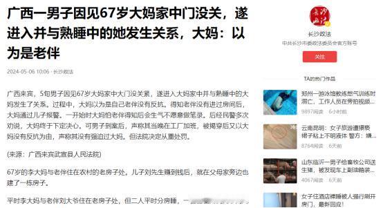 现实版的“真是饿了”!广西一男子偷偷进入67岁大妈家中,趁其熟睡与之发生关系!大妈以为是老伴就没反抗,事后觉得不对便报警处理,最后法院又该怎样判? 【来源:长沙政法-2024.05.06《广西一男子因见67岁大妈家中门没关,遂进入并与熟睡中的她发生关系,大妈:以为是老伴》】 事情发生在广西,就在不久前的一个夜晚,这份宁静被一桩骇人听闻的罪行所打破。 生活在这个小村里的,有一对年过花甲的老夫妻王大妈(化)和李老汉(化)。 他们俩虽然贫穷,却过着其乐融融的日子。 自从儿子成家后,一家人就住在两间相连的小屋里。 白天,儿子和儿媳在外工作,晚上照顾老两口,夜幕降临后,儿子便回到妻子身边。出于方便起见,王大妈和李老汉分住在主屋两侧的小房间里。 就在那个令人难以忘怀的夜晚,王大妈莫名感觉到有人在她身边做出了一些亲昵的举动。 潜意识中,她还以为是丈夫李老汉,毕竟到了他们这把年纪,夫妻间的亲密需求也是难免的。然而,当她轻轻呼唤丈夫时,却发现根本无人回应。 骇人的一幕在王大妈的意识中逐渐清晰起来——原来,她遭到了陌生人的侵犯! 虽然当时她还未完全清醒,但一种强烈的违和感已在心底油然而生。直到天色微亮,她才彻底惊醒过来,发现李老汉的确不在自己的房间里。 内心的恐惧与羞愧交织在一起,王大妈手足无措,犹豫再三,甚至产生了隐瞒真相的念头。 毕竟,谁也无法想象,一个67岁的老太太会遭遇这等离谋的事情。不过,她最终还是鼓起勇气,向儿子求助了。 儿子一听到母亲说的话,顿时怒火中烧。他坚决要求母亲报警,以还原事件真相,绳之以法。 警方立即着手调查。凭借精湛的专业技能,他们迅速锁定了一名可疑人物——51岁的赵某(化)。 通过严谨全面的取证,赵某的DNA样本与案发现场完全吻合。加之现场监控录像的直接证据,赵某的罪行确凿无疑。 警方进一步查明,赵某生前一直游手好闲,不务正业,屡次因盗窃罪入狱,却从未悔改。 正是这一夜的酗酒,令他丧失了最后的理智,对熟睡中的王大妈犯下了令人发指的暴行。 案件经过一系列程序后,赵某最终因累犯而被判处有期徒刑五年零两个月。 这一结果虽然无法挽回王大妈受到的创伤,但至少为正义伸张了声势。 案件曝光后,整个村落一片哗然。居民们从中汲取到宝贵的一课:珍惜来之不易的安宁,留意居家安全细节,切莫贪图一时便利而疏于防范。 村里许多年长者的亲属,更是主动提议将老人接回家中照顾,以避免类似悲剧的重演。 这个案例再次引发了社会各界对法制教育的广泛关注。 公众意识到,每个人都应该遵纪守法,尊重他人权利,维护社会秩序,这既是基本权利义务,也是构建和谐社会的应尽之责。#社会#