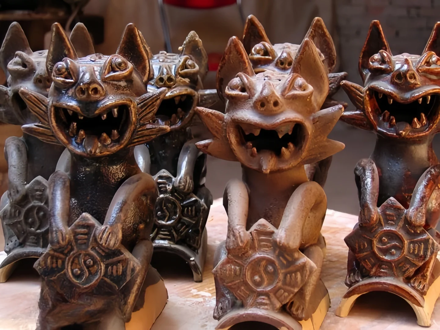 昆明的瓦猫:琉璃釉包裹,黄土捏制,红漆装饰,有的胸前加上八卦,头上写“王”字。