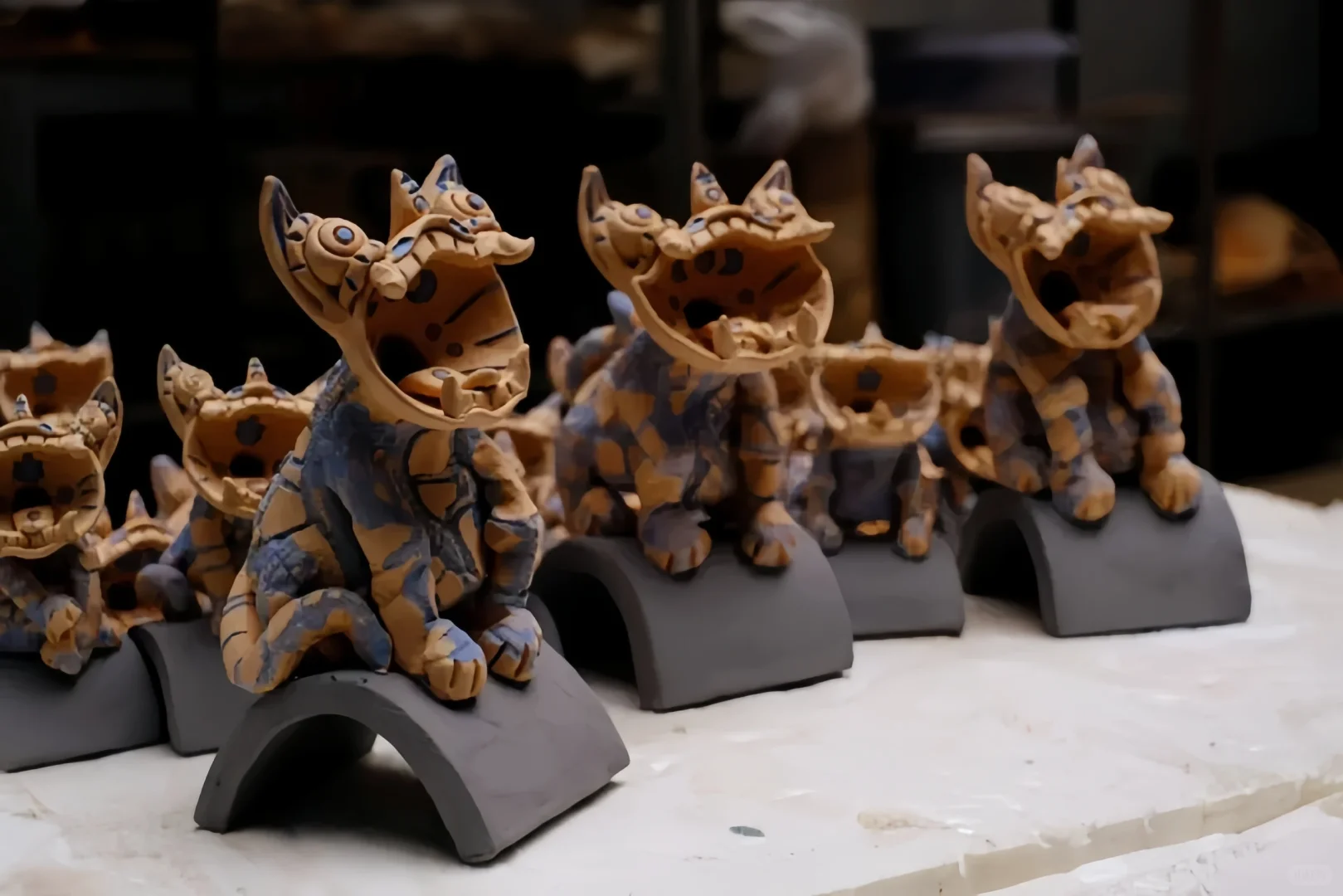 大理鹤庆的瓦猫:写意派造型抽象,犄角明显;写实派则更接近真猫,大嘴张口,尾巴翘立。