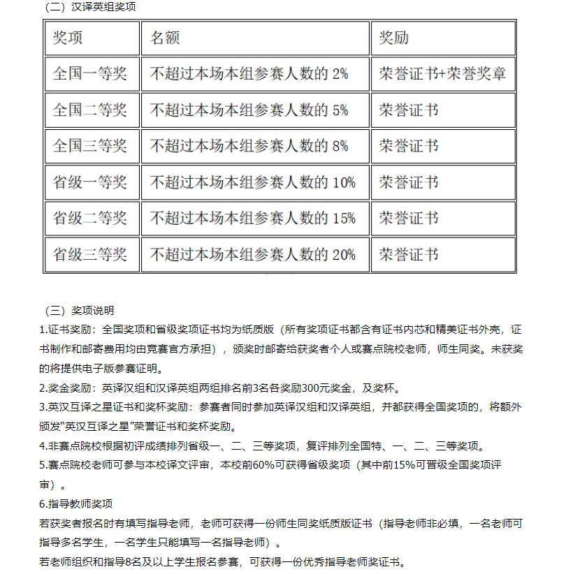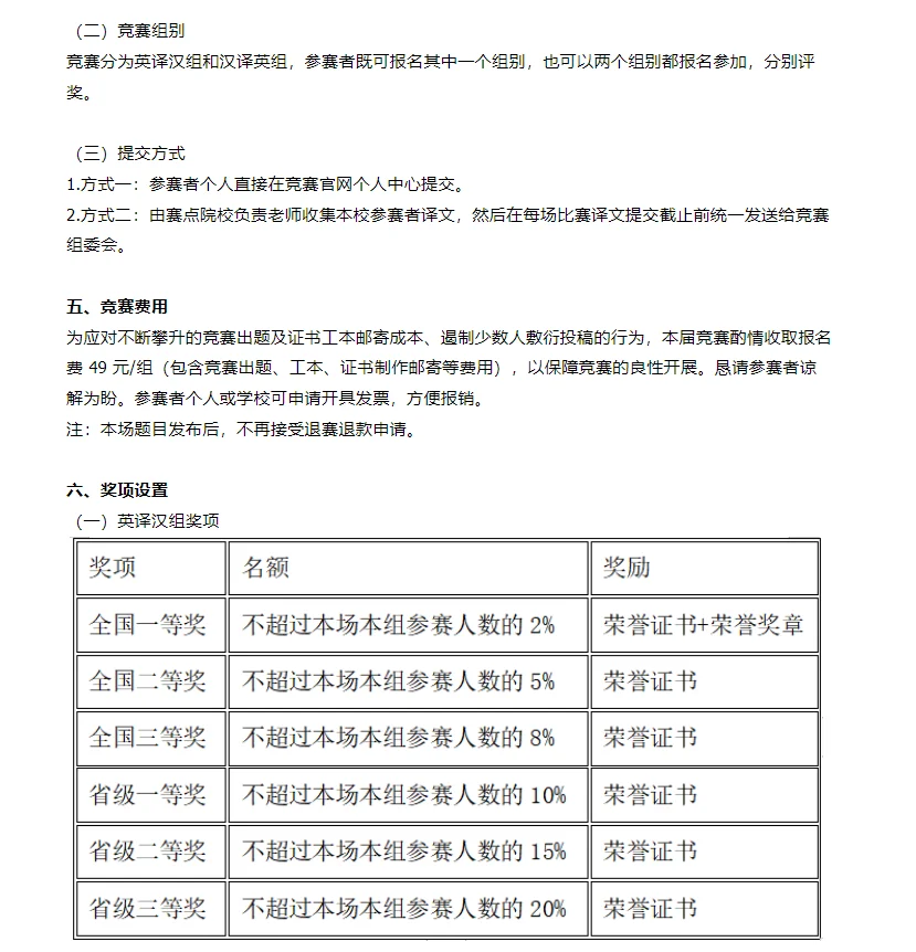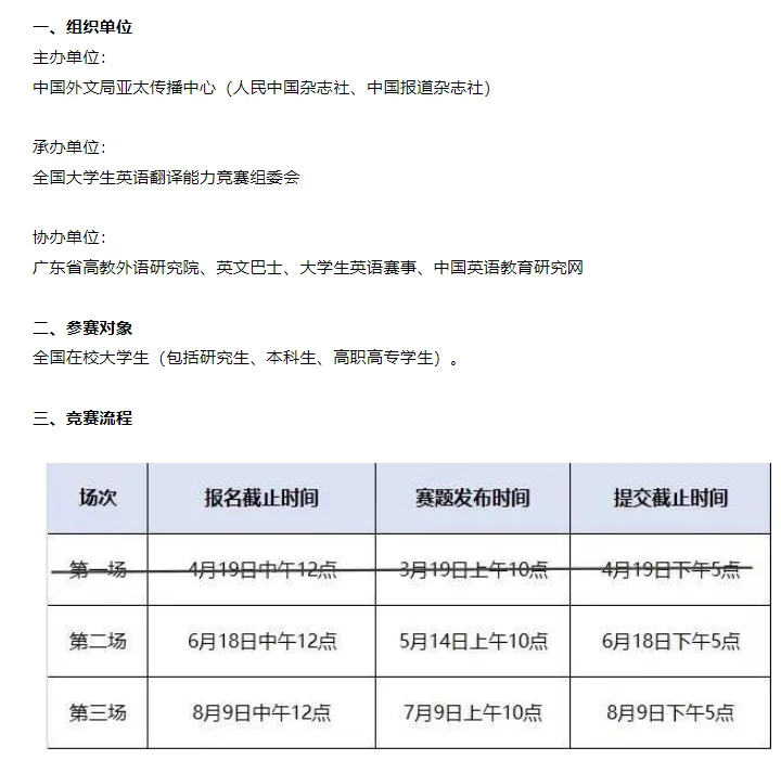 - 英语翻译大赛 报名明日截止 - 2024年第三届全国大学生英语翻译能力竞赛 报名截止时间:6月18日 - 参赛对象 全国在校大学生(包括研究生、本科生、高职高专学生)。 -