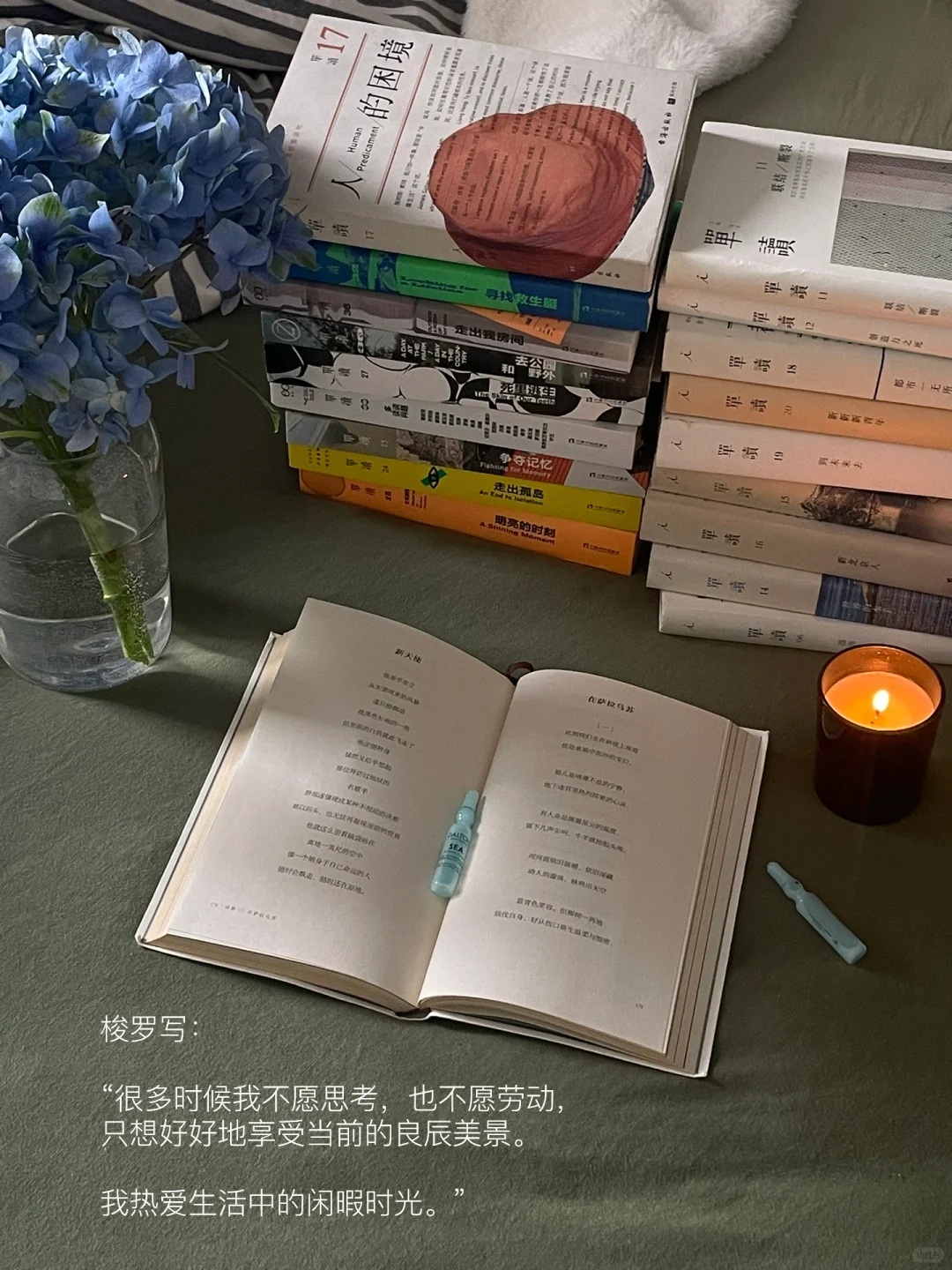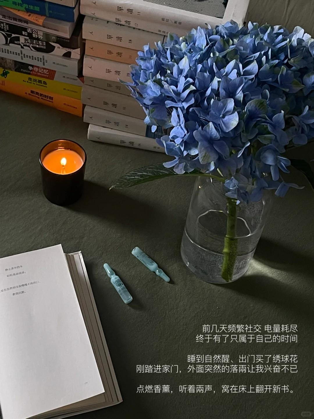 点燃香薰,听着雨声,窝在床上翻开新书。