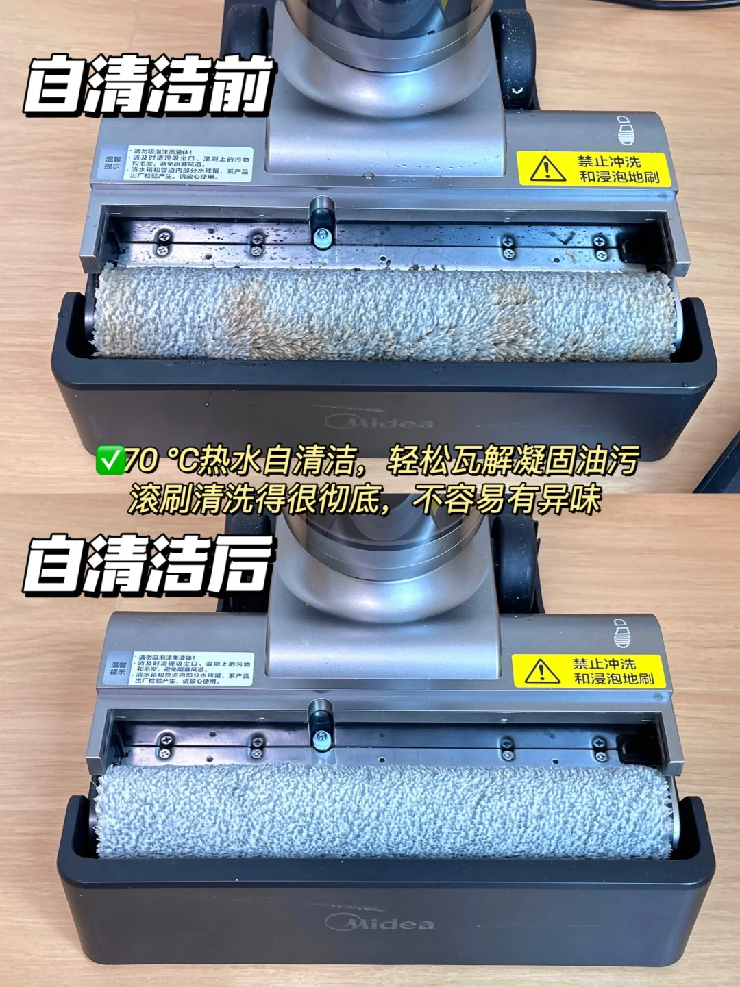 用的是70℃热水,更容易瓦解凝固油污,清洗滚刷更彻底