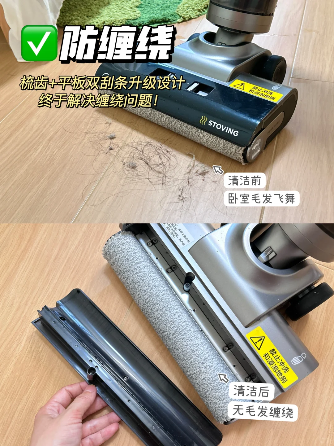 单刮条的洗地机都有缠头发的通病,而这款洗地机是梳齿➕平板刮条双刮条升级设计,终于摆脱了缠发的问题!用它来拖房间、卫生间,干湿头发都没有缠绕!
