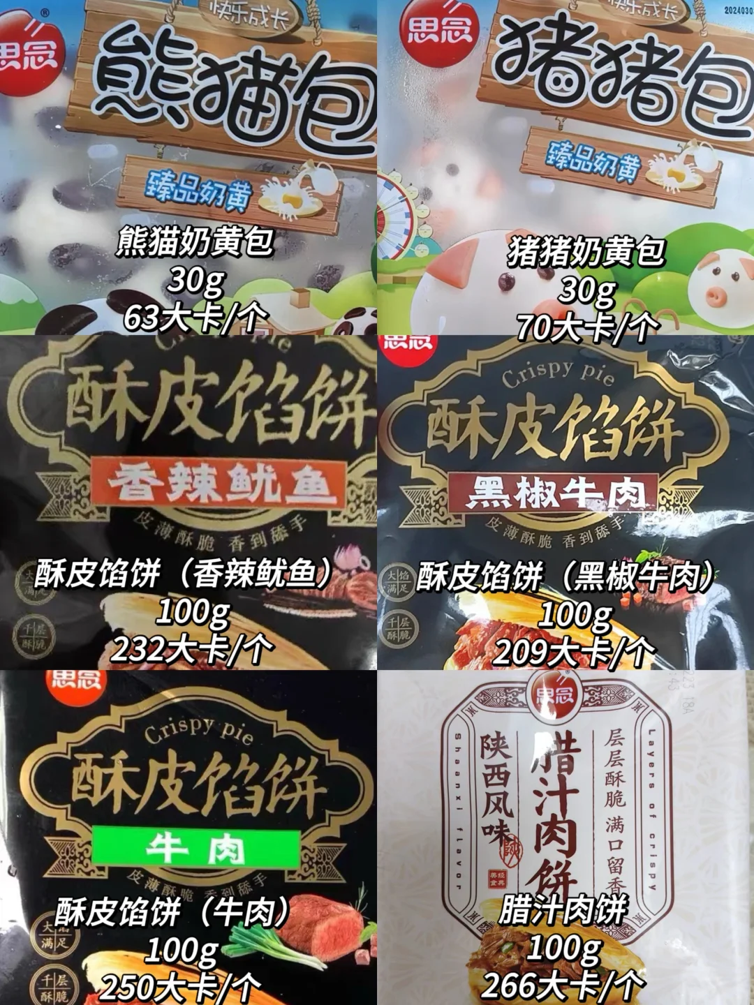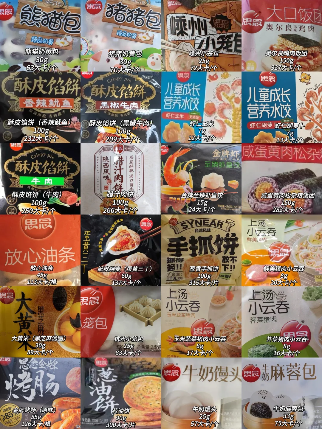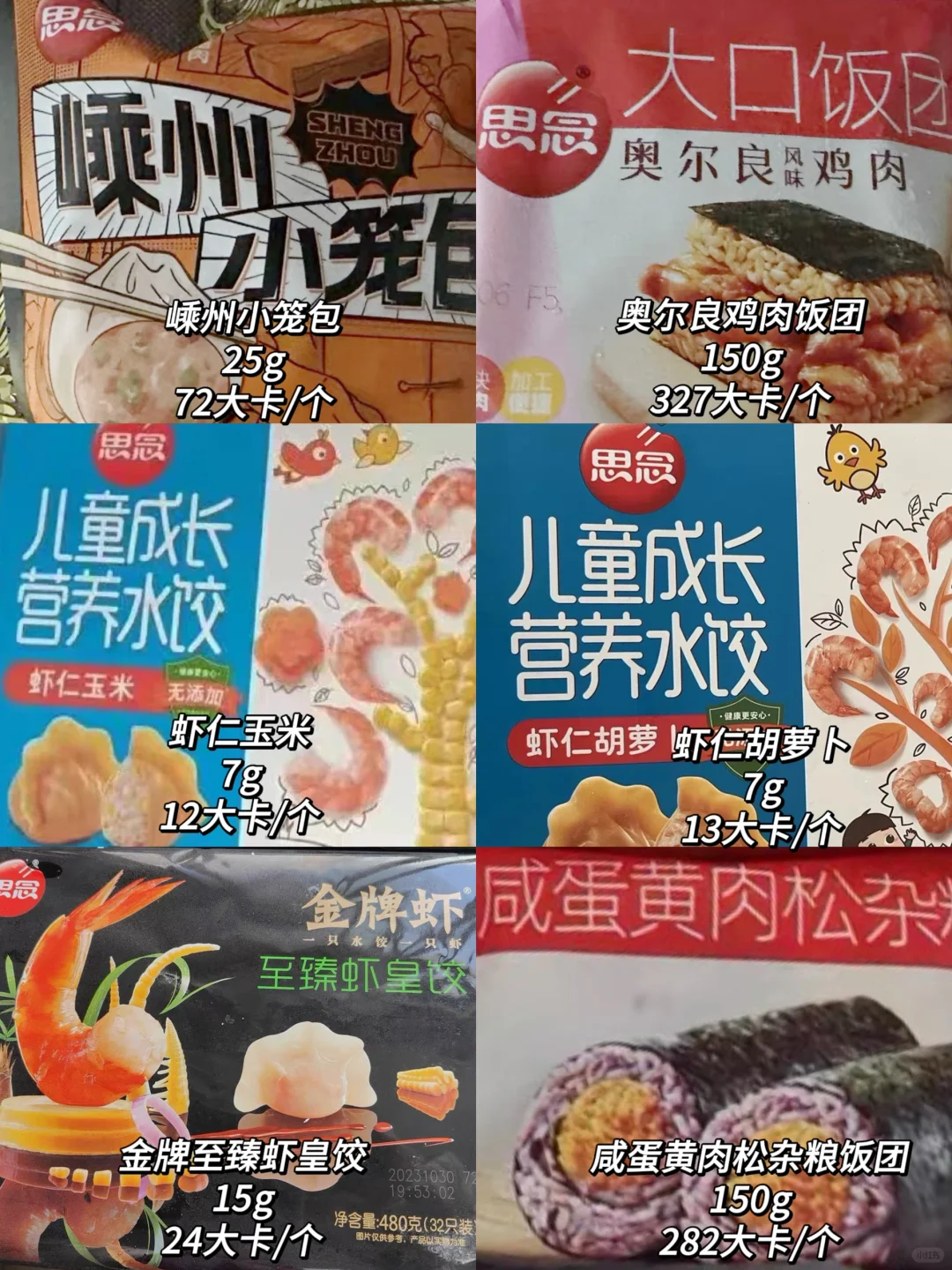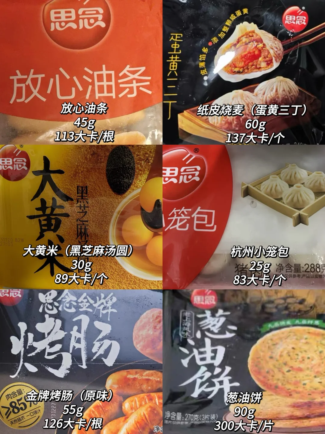 hello 大家好🙋 我是莹莹 一个喜欢研究外食不长胖的女孩👧 今天整理的是思念速食早点的热量~ 【包子馄饨区】(从低到高) 1⃣️儿童水饺(虾仁玉米)12大卡/个 2⃣️儿童水饺(虾仁胡萝卜)13大卡/个 3⃣️芥菜猪肉小云吞16大卡/个 4⃣️玉米蔬菜猪肉小云吞17大卡/个 5⃣️鲜美猪肉小云吞20大卡/个 6⃣️金牌至臻虾饺24大卡/个 7⃣️牛奶馒头57大卡/个 8⃣️熊猫奶黄包63大卡/个 9⃣️猪猪奶黄包70大卡/个 🔟嵊州小笼包72大卡/个 1⃣️1⃣️牛奶麻蓉包75大卡/个 1⃣️2⃣️杭州小笼包83大卡/个 ✅像云吞、儿童水饺都在20大卡以下,如果按照20大卡约算。早餐10个200大卡,15个300大卡。 ☑️包子馒头因为个头比较小在60-80大卡左右,吃2-4个都差不多在300大卡内。 【饭团饼小吃类】 1⃣️大黄米黑芝麻汤圆89大卡/个 2⃣️放心油条113大卡/根 3⃣️原味金牌烤肠126大卡/根 4⃣️纸皮烧麦(蛋黄三丁)137大卡/个 5⃣️酥皮馅饼(黑椒牛肉)209大卡/个 6⃣️酥皮馅饼(香辣鱿鱼)232大卡/个 7⃣️酥皮馅饼(牛肉)250大卡/个 8⃣️腊汁肉饼266大卡/个 9⃣️咸蛋黄肉松杂粮饭团282大卡/个 🔟葱油饼300大卡/片 1⃣️1⃣️葱香手抓饼315大卡/片 1⃣️2⃣️奥尔良鸡肉饭团327大卡/个 ✅一般情况下,馅饼类会比手抓饼热量低一些,杂粮饭团会比白饭团热量低。不过这些基本在260-300大卡,以上搭配250ml牛奶当早餐基本上都在500大卡左右哦。 好啦,本期的分享就到这里啦 我们下期再见👋
