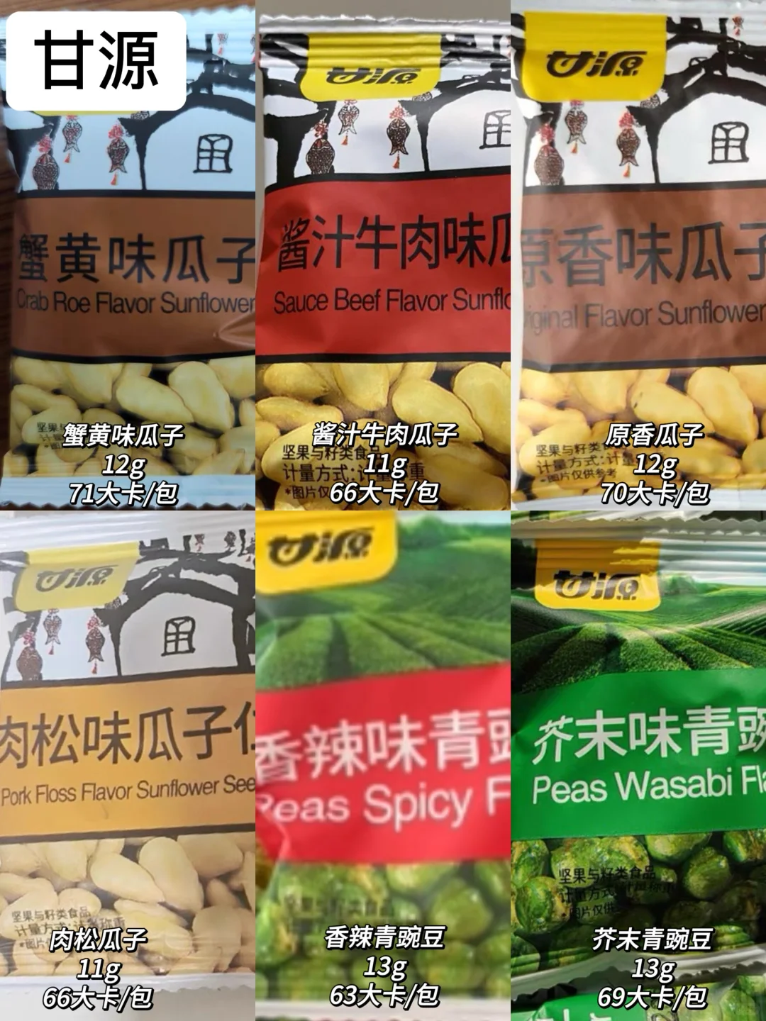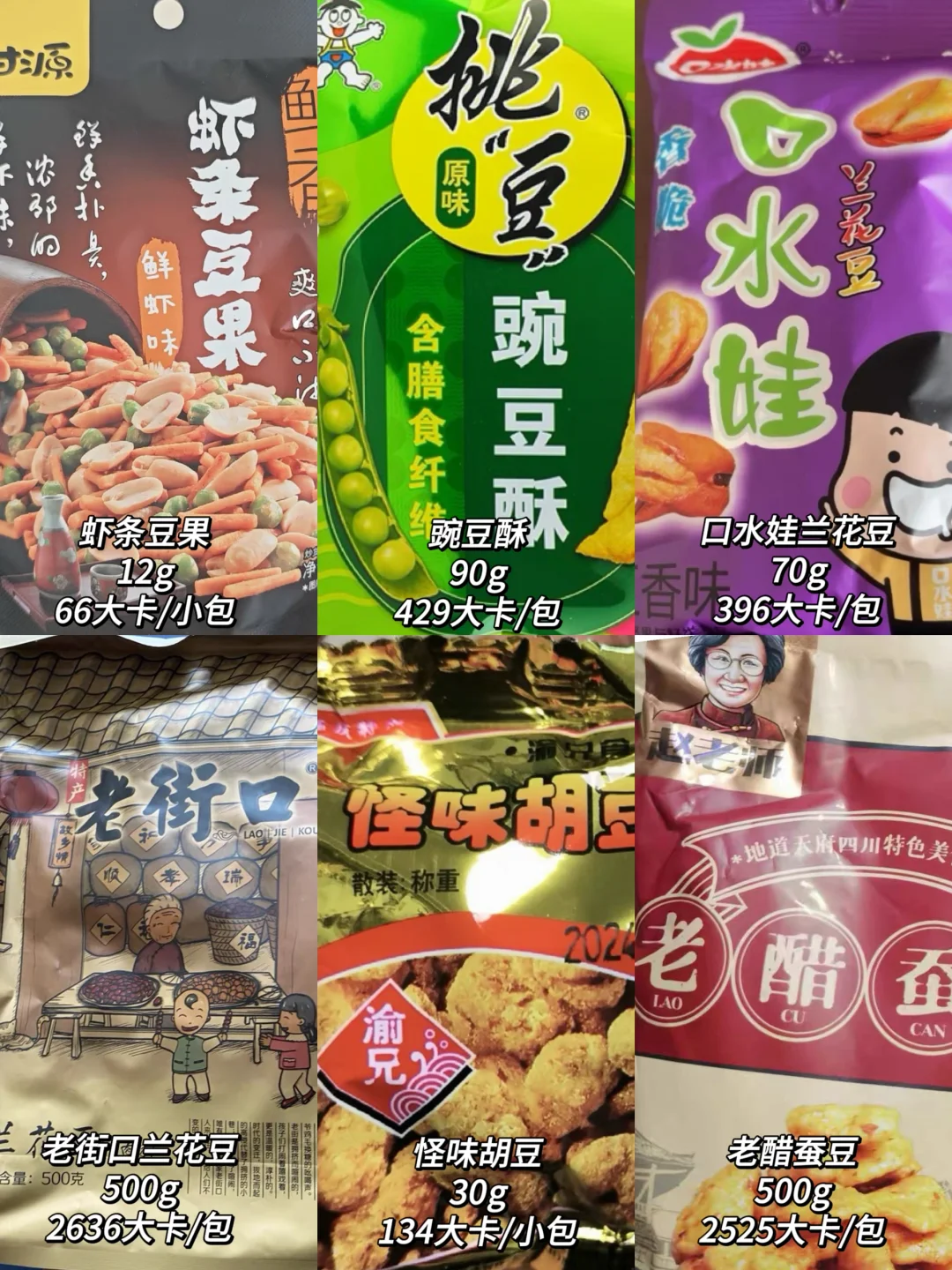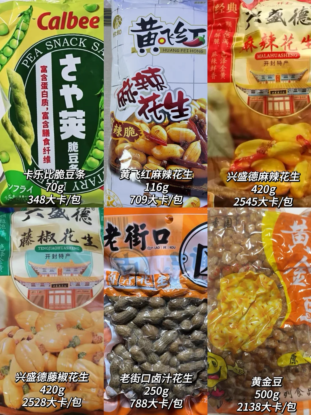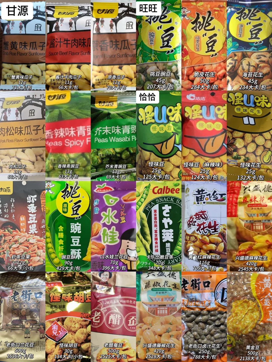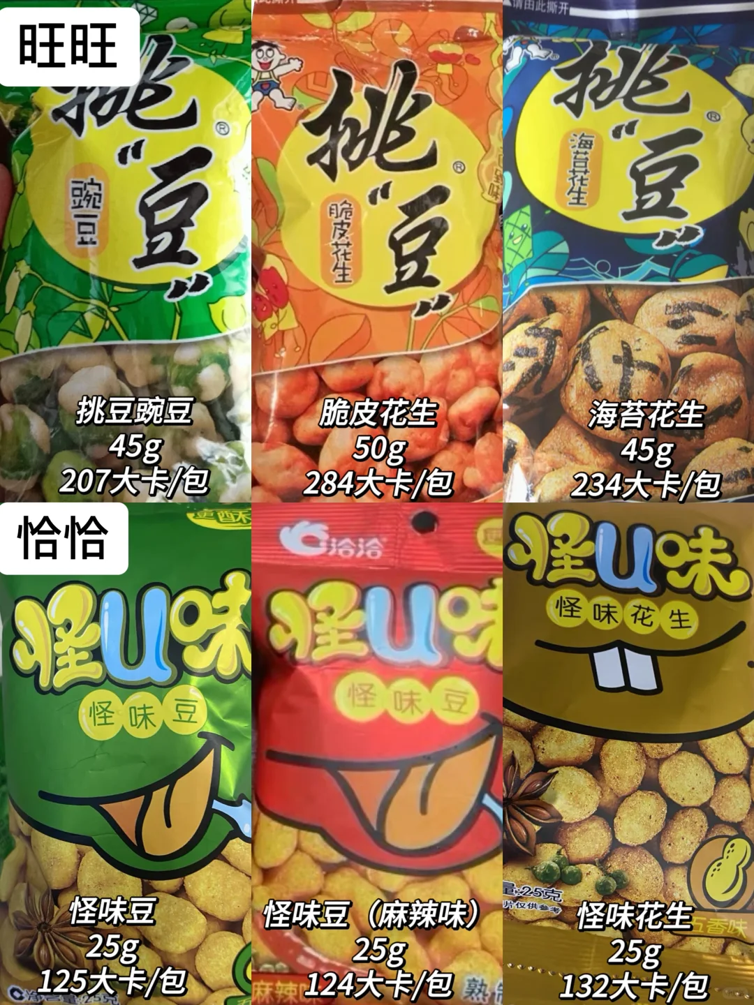hello 大家好🙋 我是莹莹 一个喜欢研究外食不长胖的👧 今天整理的是热门豆类零食的热量~ 看下他们的热量有多少吧! 【甘源】 1⃣️香辣香豌豆63大卡/包 2⃣️肉松瓜子仁66大卡/包 3⃣️虾条豆果66大卡/包 4⃣️酱汁牛肉瓜子仁66大卡/包 5⃣️芥末青豌豆69大卡/包 6⃣️原香瓜子70大卡/包 7⃣️蟹黄味瓜子仁71大卡/包 ✅上面一包基本都是12-13g,均值70大卡一小包。 【旺旺】 1⃣️挑豆207大卡/包 2⃣️海苔花生234大卡/包 3⃣️脆皮花生284大卡/包 4⃣️豌豆酥429大卡/包 ✅旺旺50g左右的约200-300大卡左右。 【恰恰】 1⃣️怪味豆125大卡/包 2⃣️麻辣怪味豆125大卡/包 3⃣️怪味花生132大卡/包 ✅恰恰的基本是130大卡左右一袋哦。 【其他】(从低到高) 1⃣️怪味胡豆134大卡/包 2⃣️卡乐比脆豆条348大卡/包 3⃣️口水娃兰花豆396大卡/包 4⃣️黄飞红麻辣花生709大卡/包 5⃣️老街口卤汁花生788大卡/包 6⃣️黄金豆2137大卡/包 7⃣️老醋蚕豆2525大卡/袋 8⃣️兴盛得麻辣花生2525大卡/袋 9⃣️兴盛得2528大卡/袋 🔟老街口兰花豆2636大卡/袋 ✅整体豆类零食的脂肪和热量都不低的‼️减脂期控卡严格的姐妹可以选择无添加坚果补充优质脂肪~ ps:嘴馋的姐妹实在想吃加餐可以选择吃10g-30g左右的豆类零食这样可以控制在100—150大卡左右哦~ 好啦,本期的分享就到这啦 我们下期再见👋