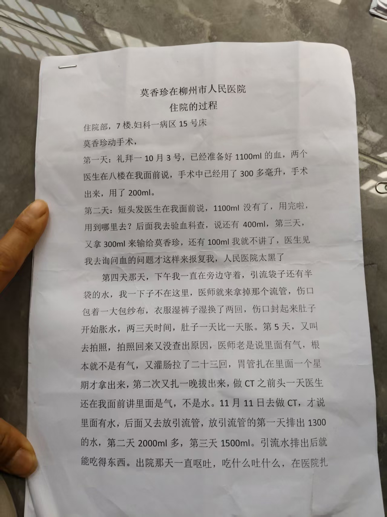 近日,38岁患者香某家属实名反映:家人在柳东人民医院住院部7楼妇科一病区15号床接受妇科手术后,出现一系列诊疗争议,最终患者出院仅20天不幸离世,因诊疗过程产生的7000余元额外治疗费用,院方暂未与家属达成一致处理意见。家属恳请当地卫健部门介入核查,还原事实真相,妥善处理后续事宜。