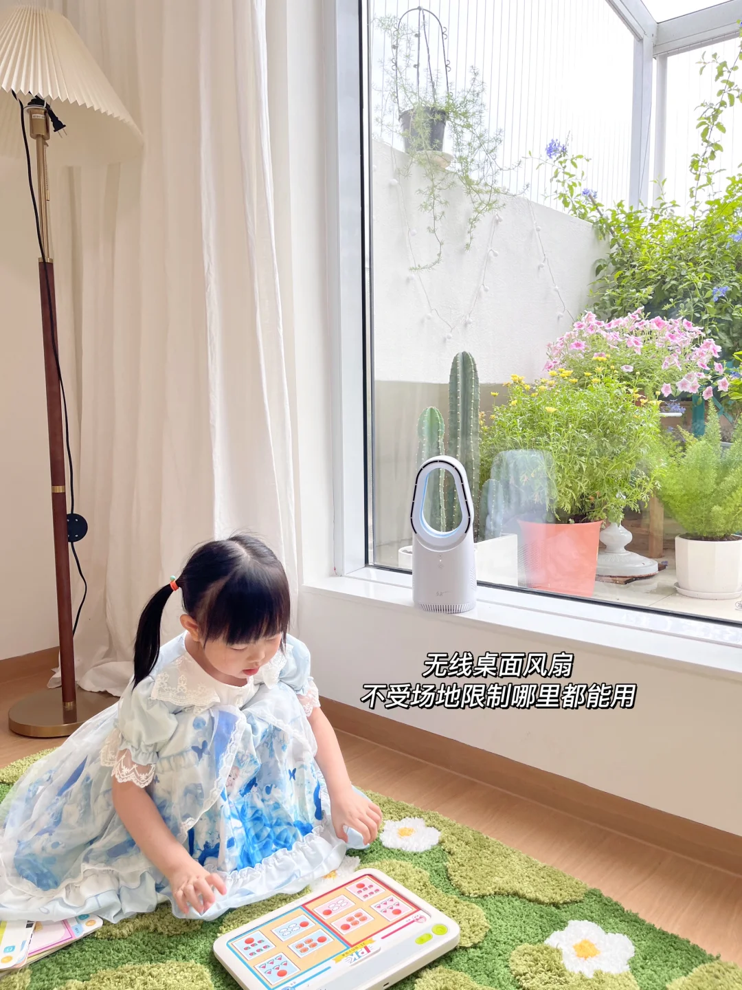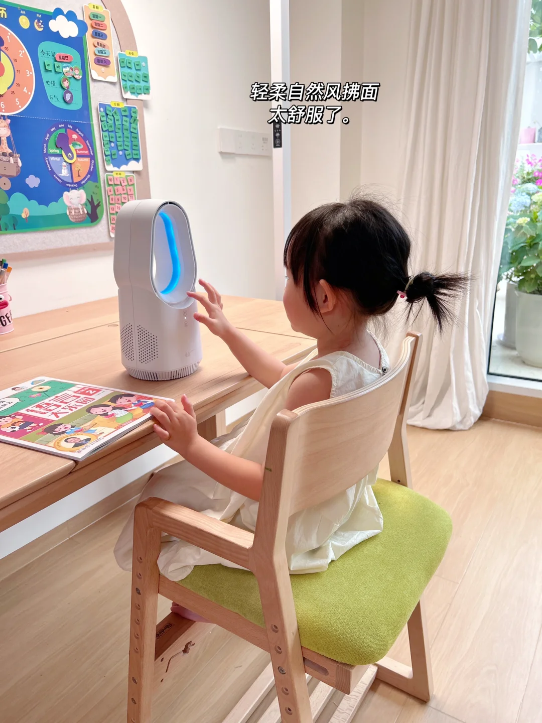 平时孩子在学习桌读绘本📚或画画🎨,把它放在书桌上,开1-2档风力就够凉快了,是那种很舒服的自然柔风,吹着很舒服!而且是低分贝的,不会打扰孩子。