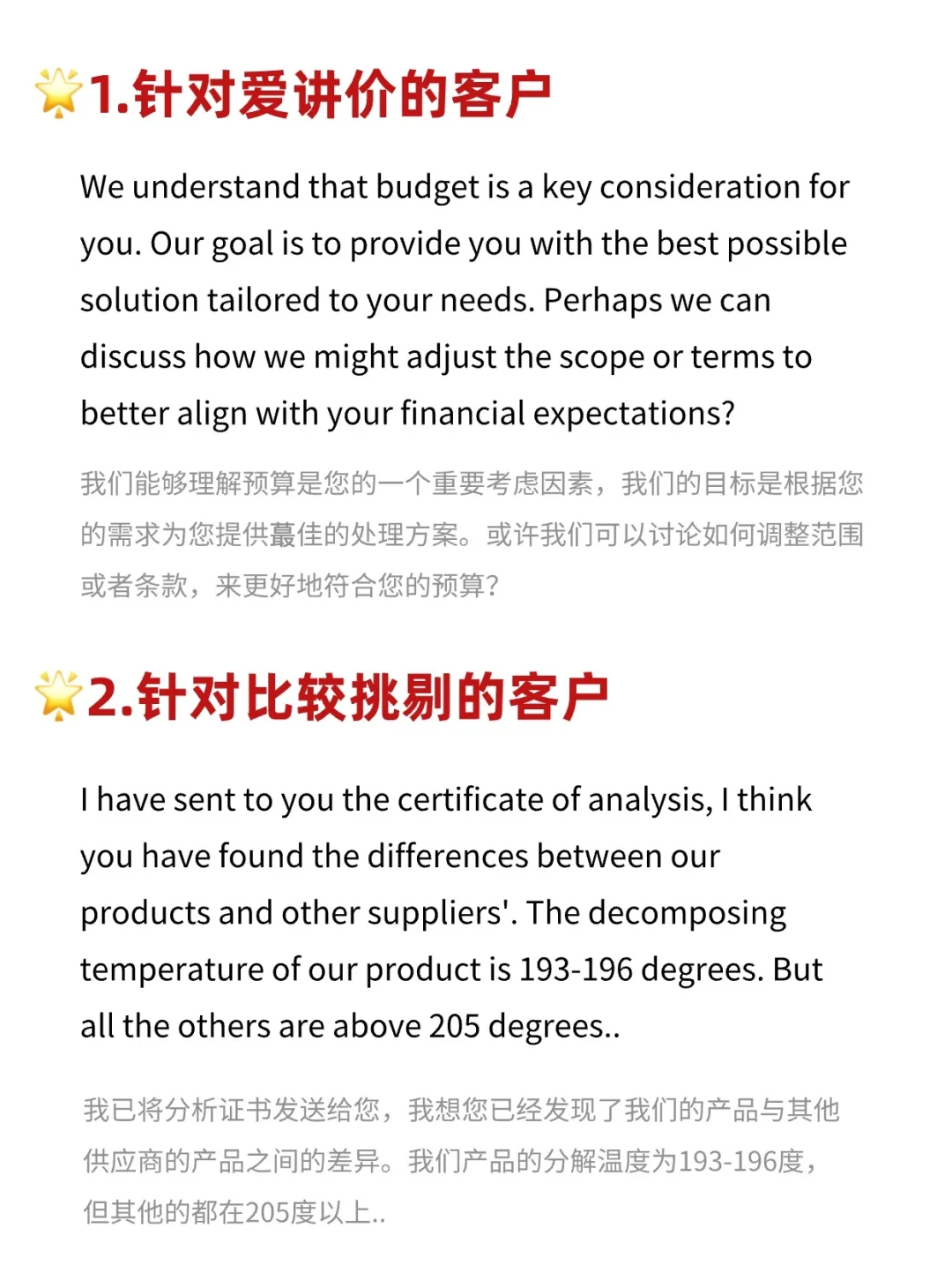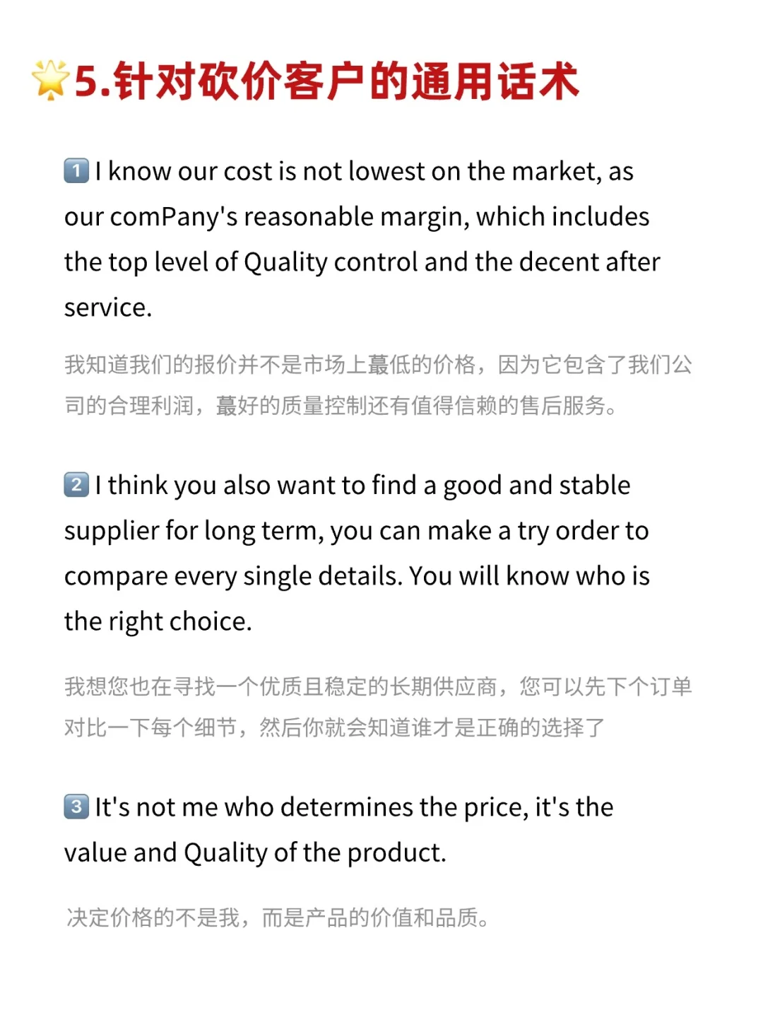 各种外贸谈单技巧和话术的背后,是了解客户心理,才能一句话直接拿捏客户。 所以说,想想怎么才能把话说到客户心坎上,这是很关键的! 可以尝试站在客户的角度思考问题,你说的话要让客户觉得他“有利可图”。