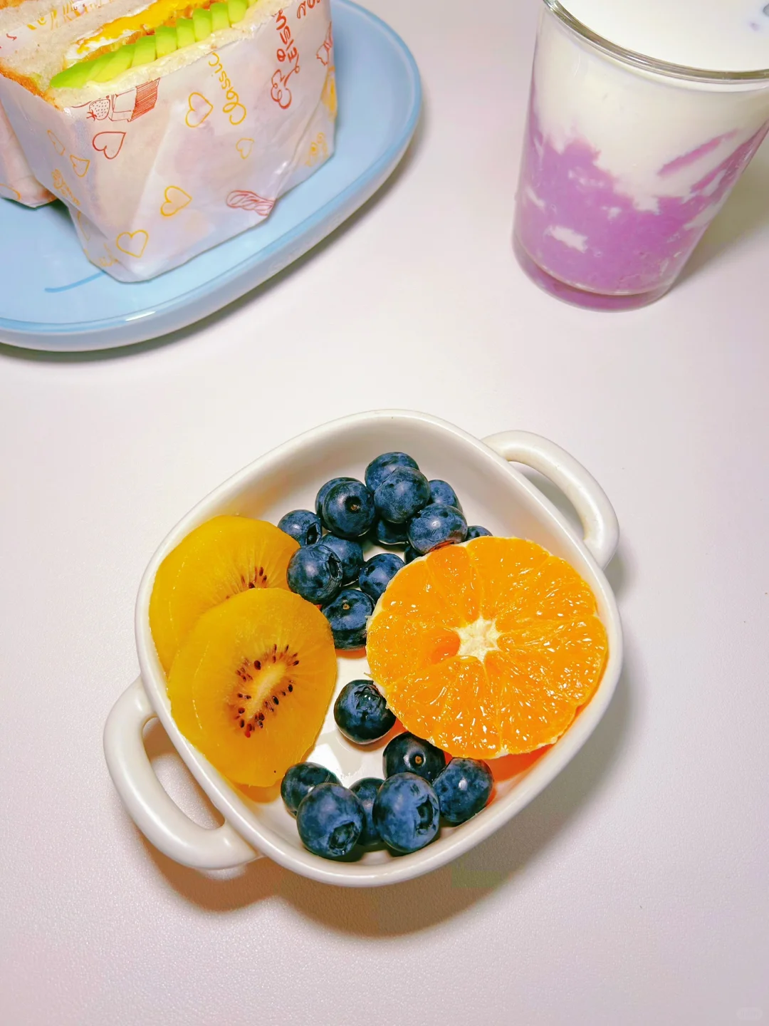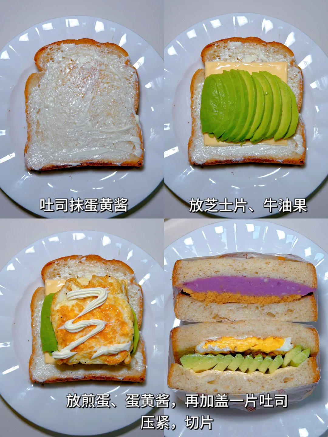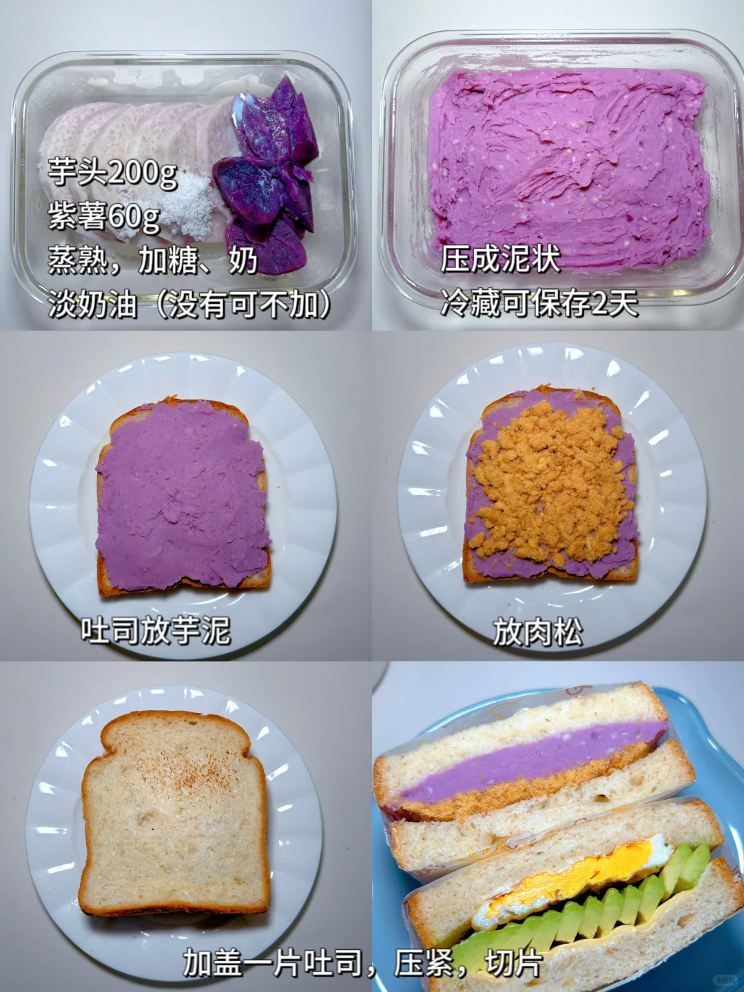 🌈今日快手Tips 1. 统筹时间,把7成准备工作放在睡前,3成放在早上(15分钟内可完成) 2. 芋泥,按照图片教程,晚上制作冷藏,早上花几分钟做三明治即可 🌈如何搭配每日早餐 1.尽量选取应季时令果蔬 2.用长高公式搭配营养早餐: 💗谷薯类:全麦面包(三明治)、芋头+紫薯(芋泥鲜奶) 💗肉蛋类:肉松、鸡蛋(三明治) 💗果蔬类:牛油果(三明治)、蓝莓+猕猴桃+橙子 💗豆奶类:牛奶(芋泥鲜奶)