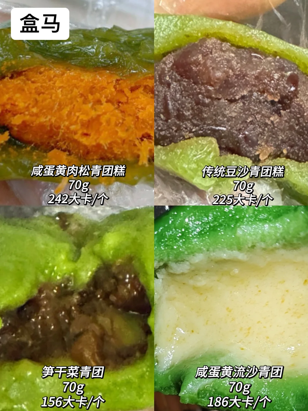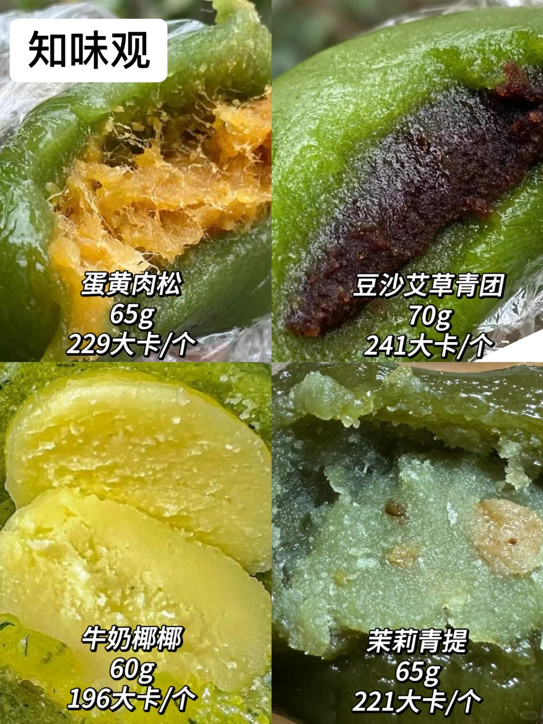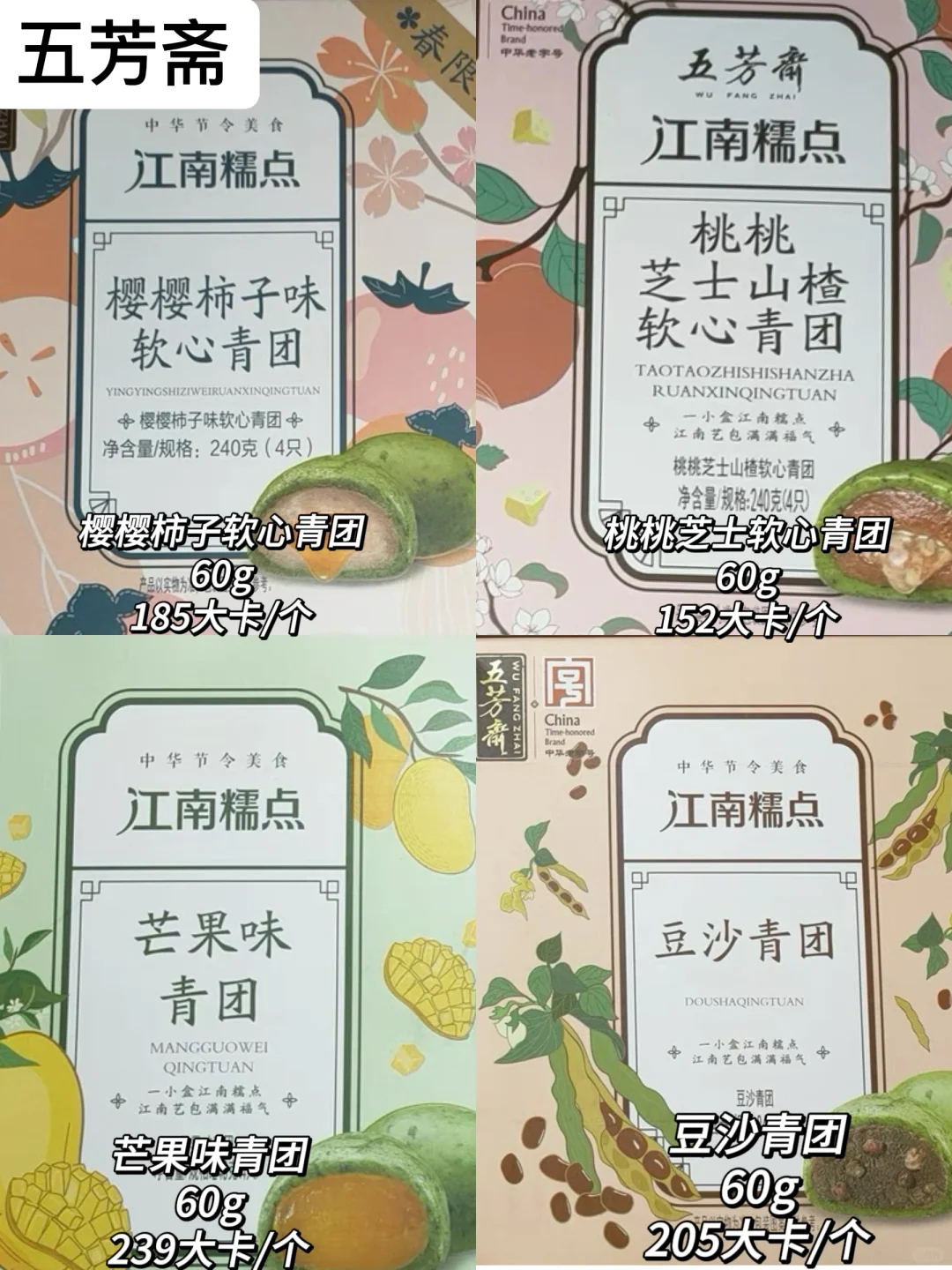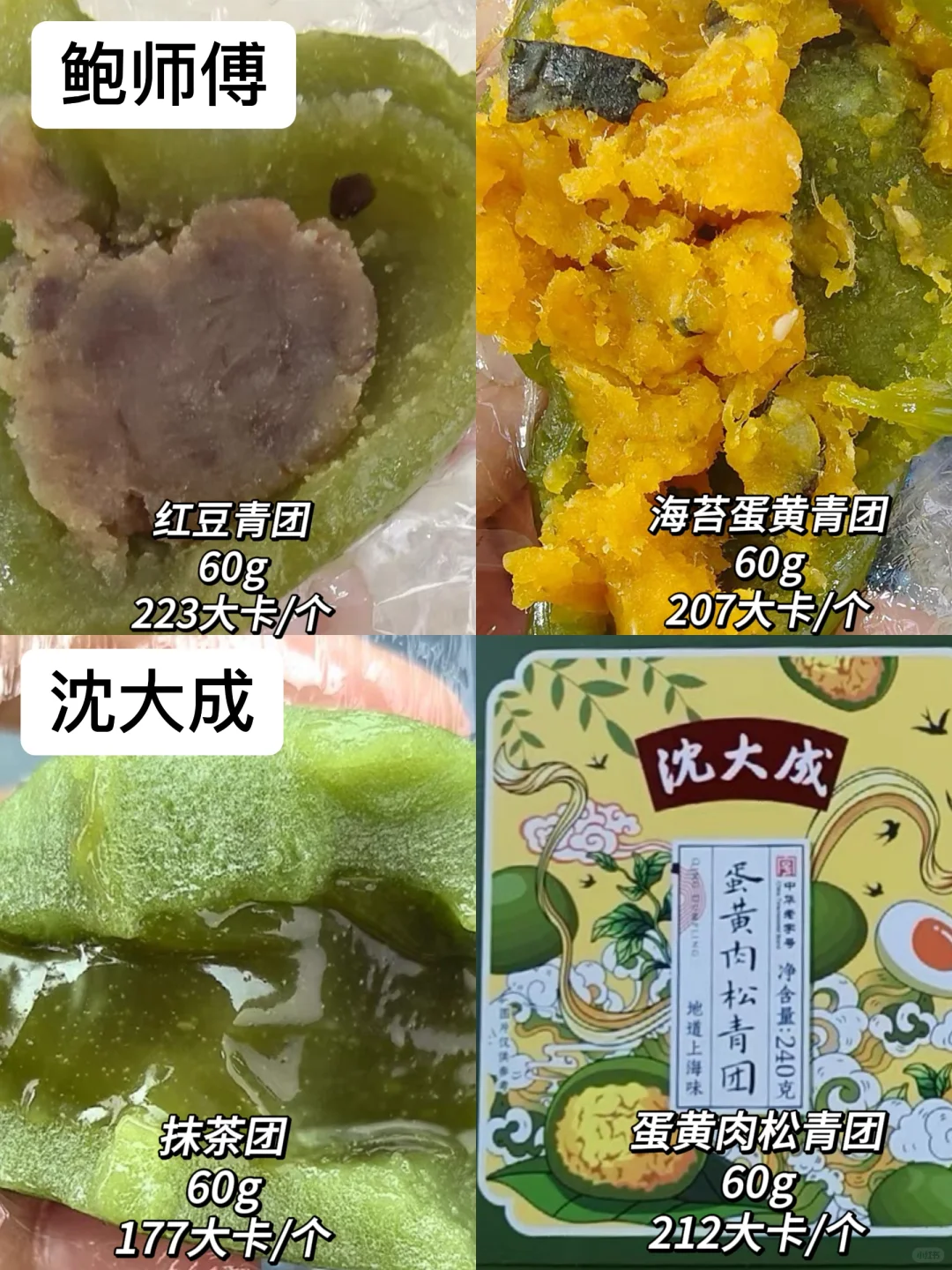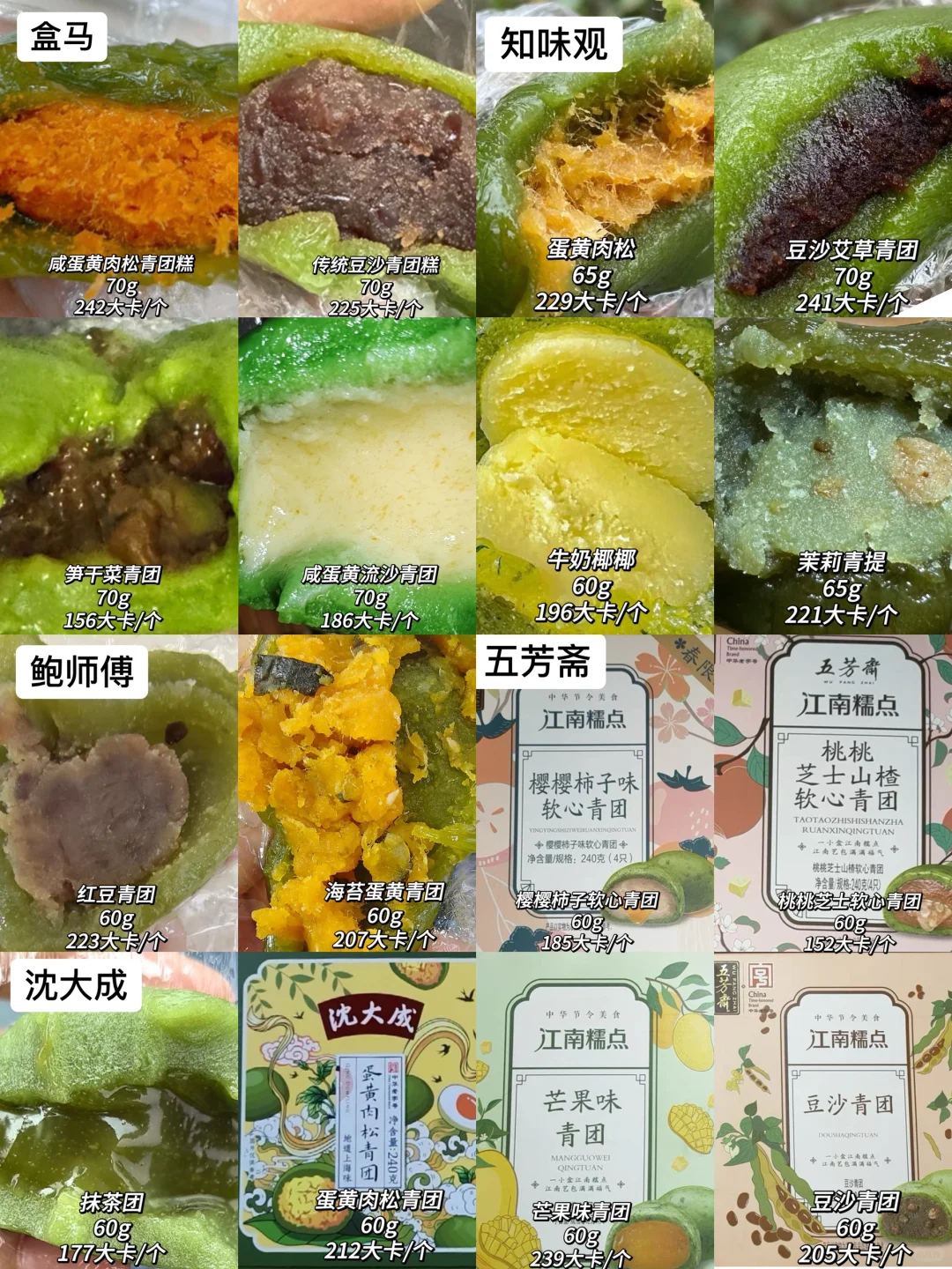 hello 大家好🙋 我是莹莹 一个喜欢研究外食不长胖的女孩👧 今天整理了热门品牌的青团热量~ 【盒马】 咸蛋黄肉松青团糕242大卡/个 传统豆沙青团糕225大卡/个 笋干菜青团156大卡/个 咸蛋黄流沙青团186大卡/个 【知味观】 蛋黄肉松229大卡/个 豆沙艾草青团241大卡/个 牛奶椰椰196大卡/个 茉莉青提221大卡/个 【五芳斋】 樱樱柿子软心青团185大卡/个 桃桃芝士软心青团152大卡/个 芒果味青团239大卡/个 豆沙青团205大卡/个 【鲍师傅】 红豆青团223大卡/个 海苔蛋黄青团207大卡/个 【沈大成】 抹茶团177大卡/个 蛋黄肉松青团212大卡/个 ✅总体青团都在200-220大卡一个,其中咸口热量是最低的,其次是水果味。传统豆沙和肉松这俩热量差不太多。控制在500大卡的姐妹可以选择吃一个咸口青团当作碳水搭配蔬菜和肉类就算是比较均衡的一餐啦~ 好啦,本期的分享就到这啦 我们下期再见👋