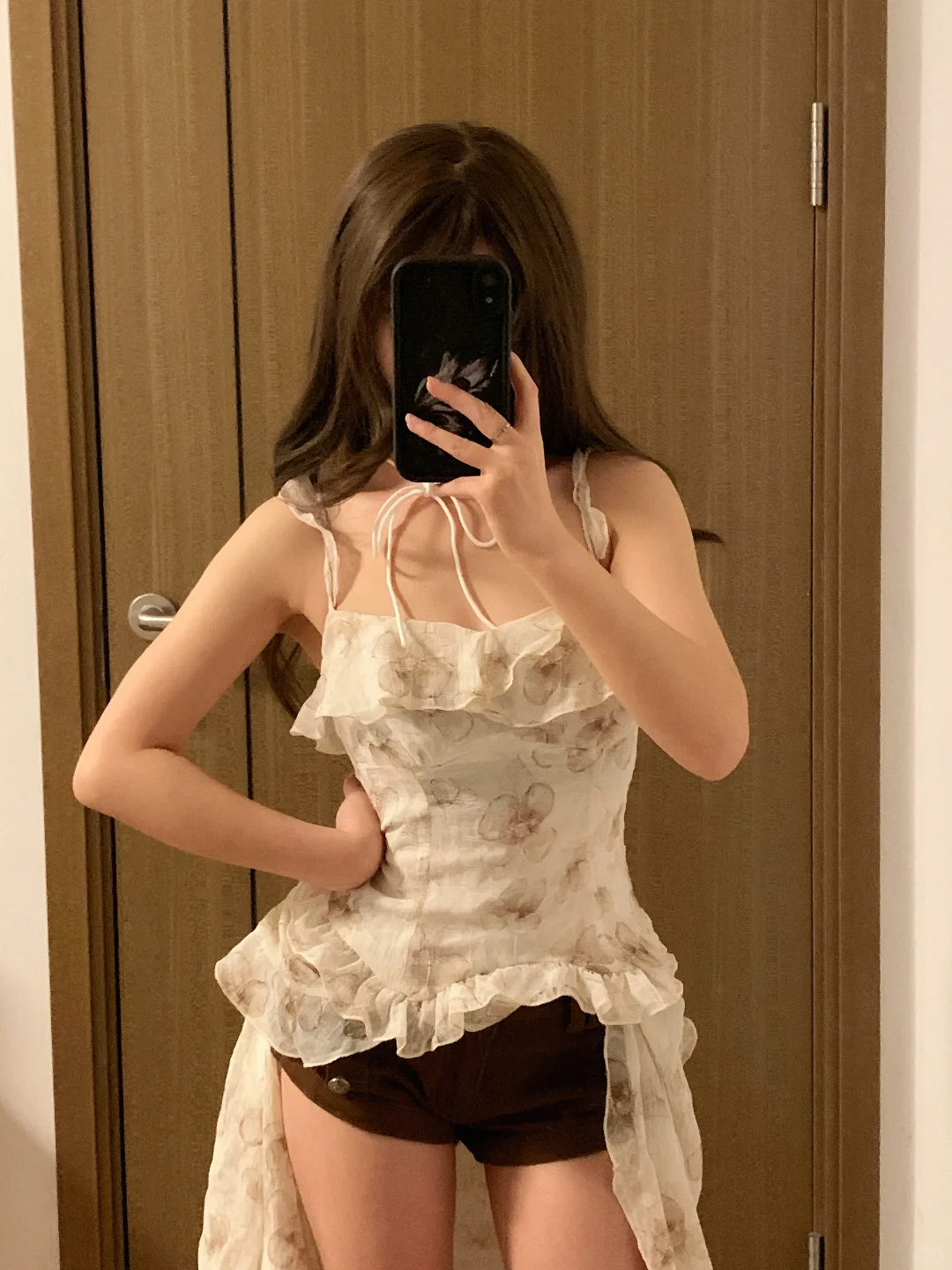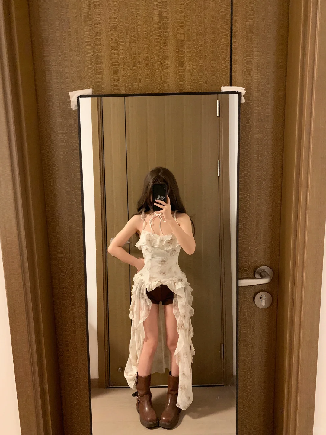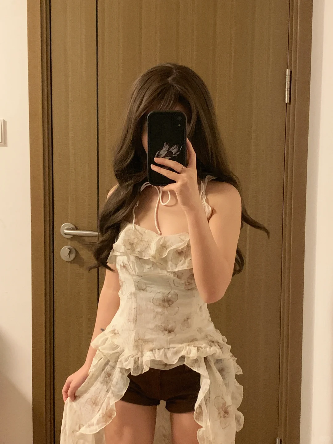 荷叶边碎花不规则吊带裙➕辣妹棕色低腰短裤 上衣好好看呀 上身就是美式复古辣妹
