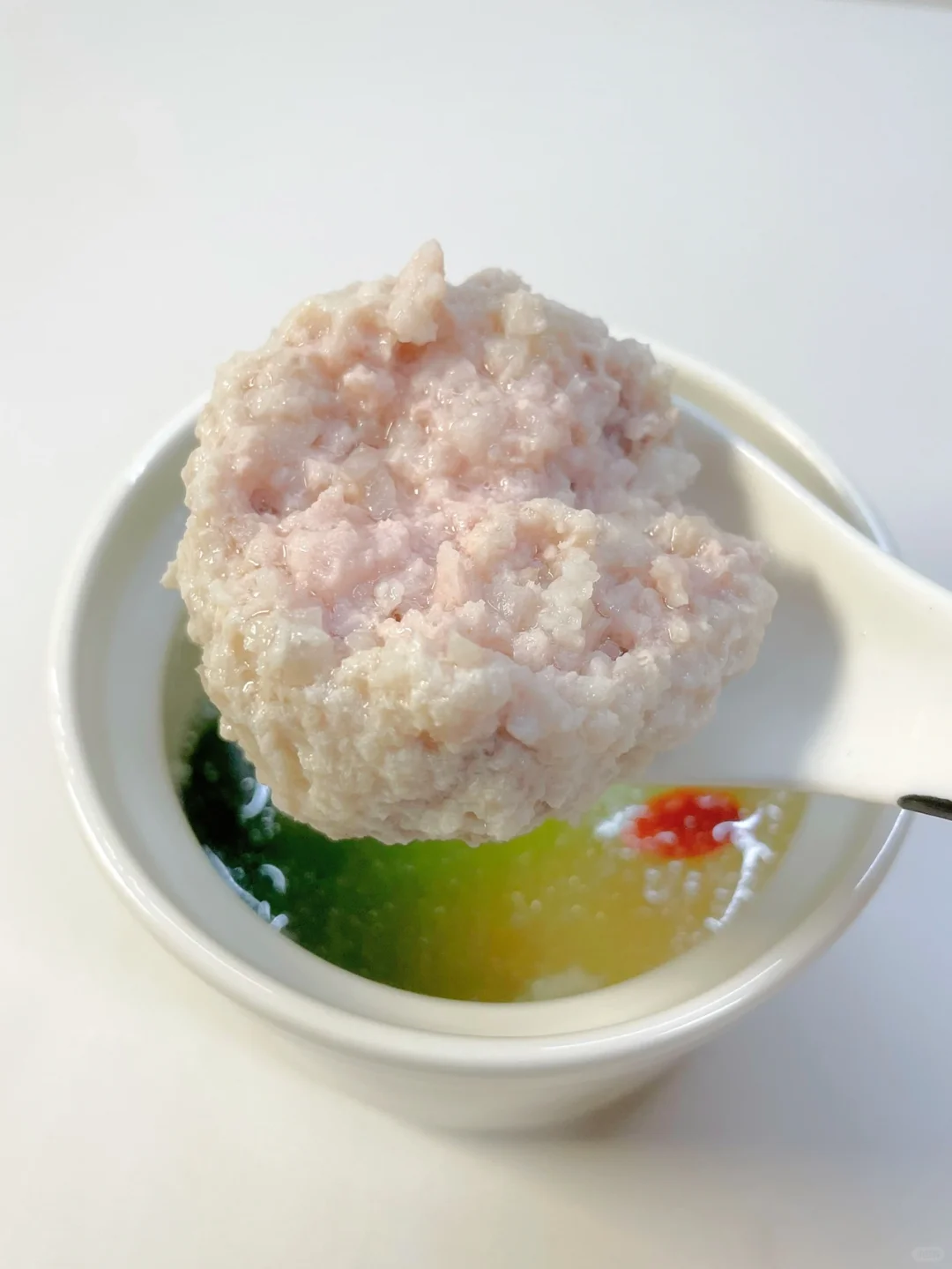 2️⃣肉沫加藕丁、少许盐、三分之一个蛋清和少许淀粉。然后少量多次加入葱姜水,顺时针搅拌至上劲,再反复摔打肉馅成团;