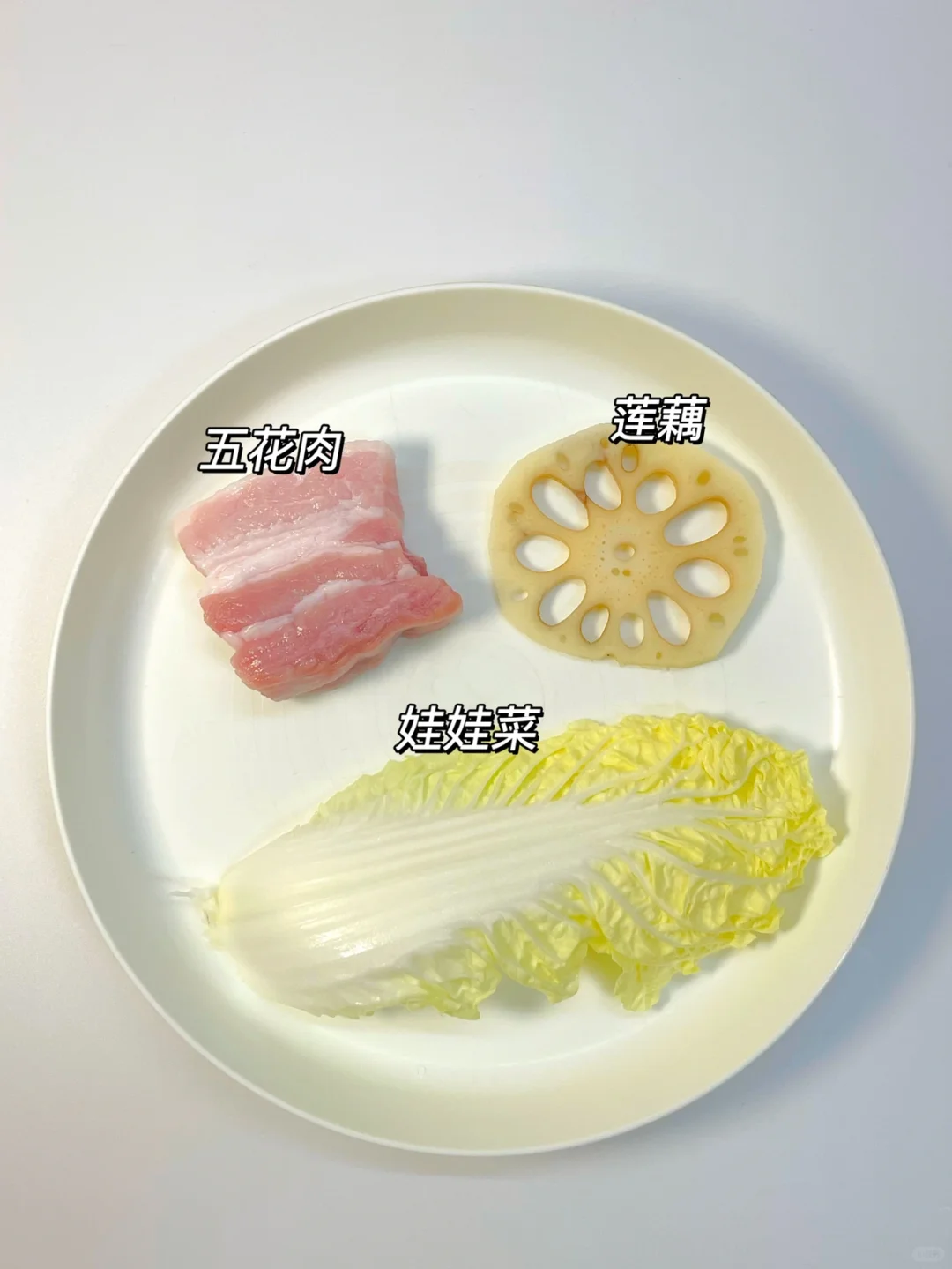 1️⃣五花肉120克,莲藕四片,娃娃菜两片,青菜两片。