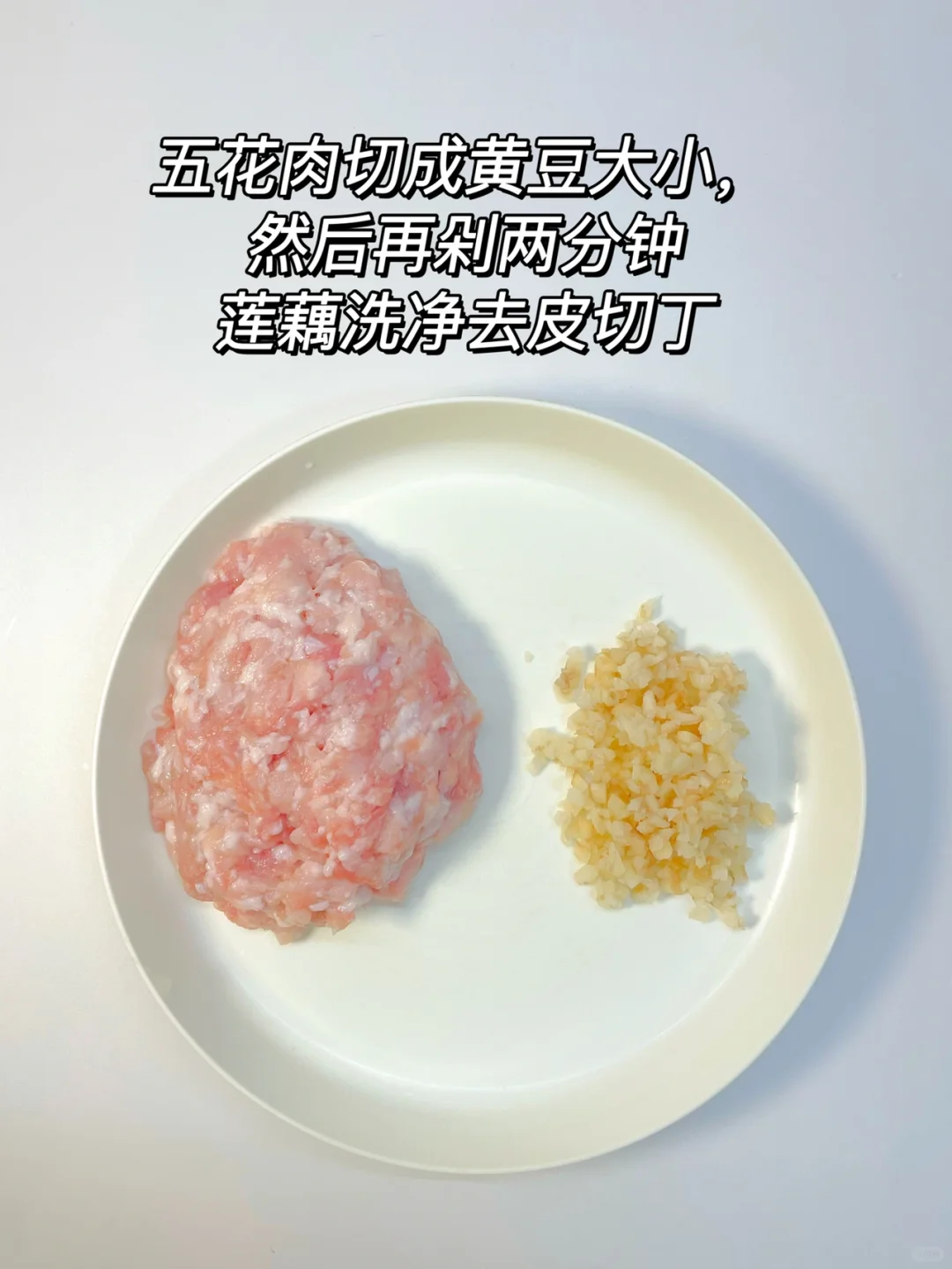 1️⃣五花肉切成黄豆大小,然后再剁两分钟,莲藕洗净切丁,葱姜切碎泡入温水十五分钟;