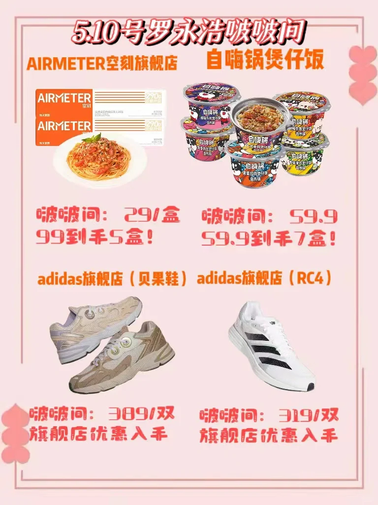 🔍你想要的吃用穿就在老罗5月10号交个朋友啵啵间! 日常用品、便利主食、运动鞋,美妆护肤,应有尽有,低价登场只为你能再次回头!🤤 母亲节将至,想必你也在焦头烂额寻找🎁,来老罗啵啵间,相信有你在寻找的🎁! 我做好攻略了,你只需要带着我的攻略5月10号准时到达罗永浩啵啵间!!👈 啵啵间时间预告:5月10-5月15日超大额定金红包雨(可叠加) 5月15日-20日18:00付定金 20日20:00-28日 付尾款+现货 啵啵间强力放价,不容错过!