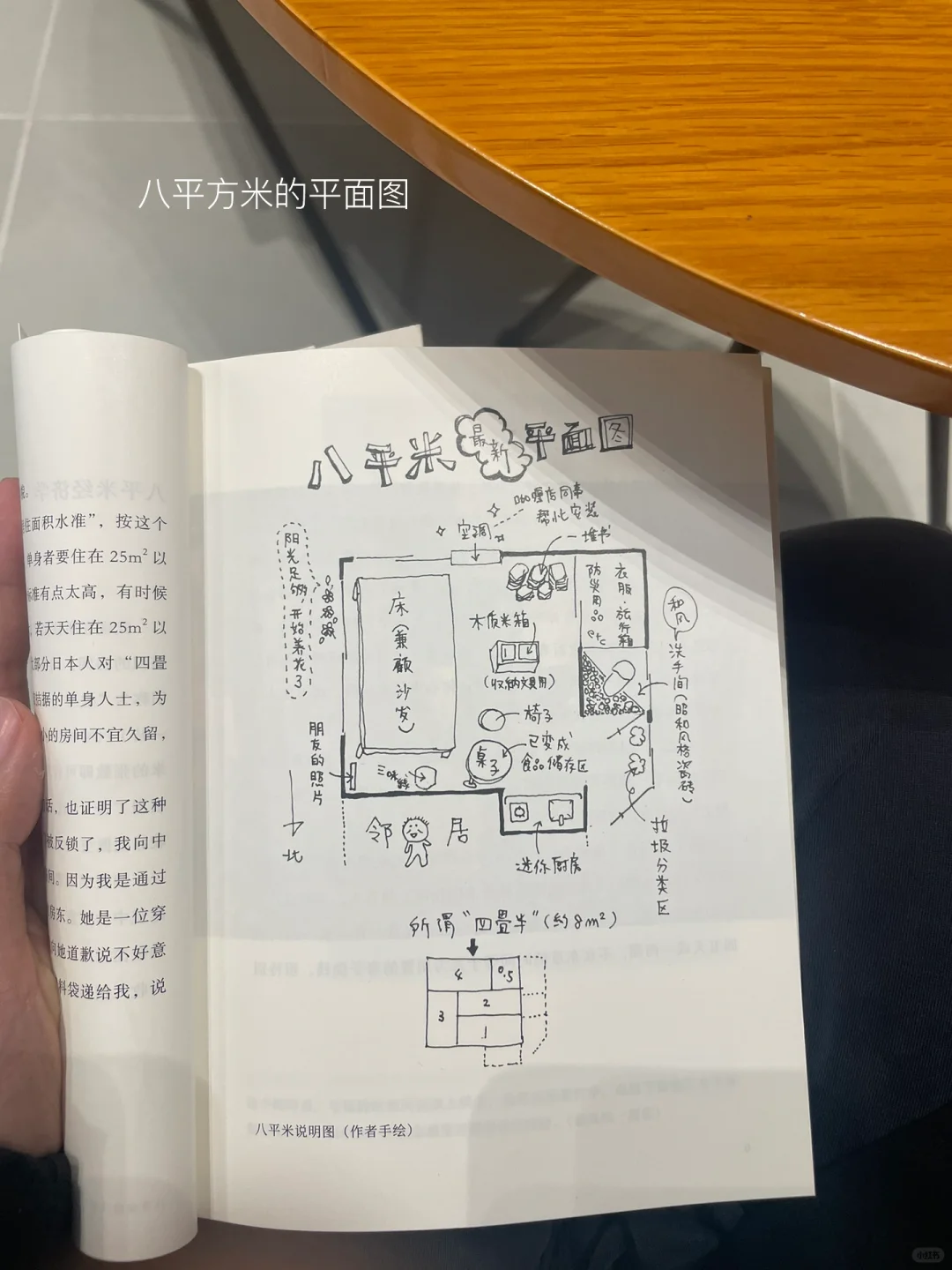 居住在八平米的空间,只有四张半榻榻米大,没有厨房、浴室、洗衣机、冰箱,因为该有的功能没有,但作者却把自己的生活向外无限延伸。