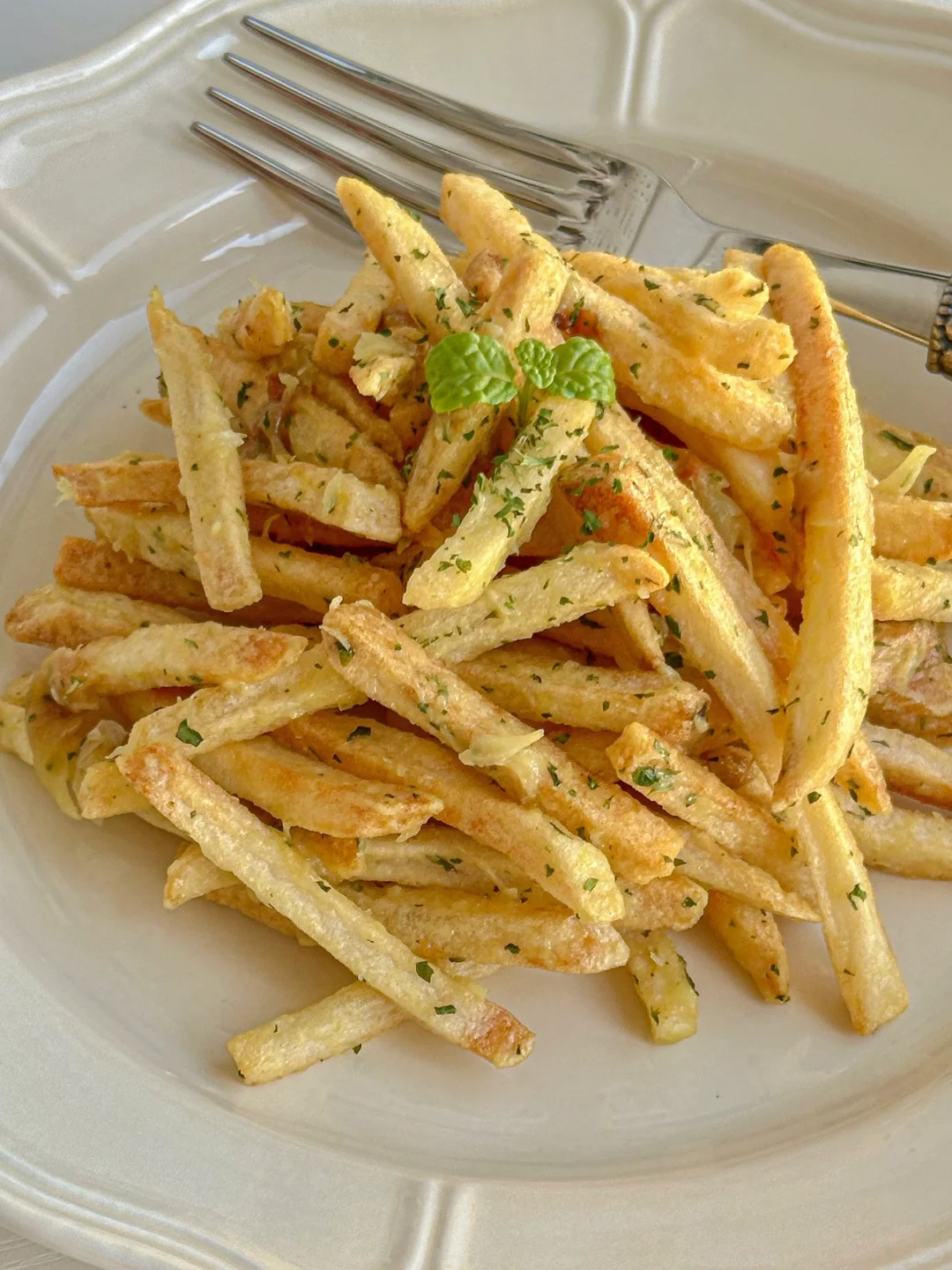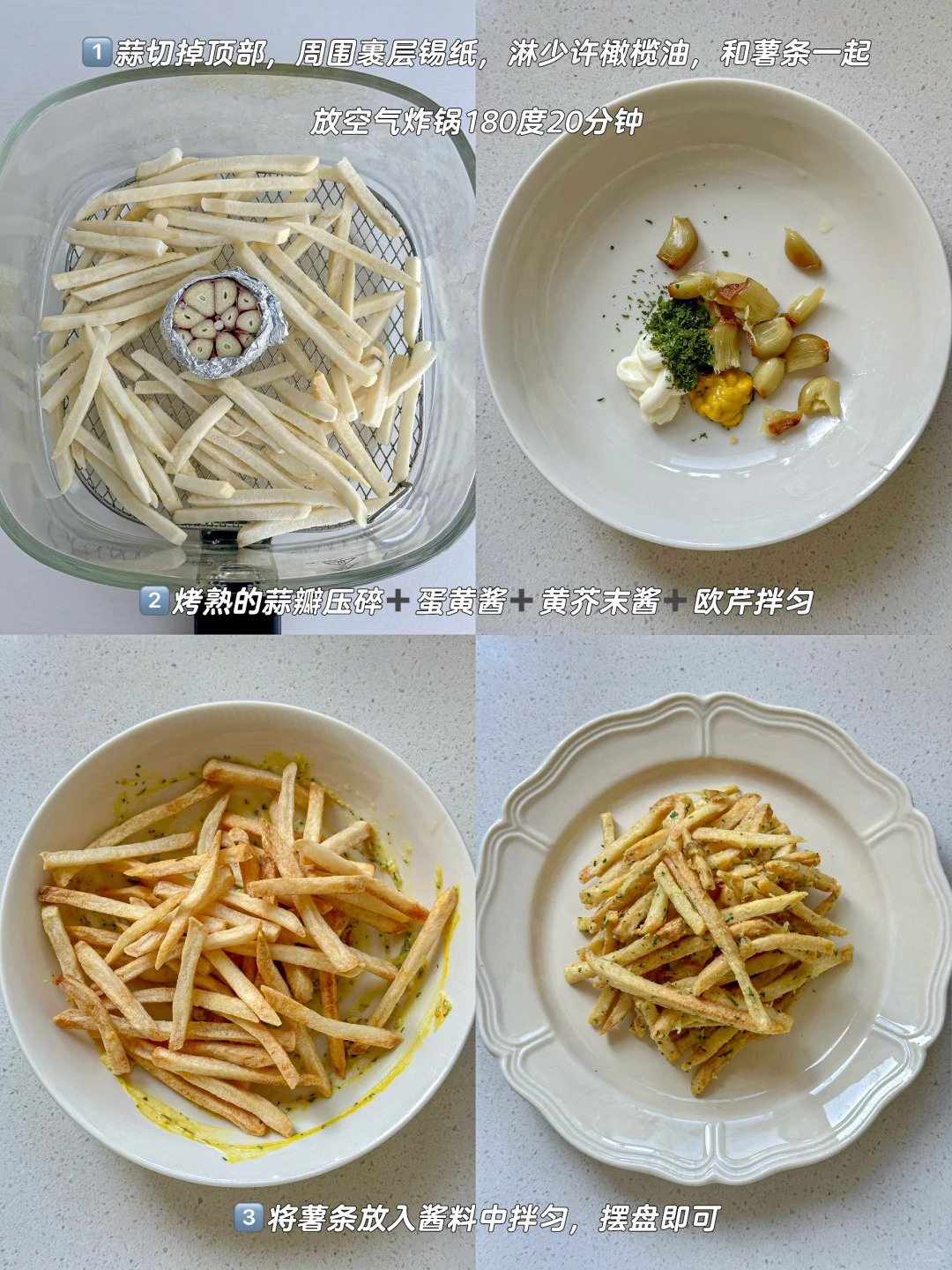 2️⃣烤熟的蒜瓣压碎➕蛋黄酱➕黄芥末酱➕欧芹拌匀3️⃣将薯条放入酱料中拌匀,摆盘即可