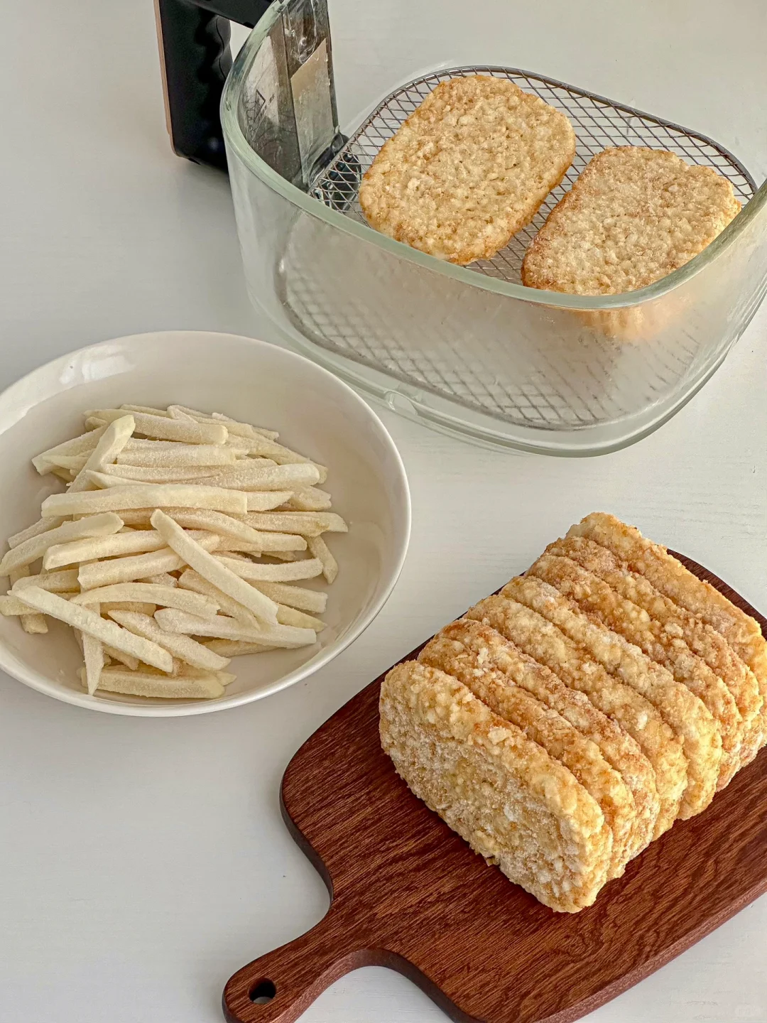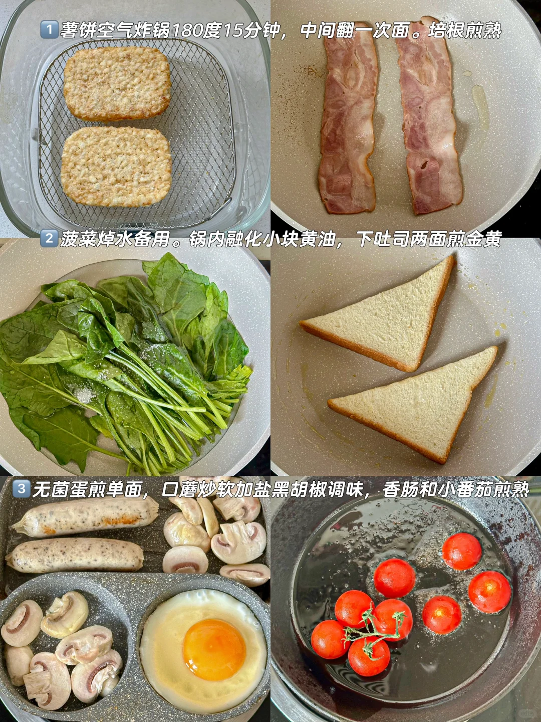 1️⃣薯饼空气炸锅180度15分钟,中间翻一次面。培根煎熟