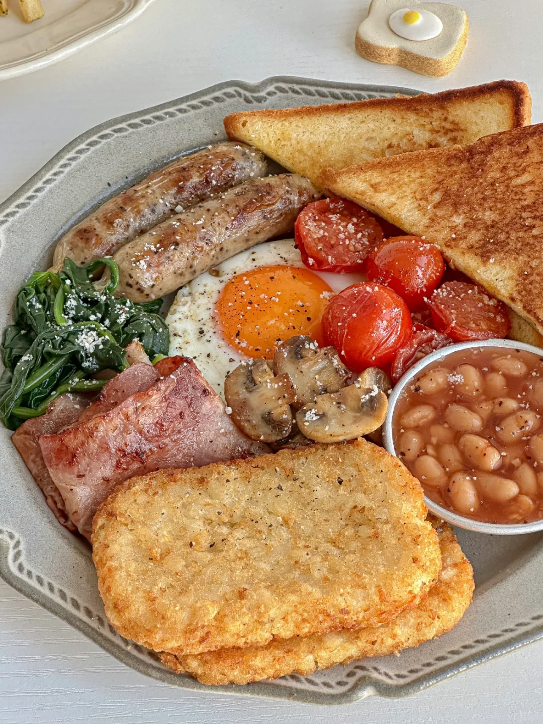 薯饼|小番茄|菠菜|培根|香肠|无菌蛋|焗豆|吐司|黄油|口蘑