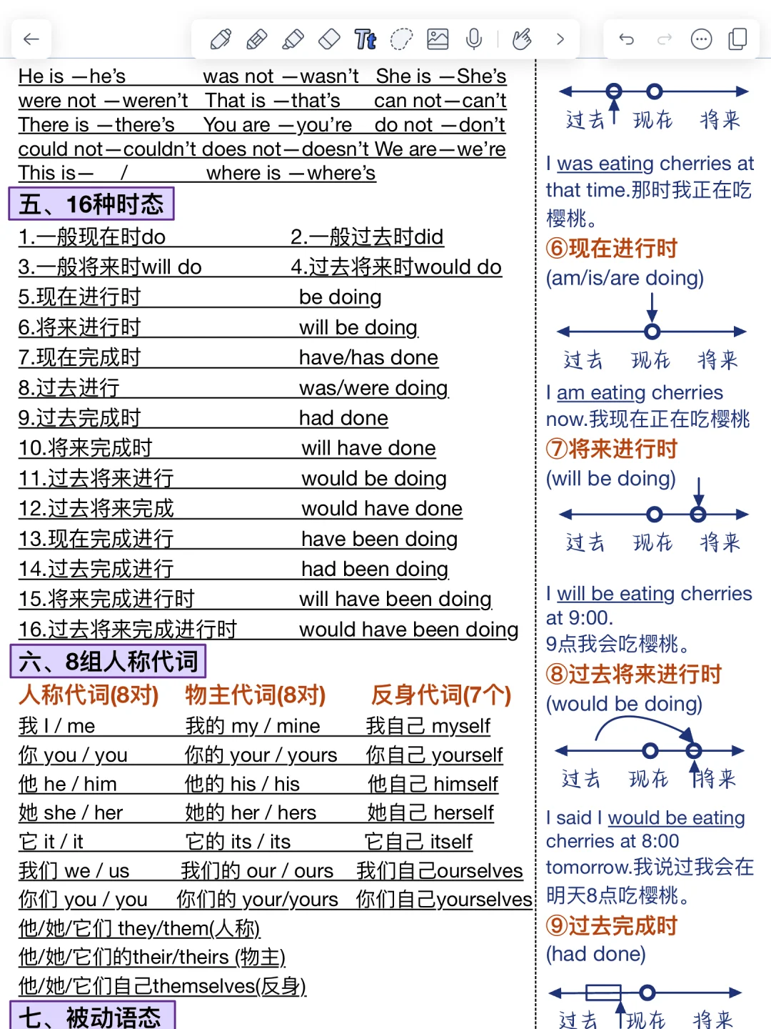 ①基础知识 ②9种单词词性 ③20个疑问代词 ④常见英语缩略词 ⑤16种时态 ⑥8组人称代词 ⑦时态的被动语态 ⑧8种句子结构 ⑨11个句子成分 ......