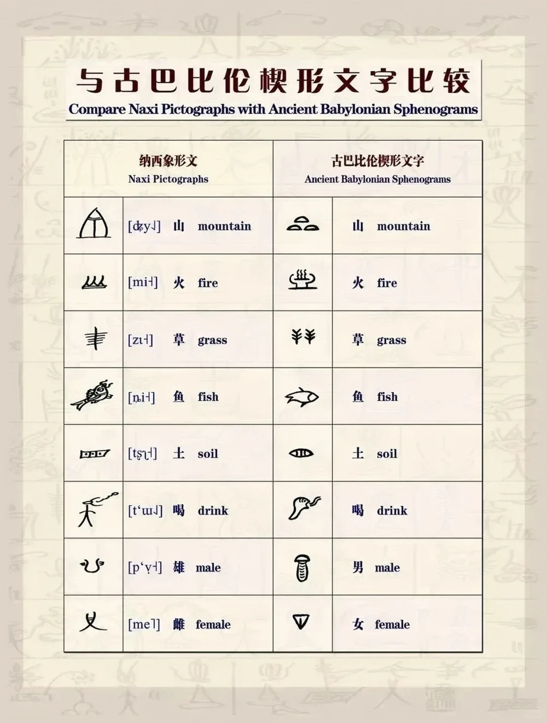 纳西象形文与古巴比伦图形文字、埃及象形文字、殷商甲骨文、玛雅文字等古典文字有着内在机构的相似性,它们或演变成字母文字,或消失在历史长河中,而纳西象形文却流传至今。