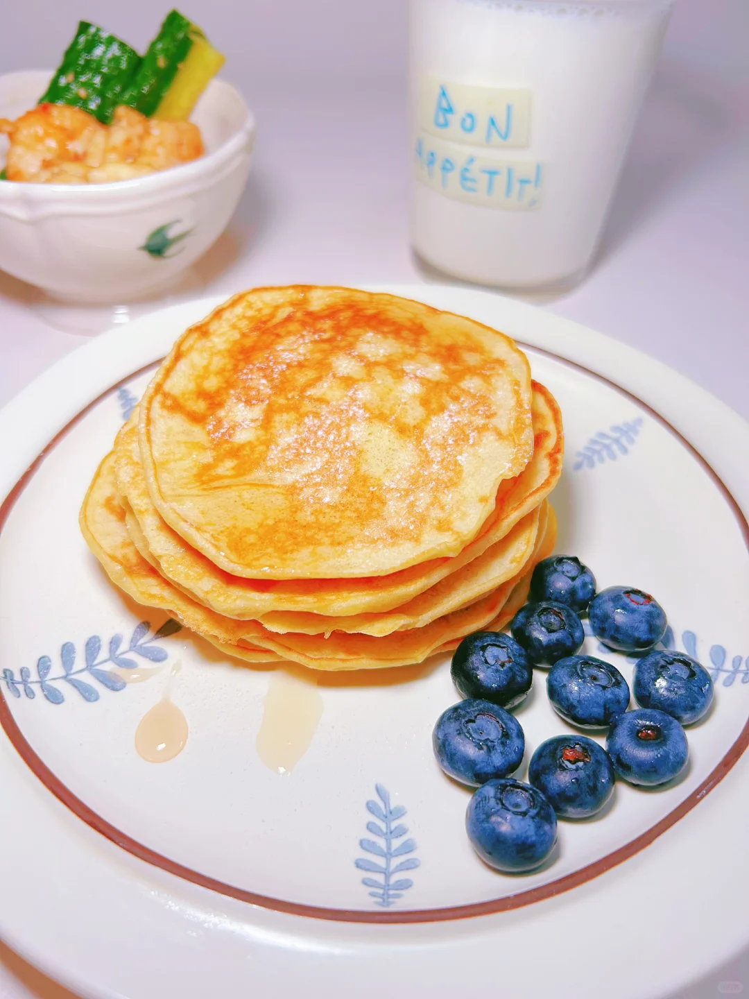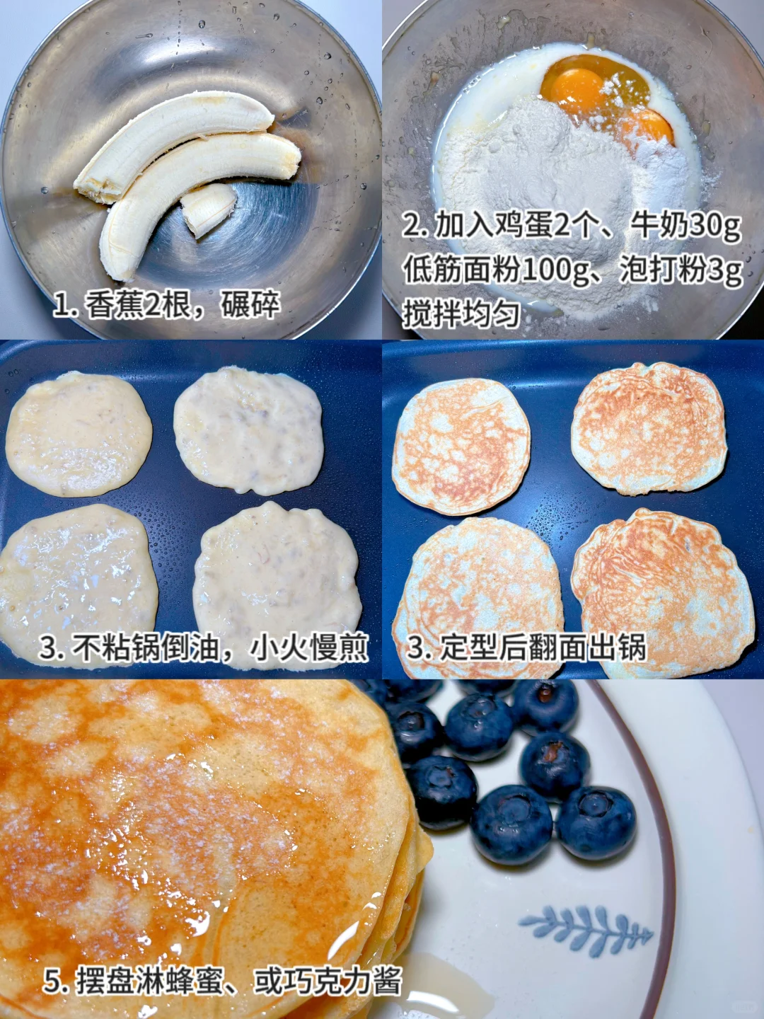 儿子们连吃3天的香蕉松饼, 简单好做,推荐妈妈们试试。 🌈简单营养的早餐搭配公式 1. 谷薯类:低筋面粉《香蕉松饼》 2. 肉蛋类:虾仁《捞汁虾仁黄瓜》、鸡蛋《香蕉松饼》 3. 果蔬类:黄瓜《捞汁虾仁黄瓜》、蓝莓 4. 豆奶类:牛奶 🌈做法《香蕉松饼》 1.熟香蕉2根,碾成泥状。 2.加入低筋面粉100g、鸡蛋2个、牛奶30g、泡打粉3g,搅拌均匀。 3.不粘锅小火,刷油,倒入适量面糊,定型后翻面,约30秒出锅。 4.淋蜂蜜或巧克力酱,增加风味。