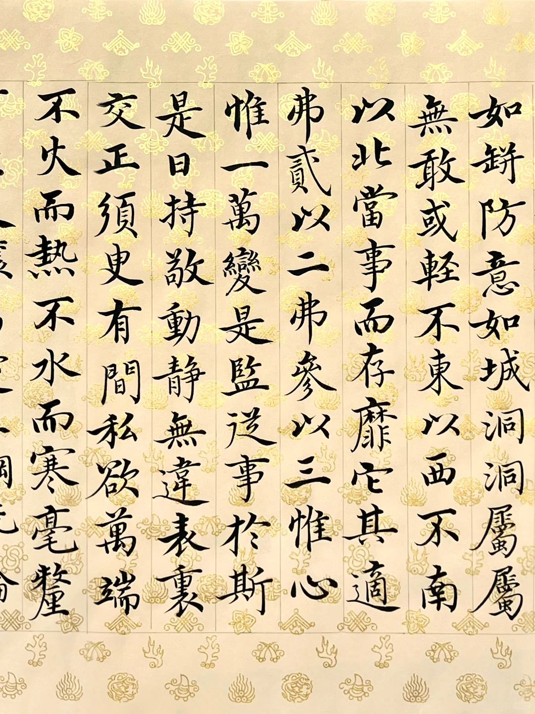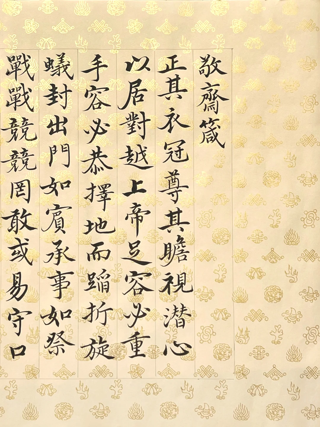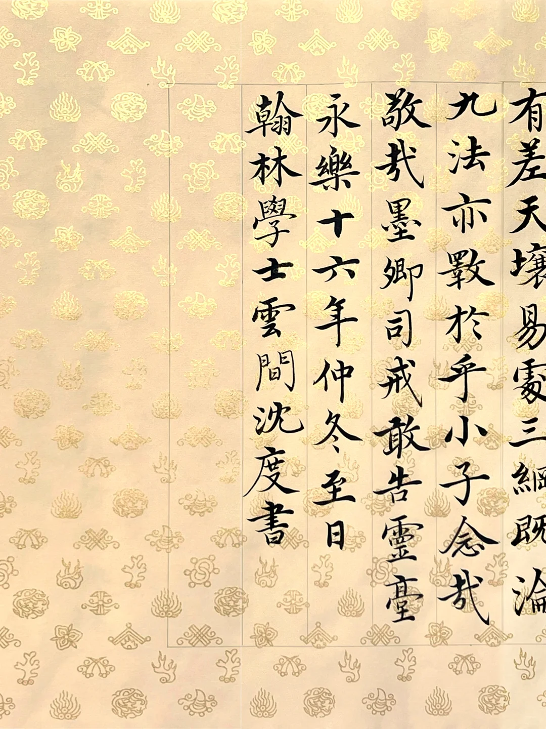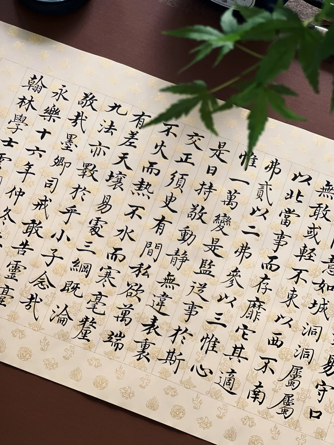 刻意练习后,前两个似乎沾了边儿,可气质雍容还把握不住。通临时,便拿出爱不释手的宋宫内府描金纸,正好体现雍容端严的气质。这纸复刻了宋徽宗《行书蔡行敕卷》原件,审美独到又简约高雅。