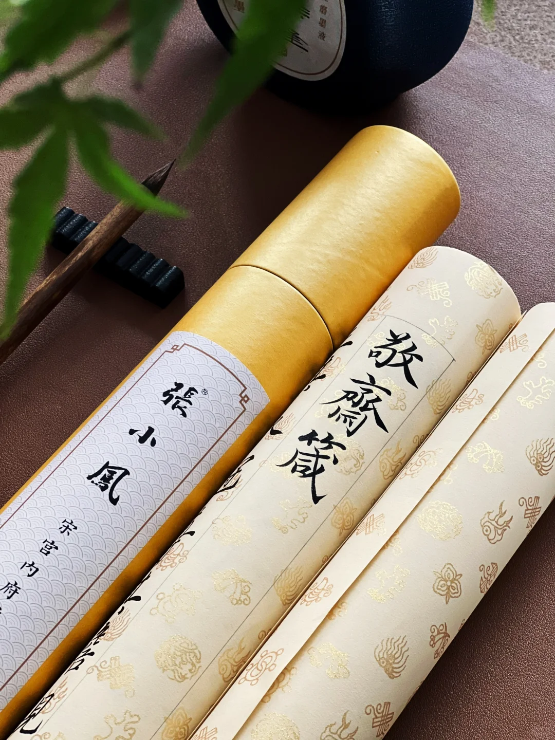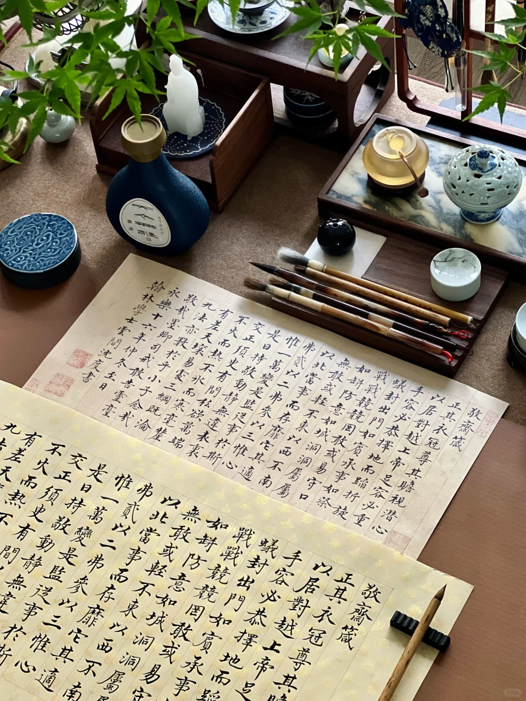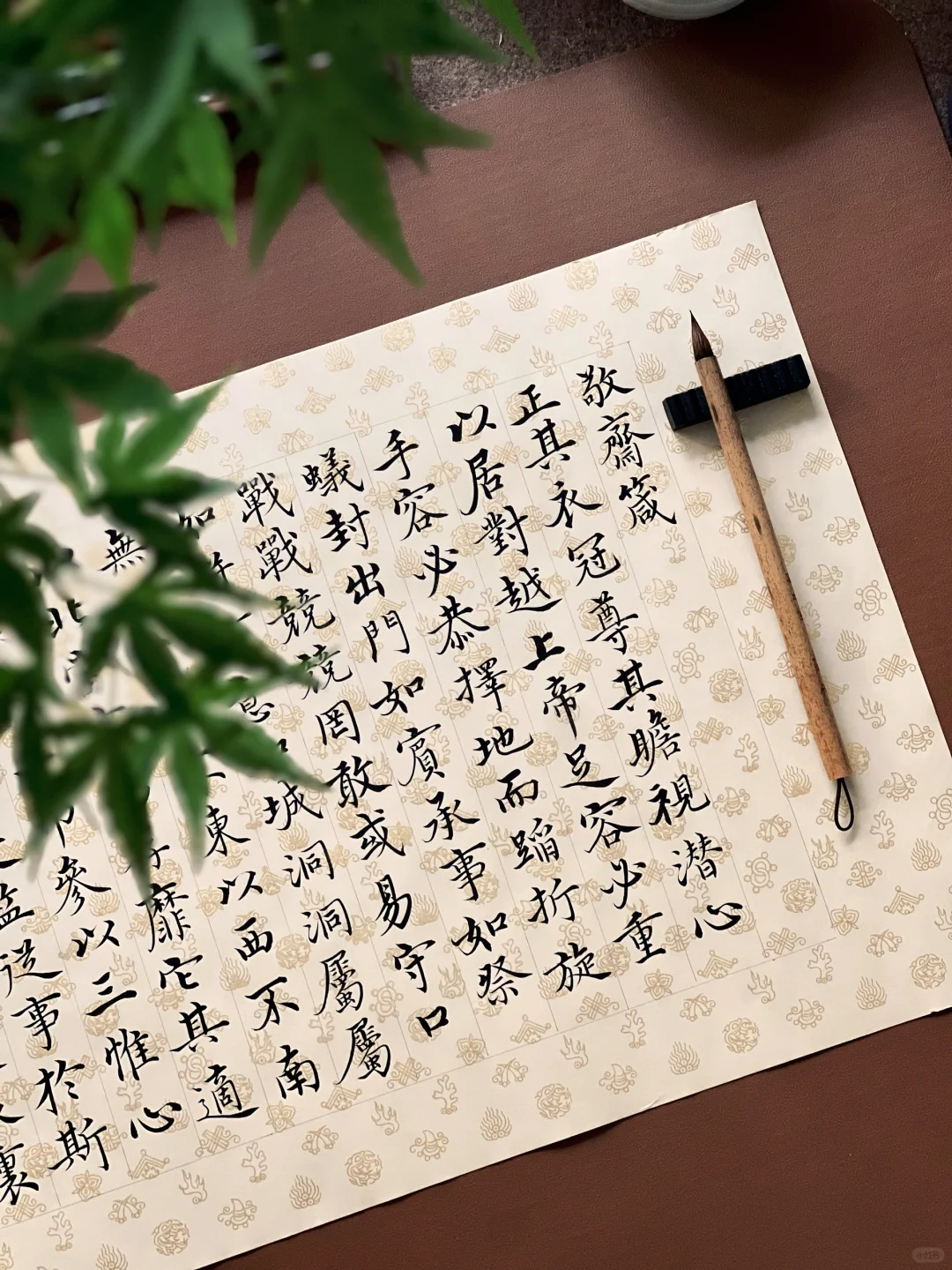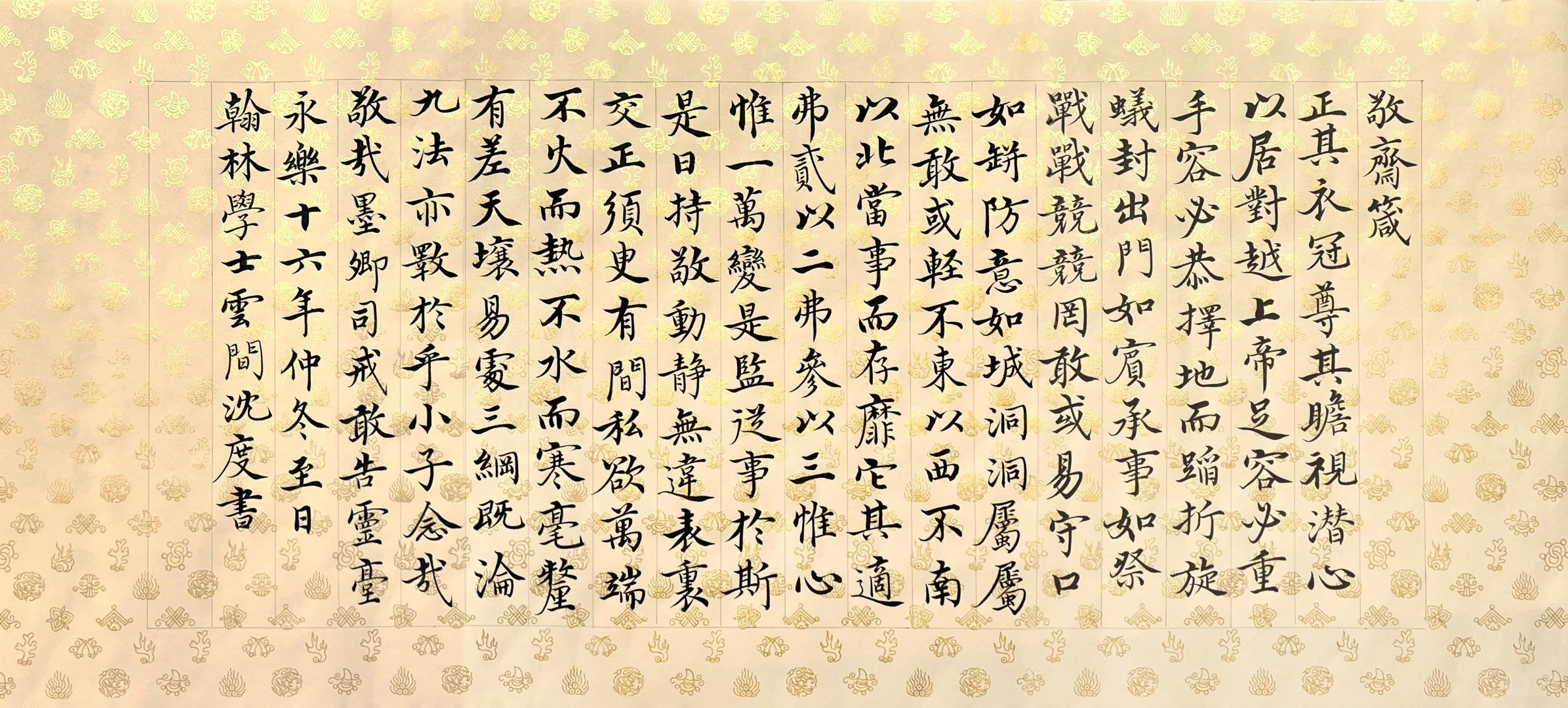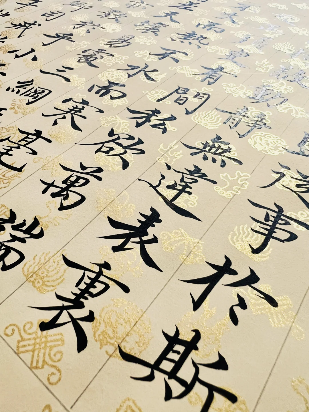 刻意练习后,前两个似乎沾了边儿,可气质雍容还把握不住。通临时,便拿出爱不释手的宋宫内府描金纸,正好体现雍容端严的气质。这纸复刻了宋徽宗《行书蔡行敕卷》原件,审美独到又简约高雅。