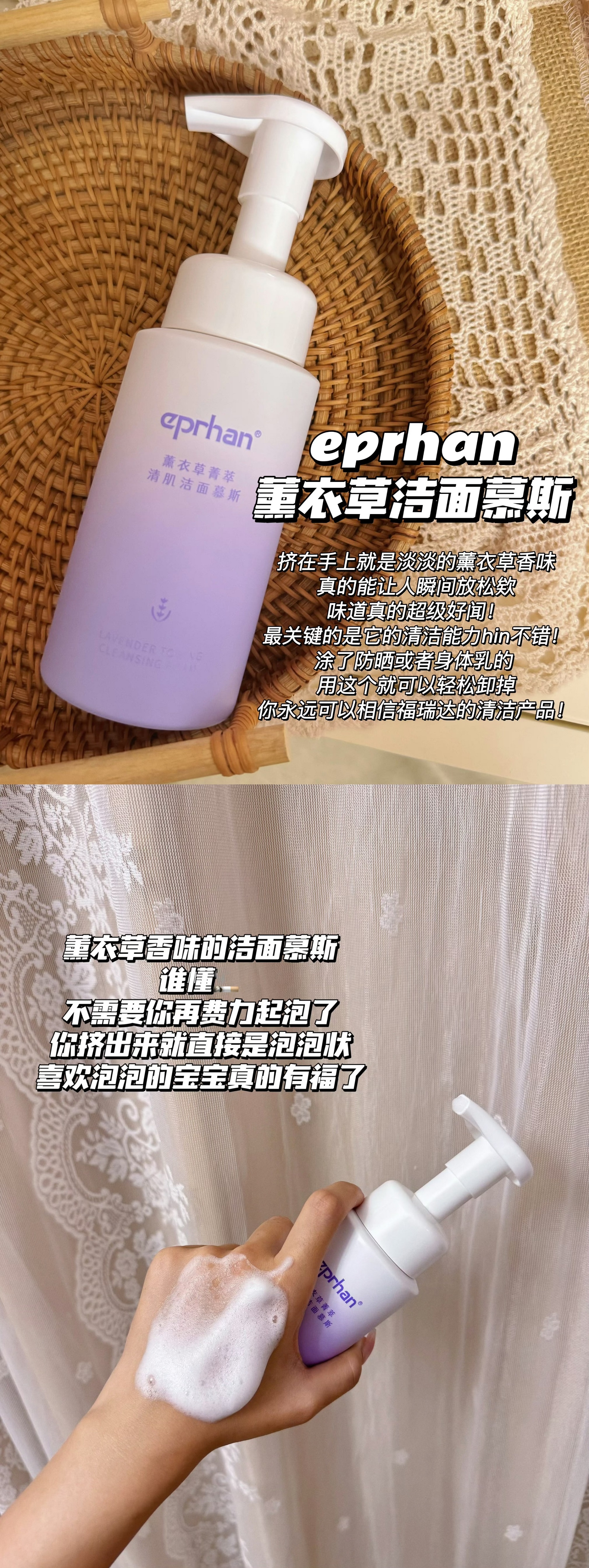 【薰衣草洁面慕斯】挤出来直接就是泡泡状,是加了玻尿酸的洁面。巨适合干皮、敏皮,因为很温和还很滋 润。能卸掉防 晒,味道还是很好闻的薰衣草。