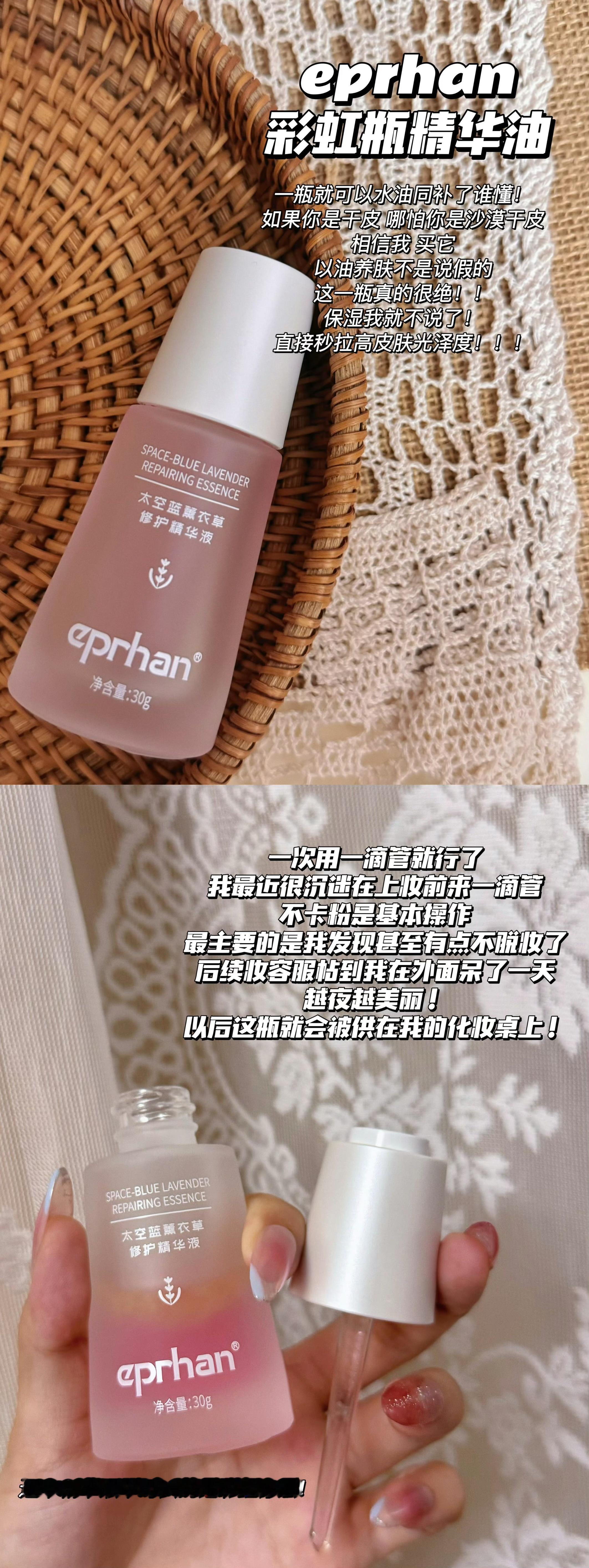 【彩虹瓶精华】巨适合干皮的精 华!我甚至可以直接说本干皮我没用过这么清爽这么轻薄的“油”!谁懂啊!不愧是它们家大王 牌。福瑞达的玻 尿 酸+伊帕尔汗的薰衣草。