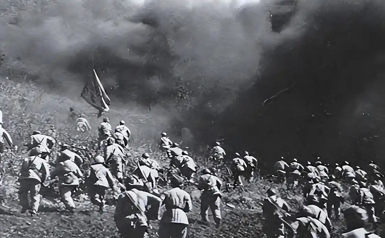 轰炸过后,美军步兵在坦克的掩护下发起集团冲锋,黑压压的士兵如同潮水般涌向阵地。