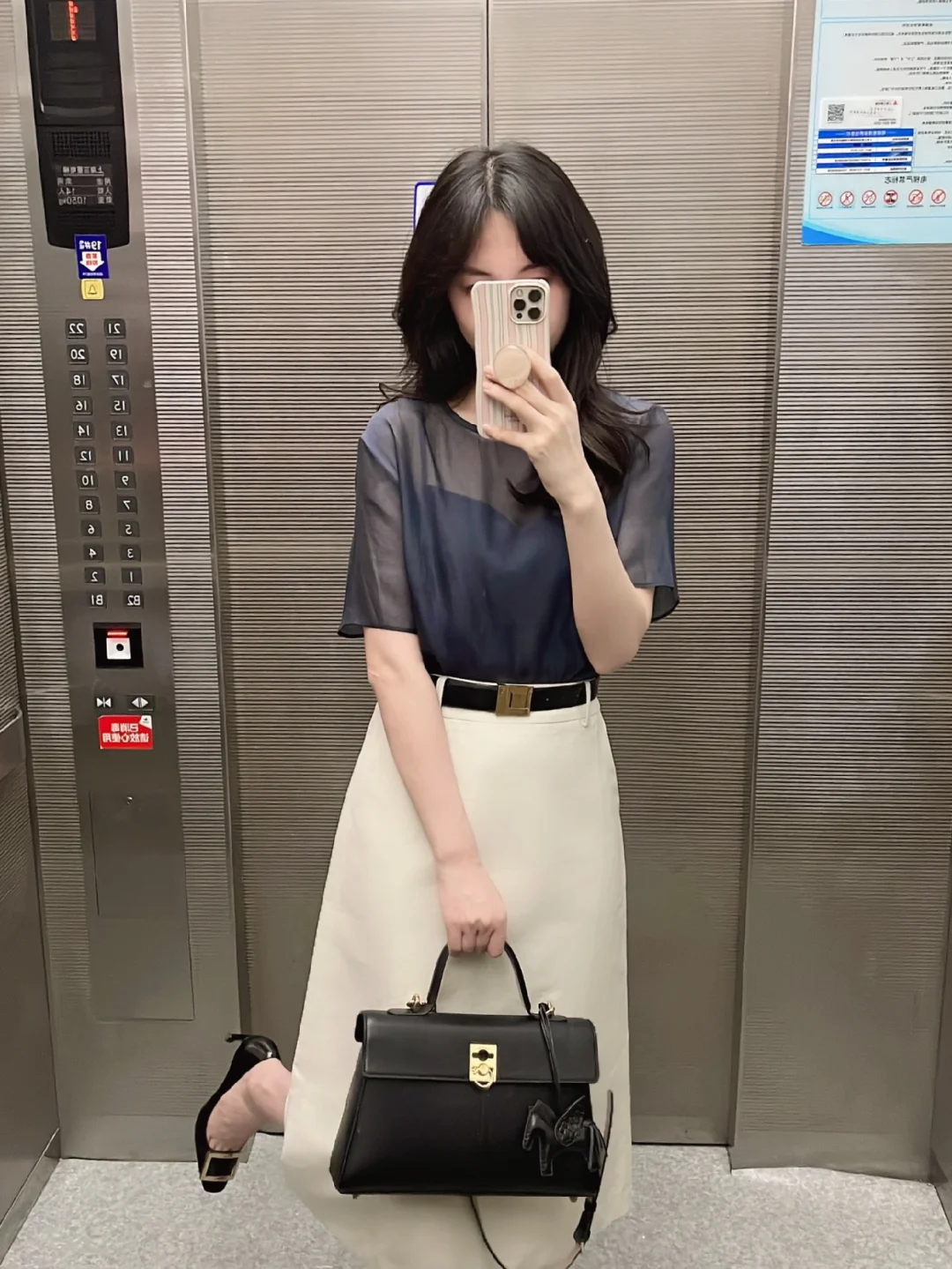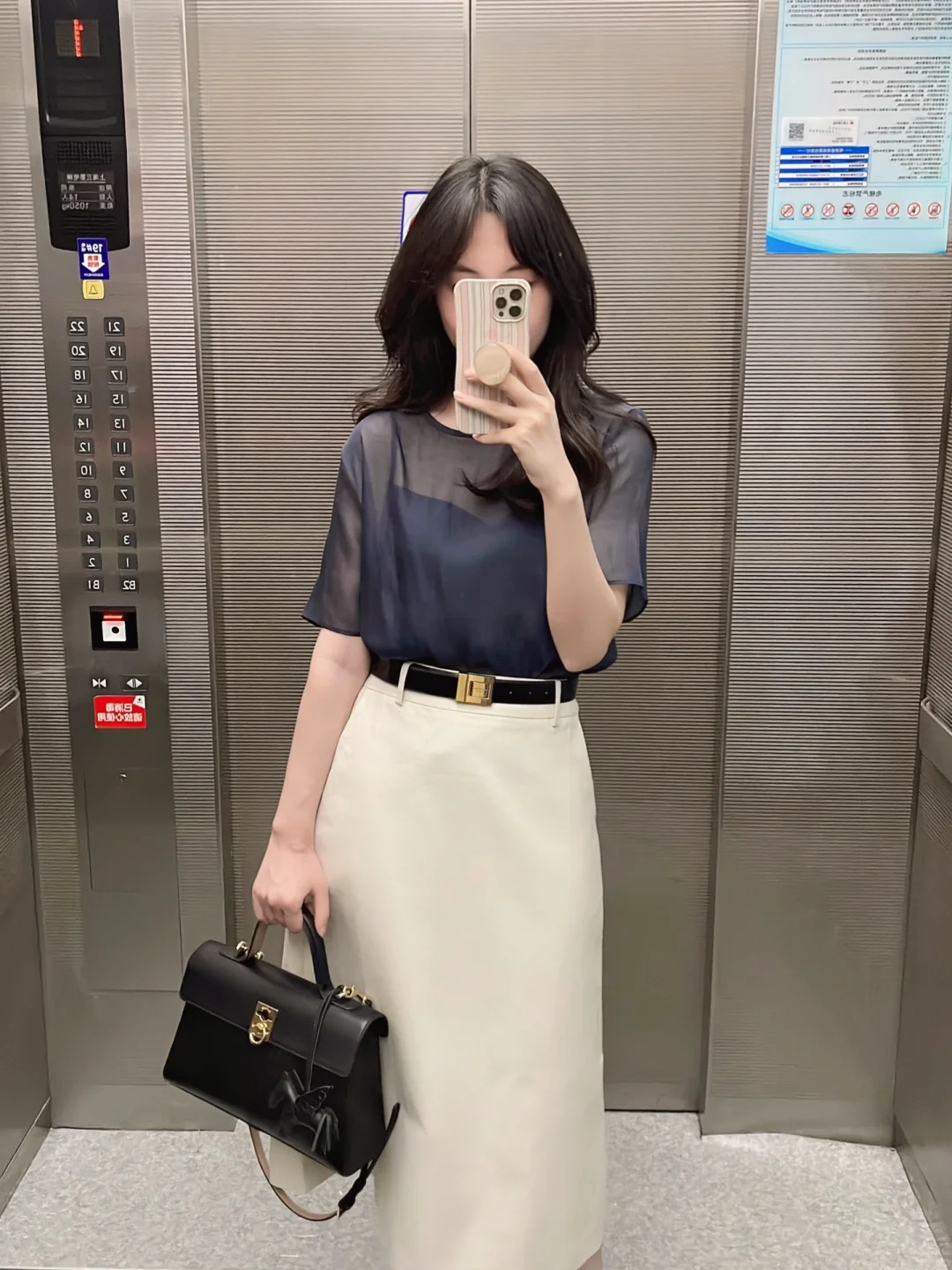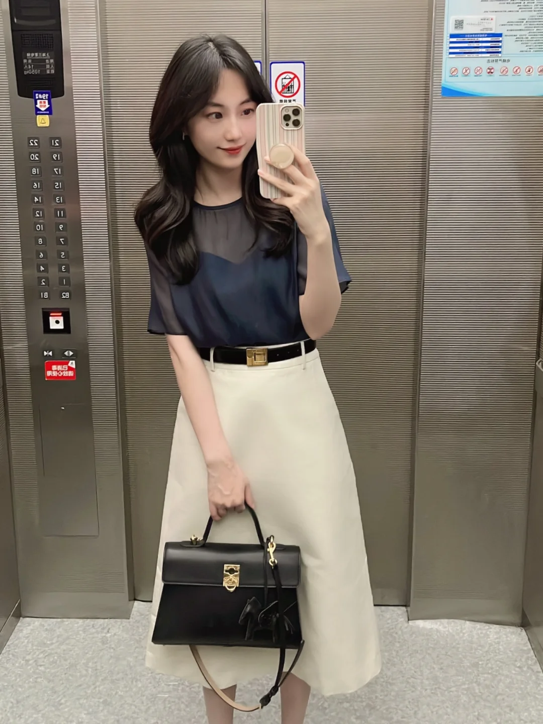 初夏通勤☕藏蓝上衣➕米色半裙 气质感满满~