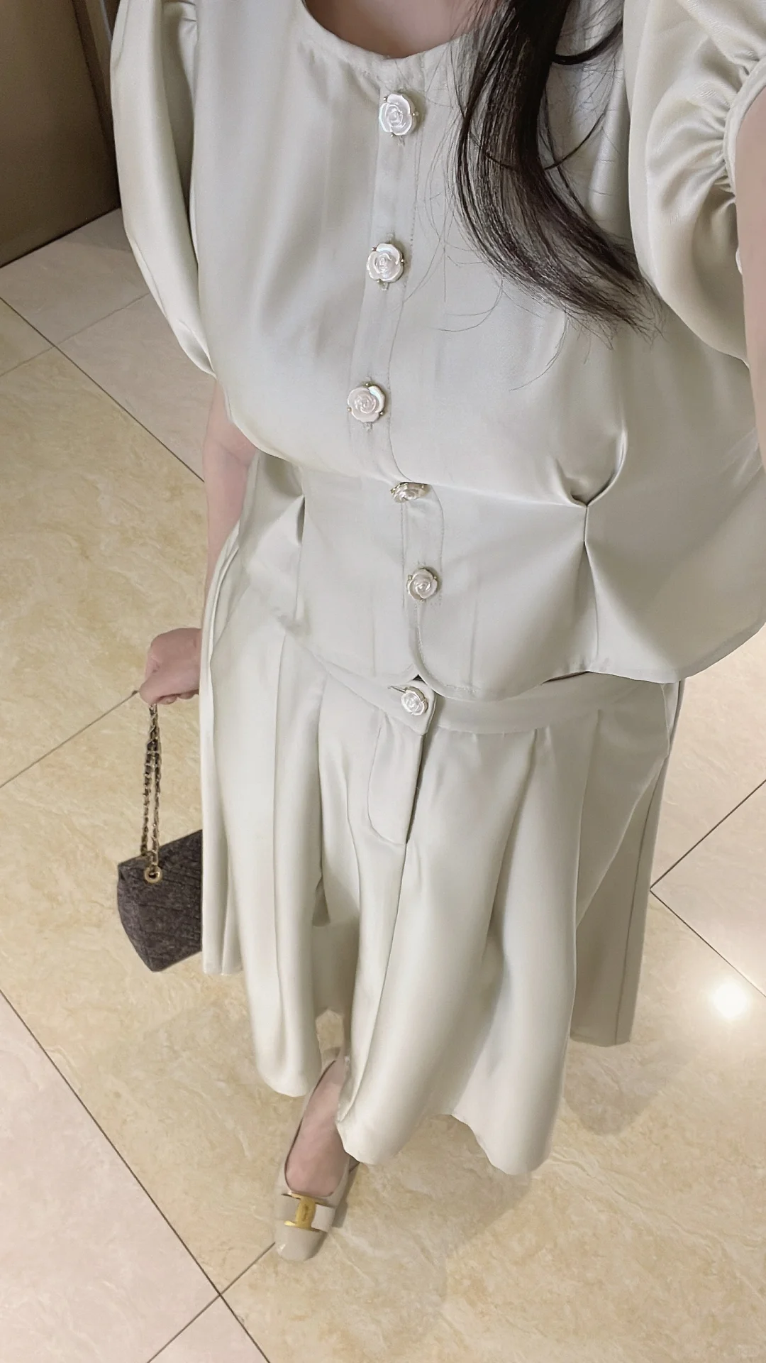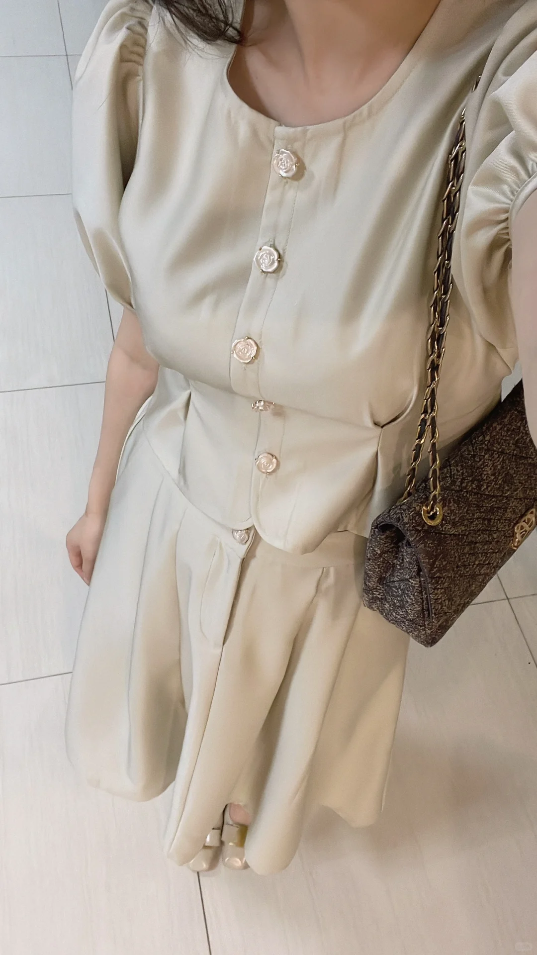 今天穿了牛油果色🥑色套装腰部有系带,料子非常垂,非常有质感的面料,整体温柔又显瘦,非常适合通勤的一套~~小扣子也非常精致~~