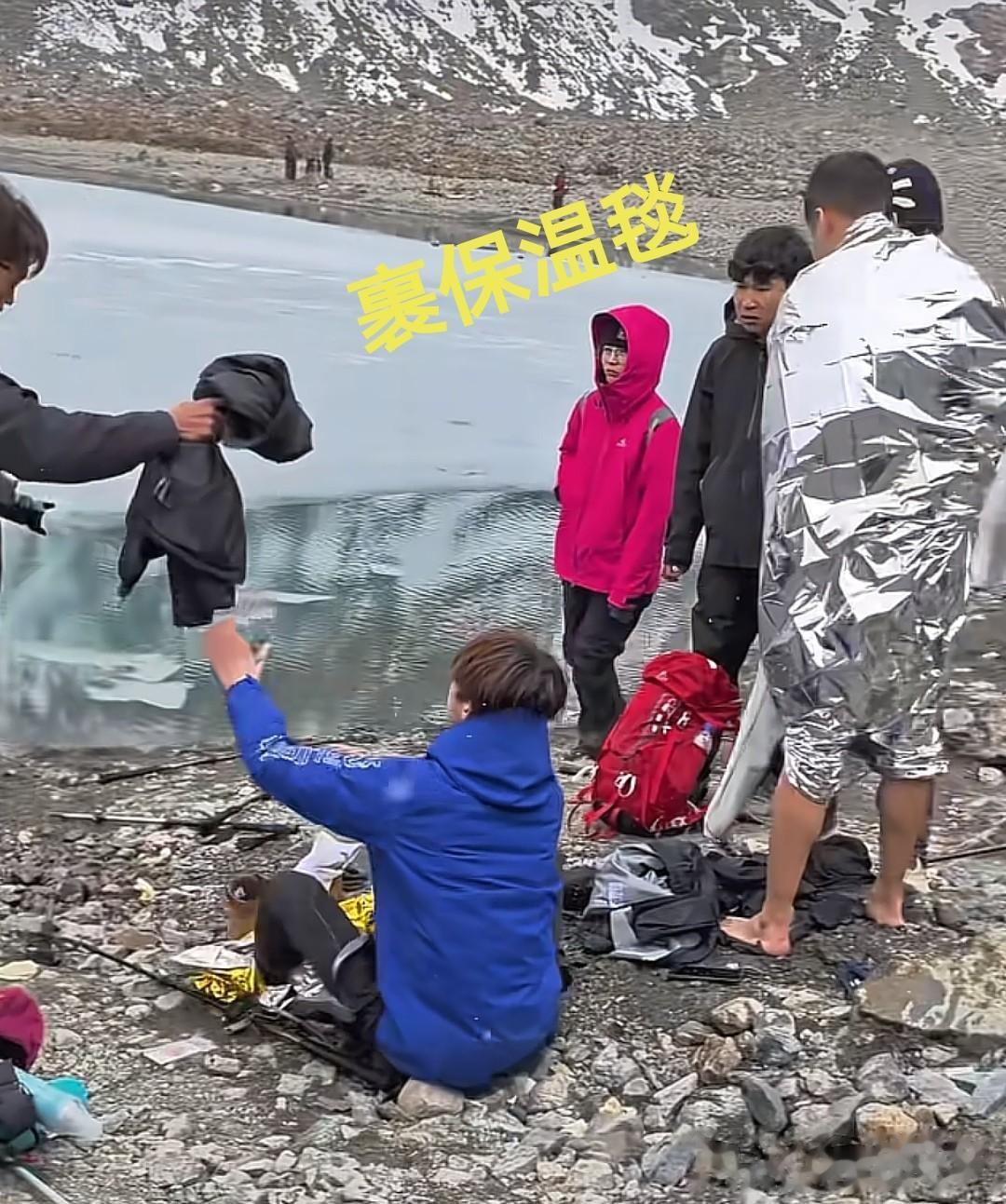 最后岸边的人拉都拉不回来,而且旁边的冰面太薄了,无法承受身体重量,还没到岸边,冰面就裂了,只能落水游上岸,上山气温低,可想而知保暖衣服都湿了,有多难受