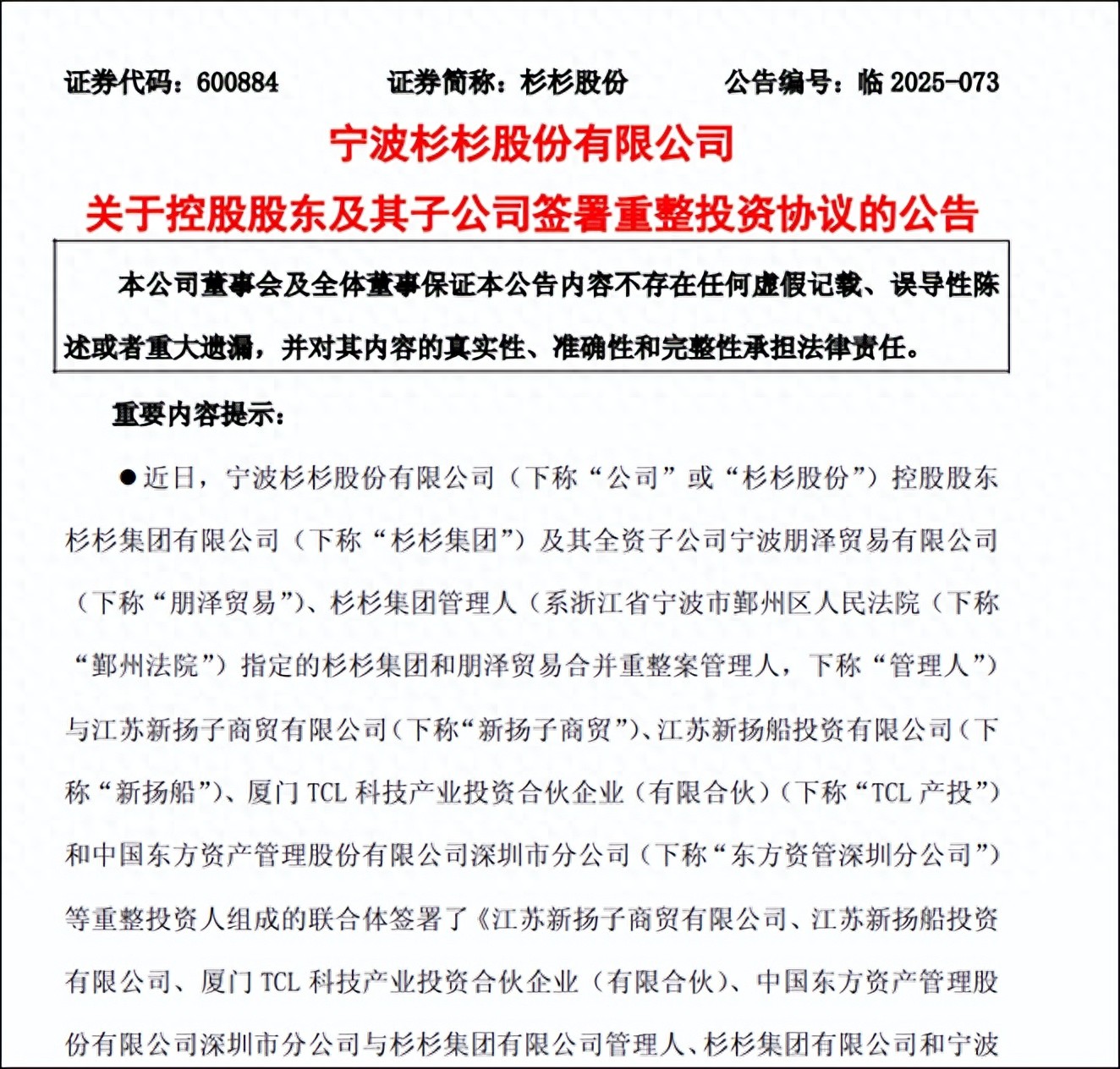 2025年2月,杉杉集团被裁定进入实质合并重整,郑氏家族对“杉杉系”的控制画上句号。
